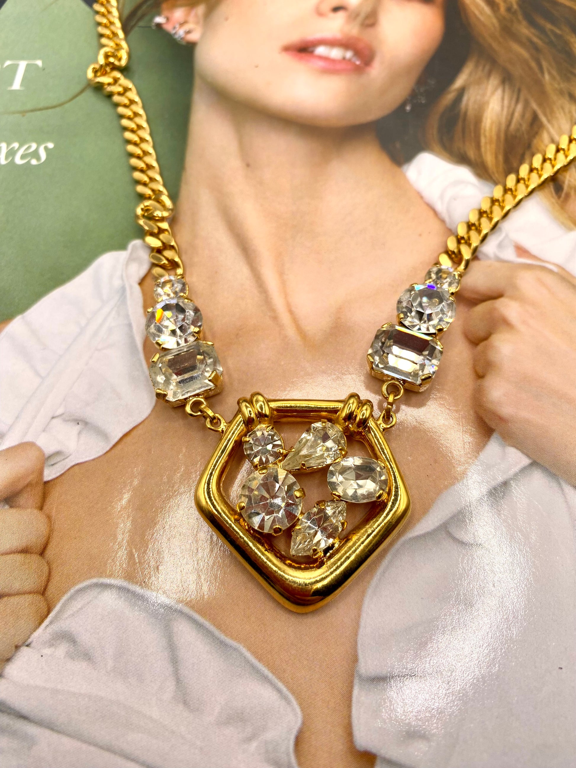 EN/ Gold-colored steel necklace from the 80s set with crystals. A sublime piece typical of the time, which revives an outfit.