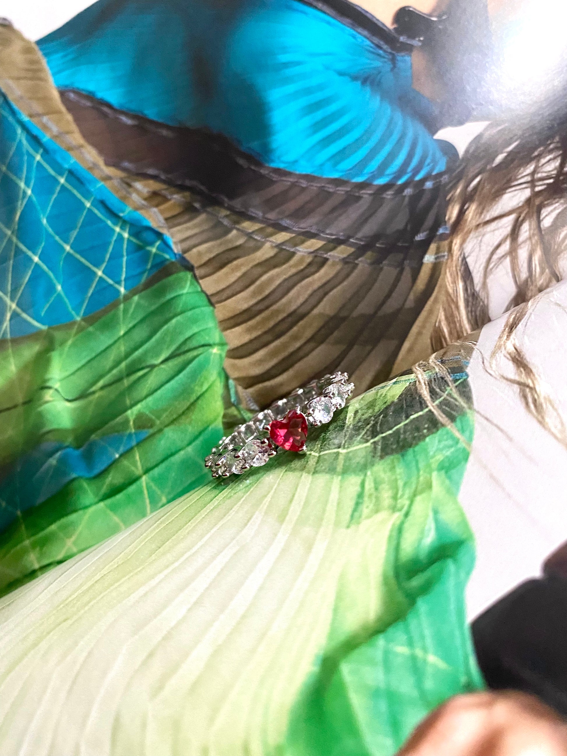 Bague en argent avec des petits cristaux blancs et un cristal rouge taillé en coeur.