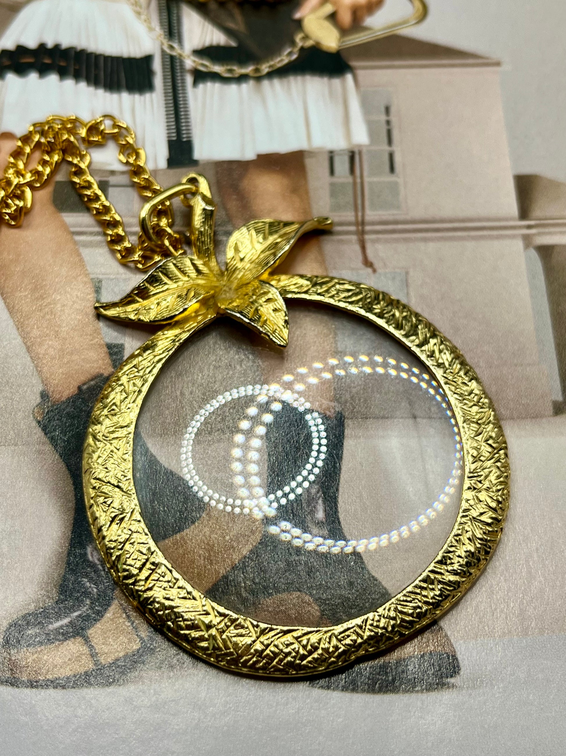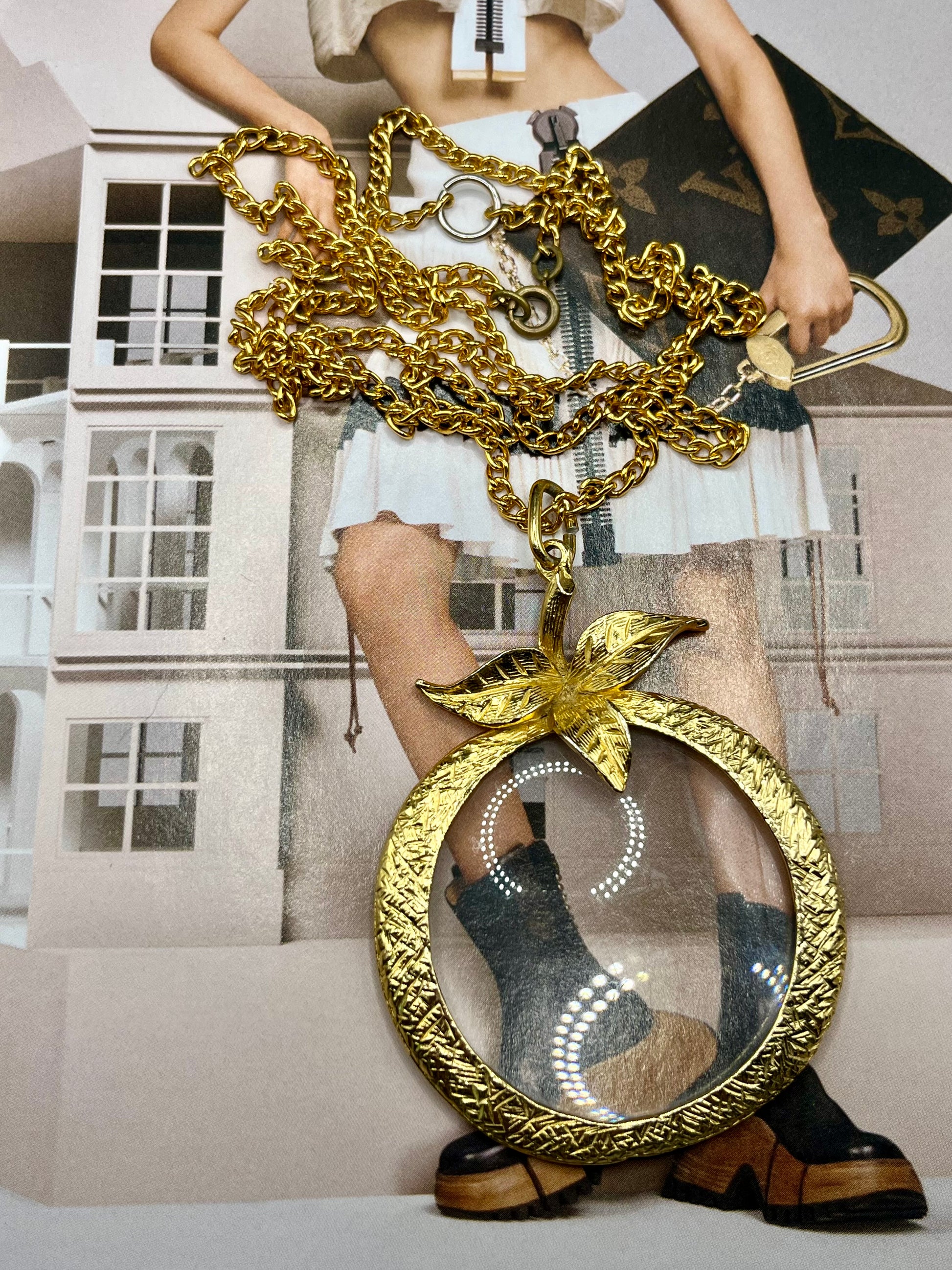 EN/ This gold-colored metal necklace has a pendant that can be used as a magnifying glass! The long chain can be worn in a double turn, or you have a small clasp that has been added to carry it a little shorter than the basic clasp.