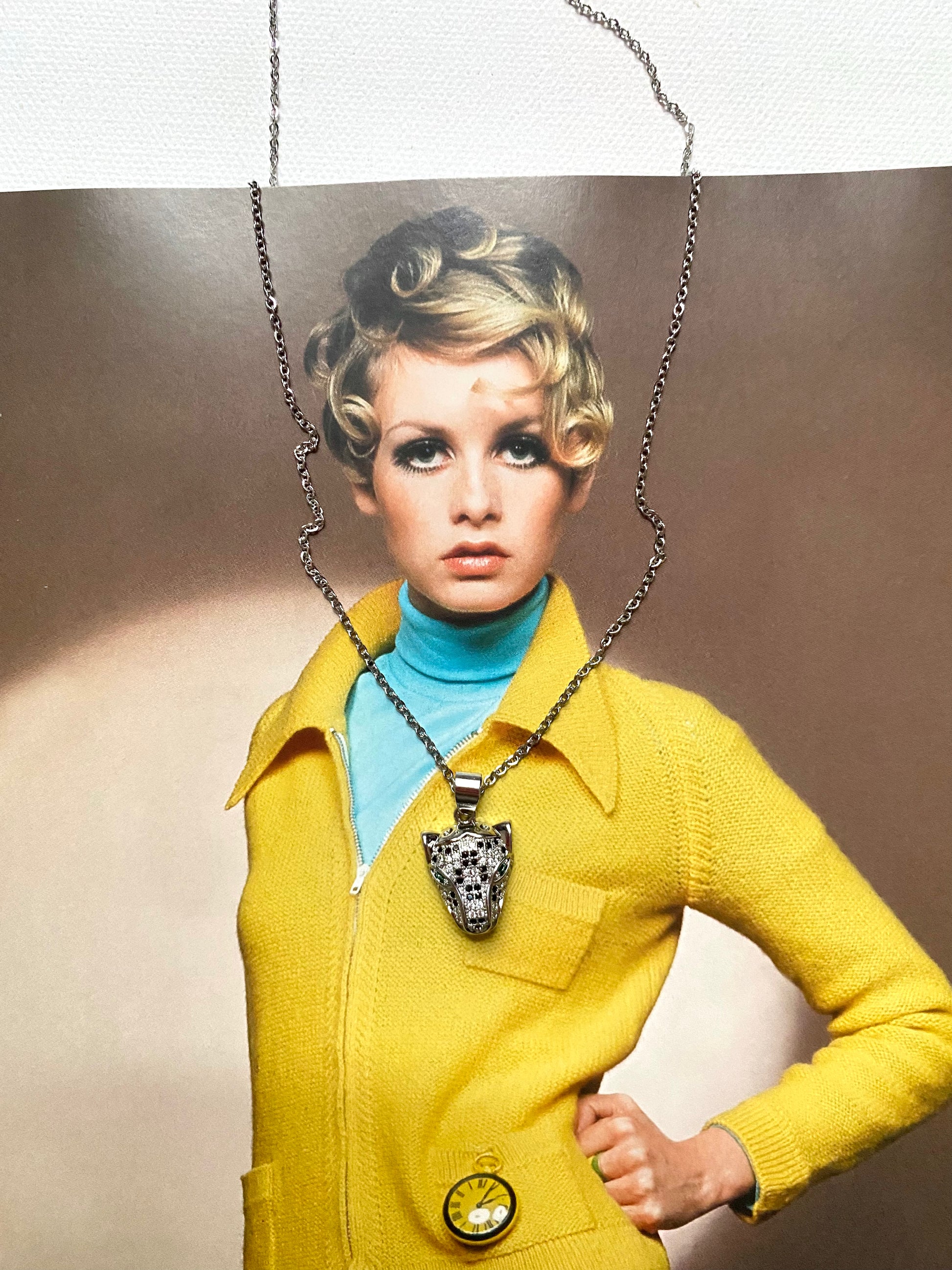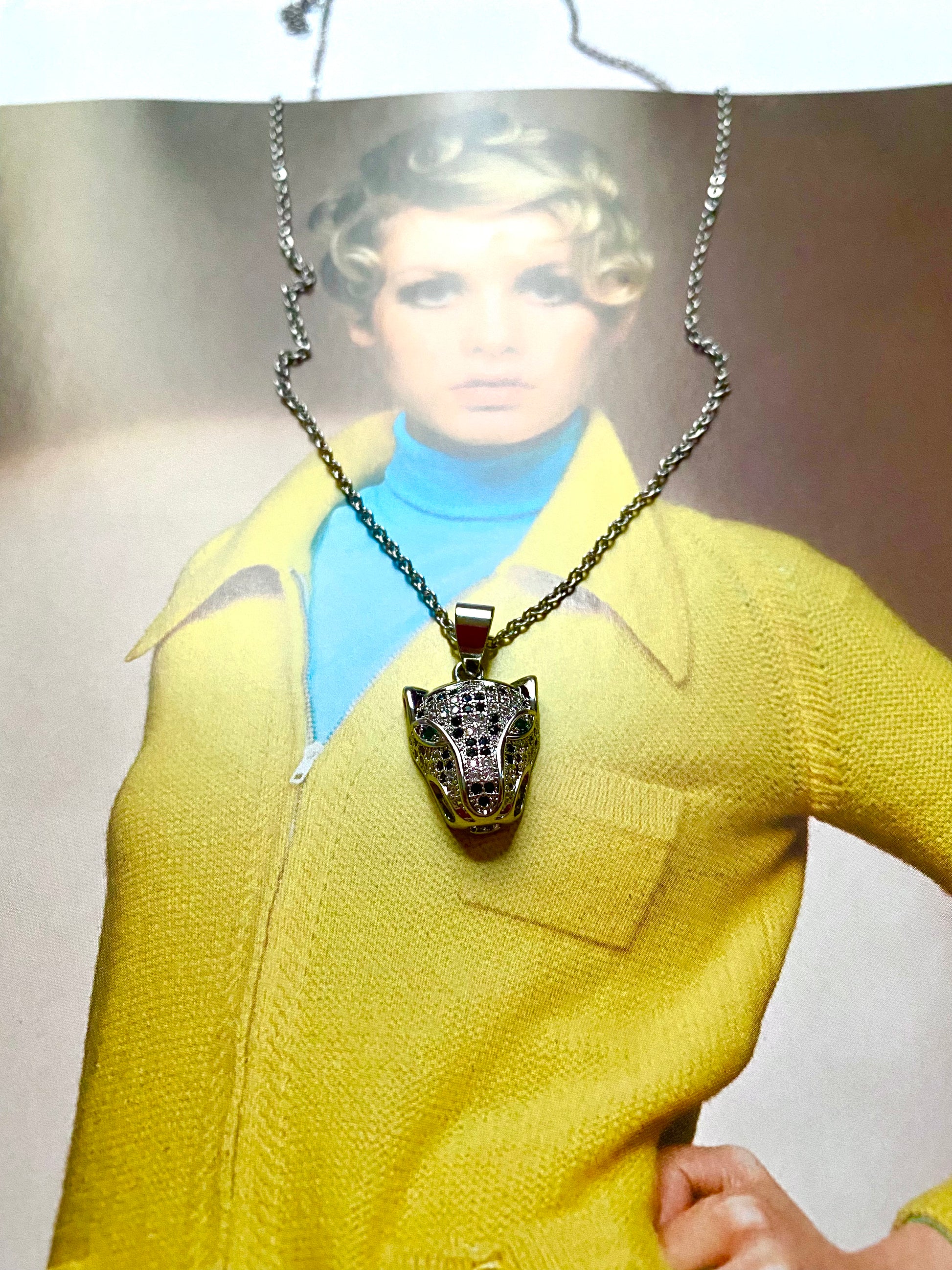 Collier en argent avec un pendentif tête de panthère faites de petits zircons blancs, noirs et émeraudes.