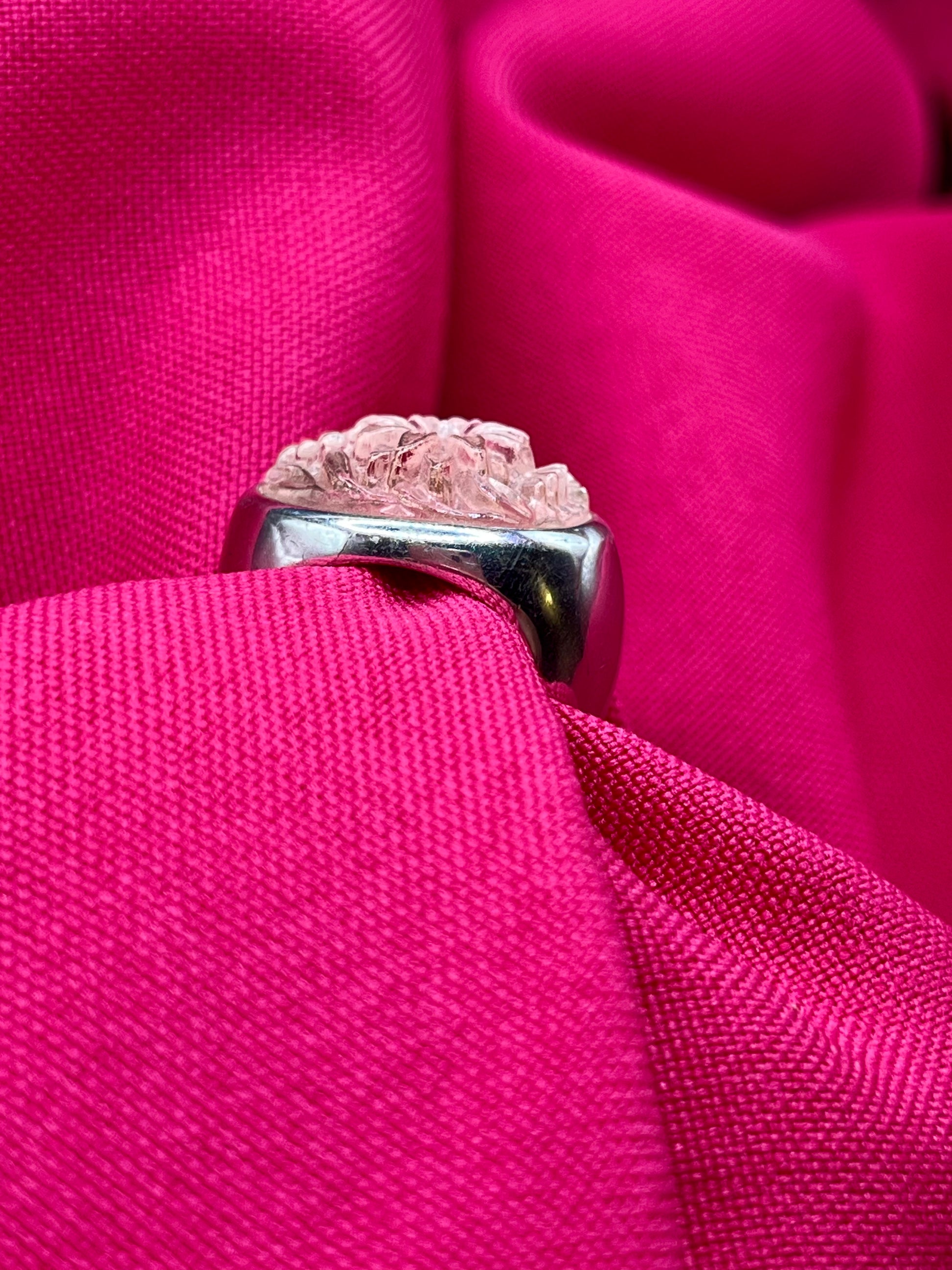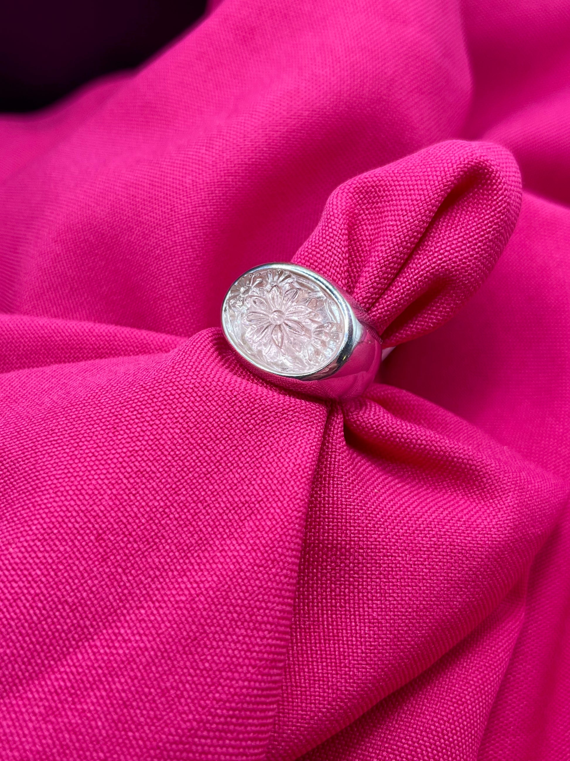 FR/ Cette bague signée Nina Ricci en argent 925 est très originale. Son anneau large contraste parfaitement avec sa résine en 3D, gravée de fleurs et d’un rose très clair, presque transparent. Une pièce statement et romantique, à l’image de la marque.