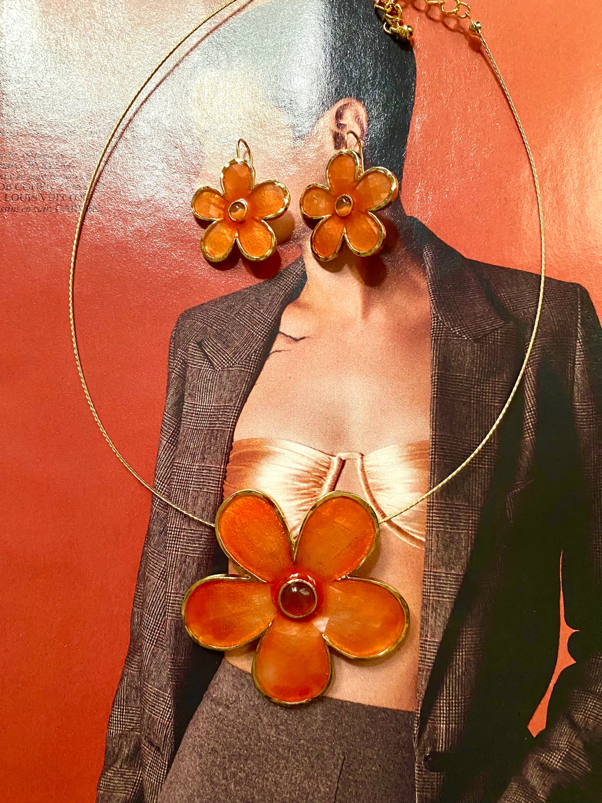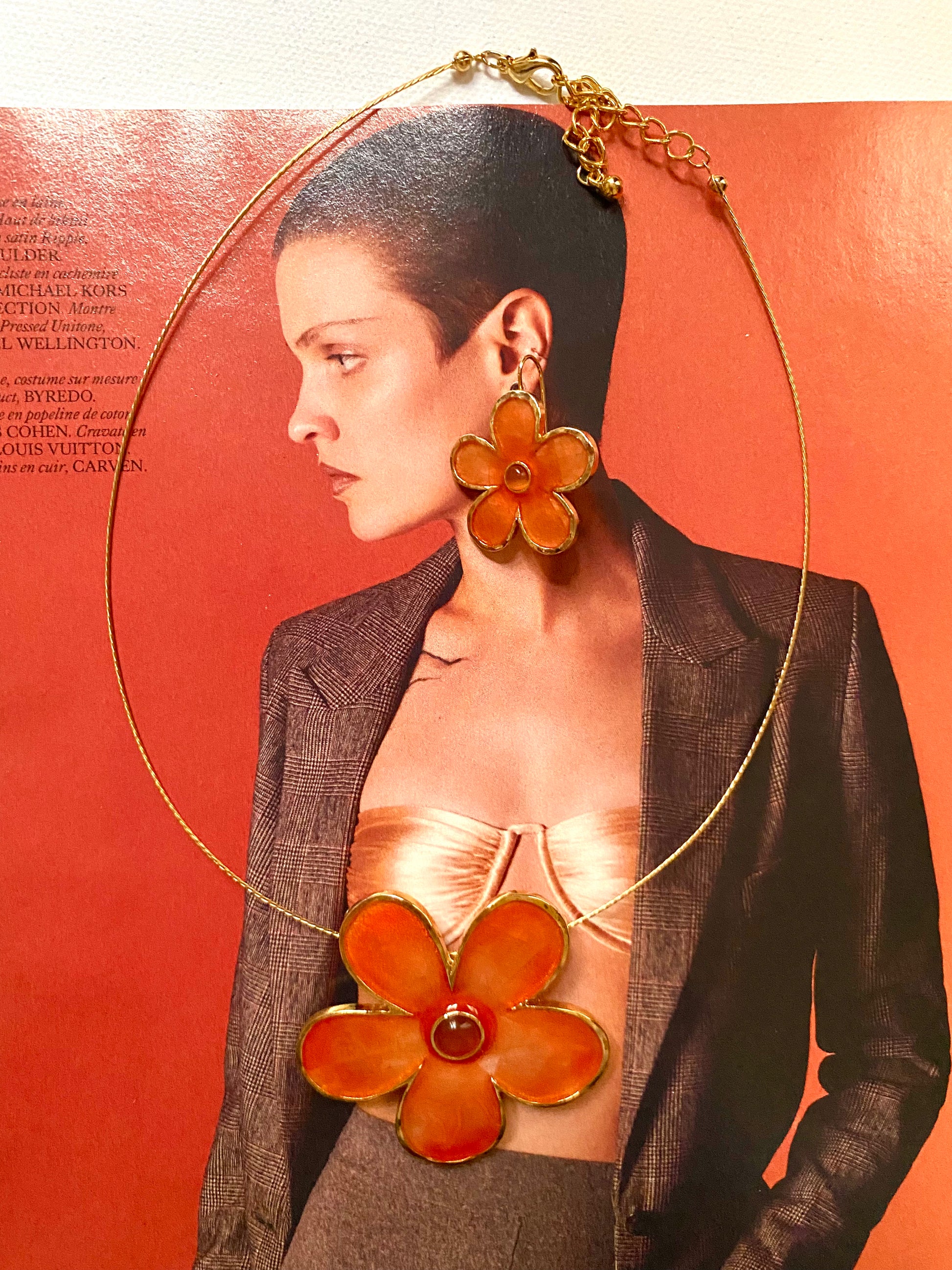 FR/ Parure vintage des années 90 fleurs oranges constitué d’une paire de boucle d’oreille pour oreilles percées et d’un ras de cou en métal couleur or.