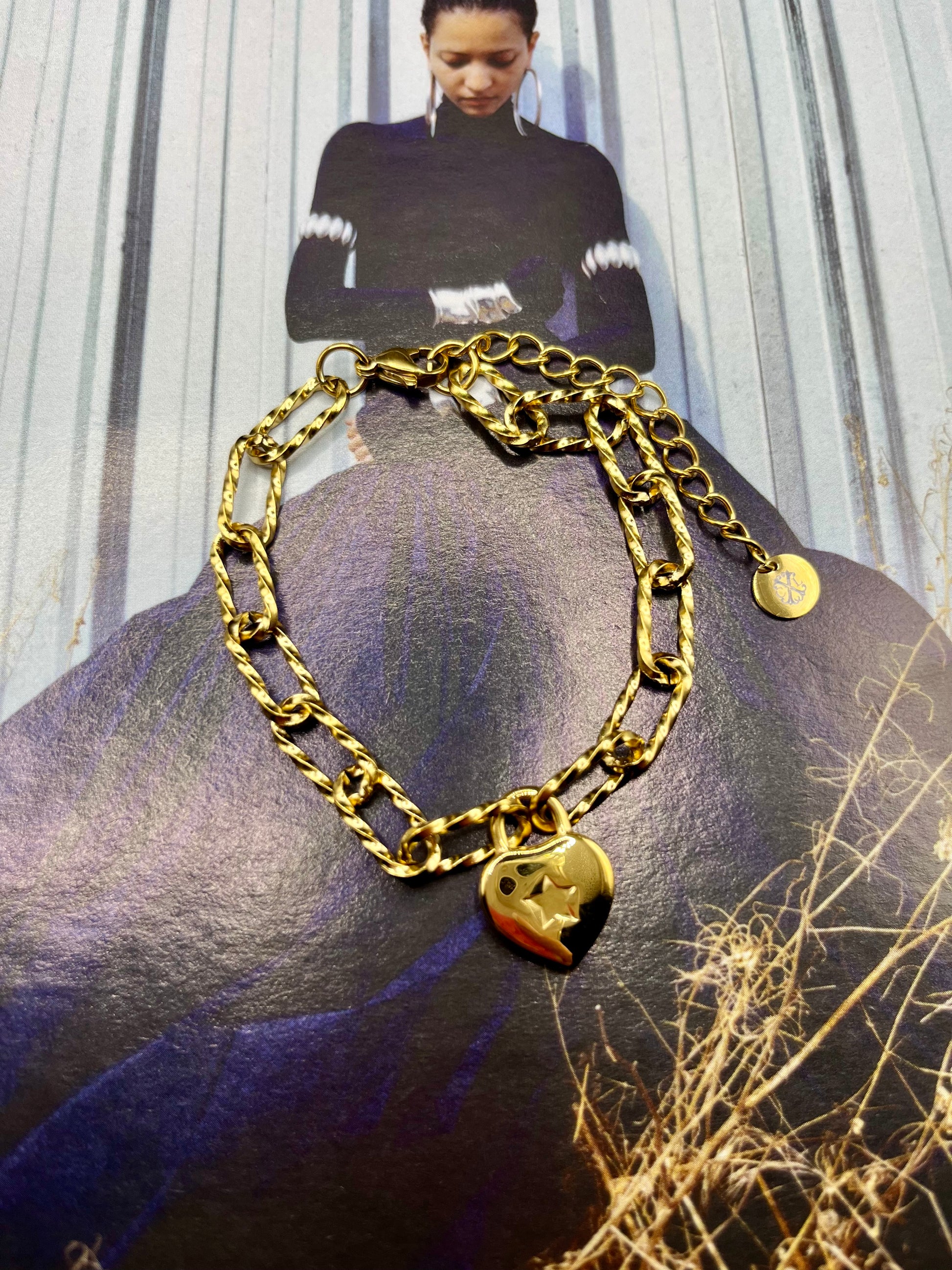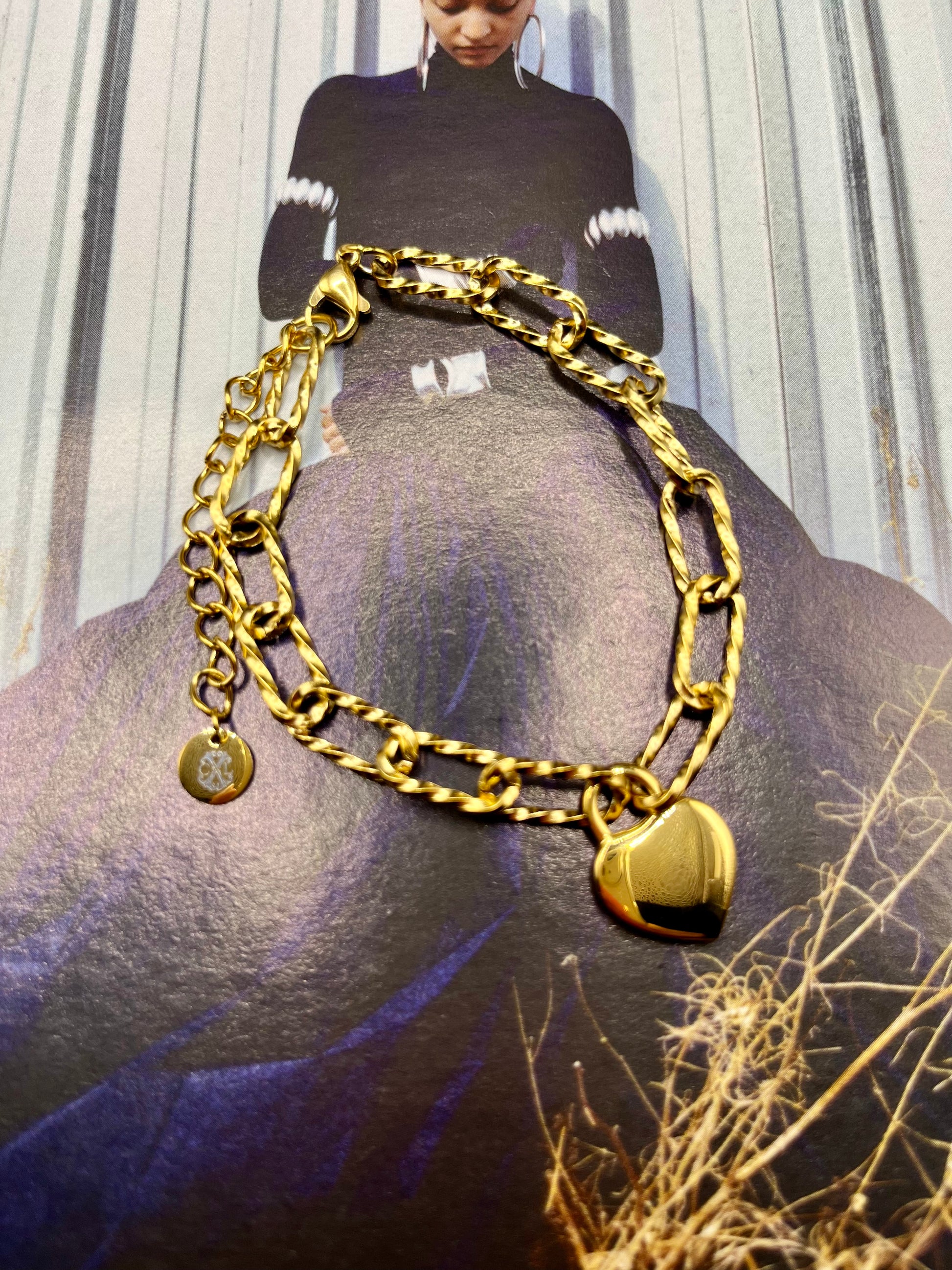 EN/ CxL bracelet by Christian Lacroix in gold-colored stainless steel that illuminates the wrist. An elegant and modern piece. Very light on the wrist, very comfortable to wear.