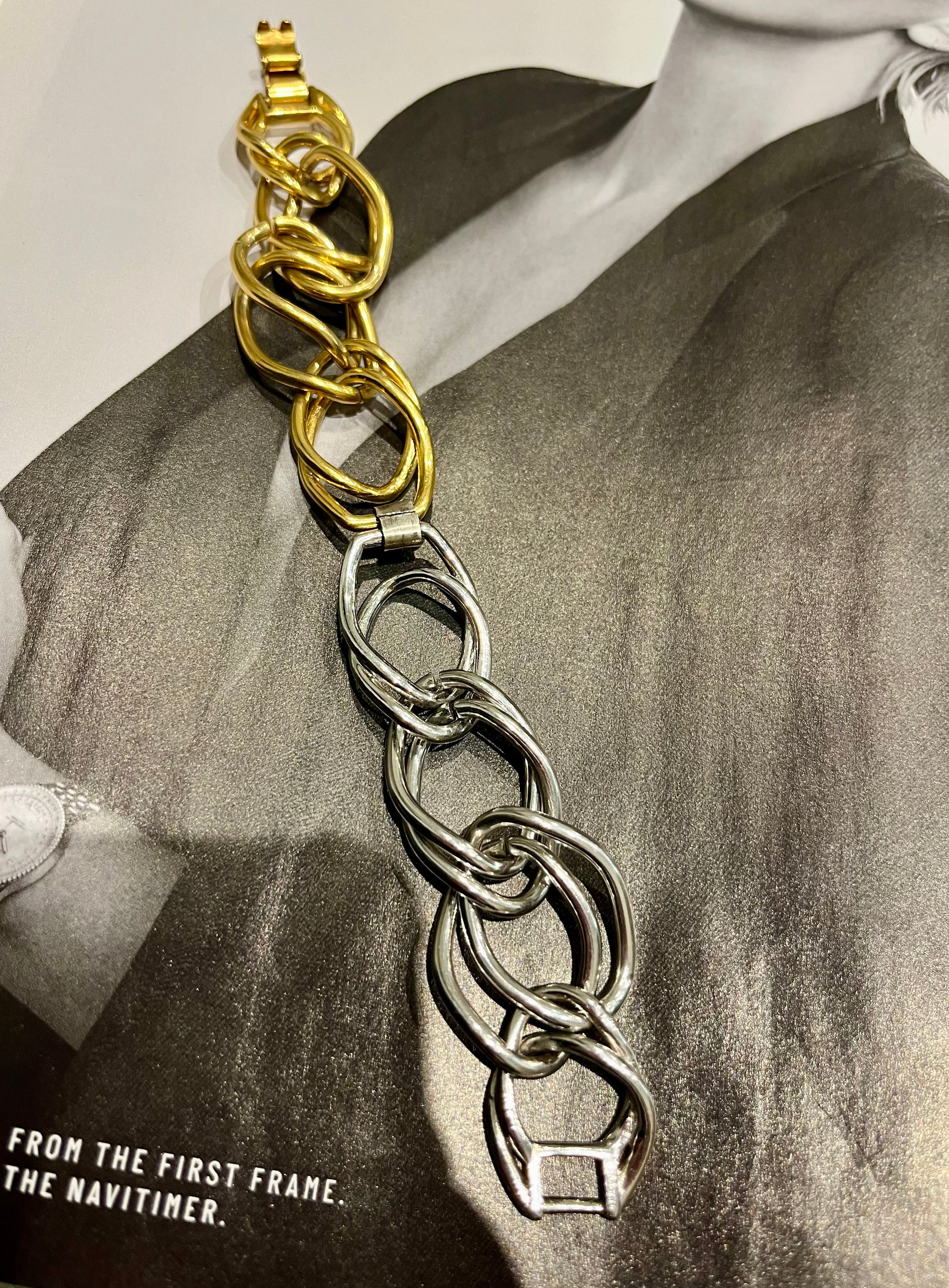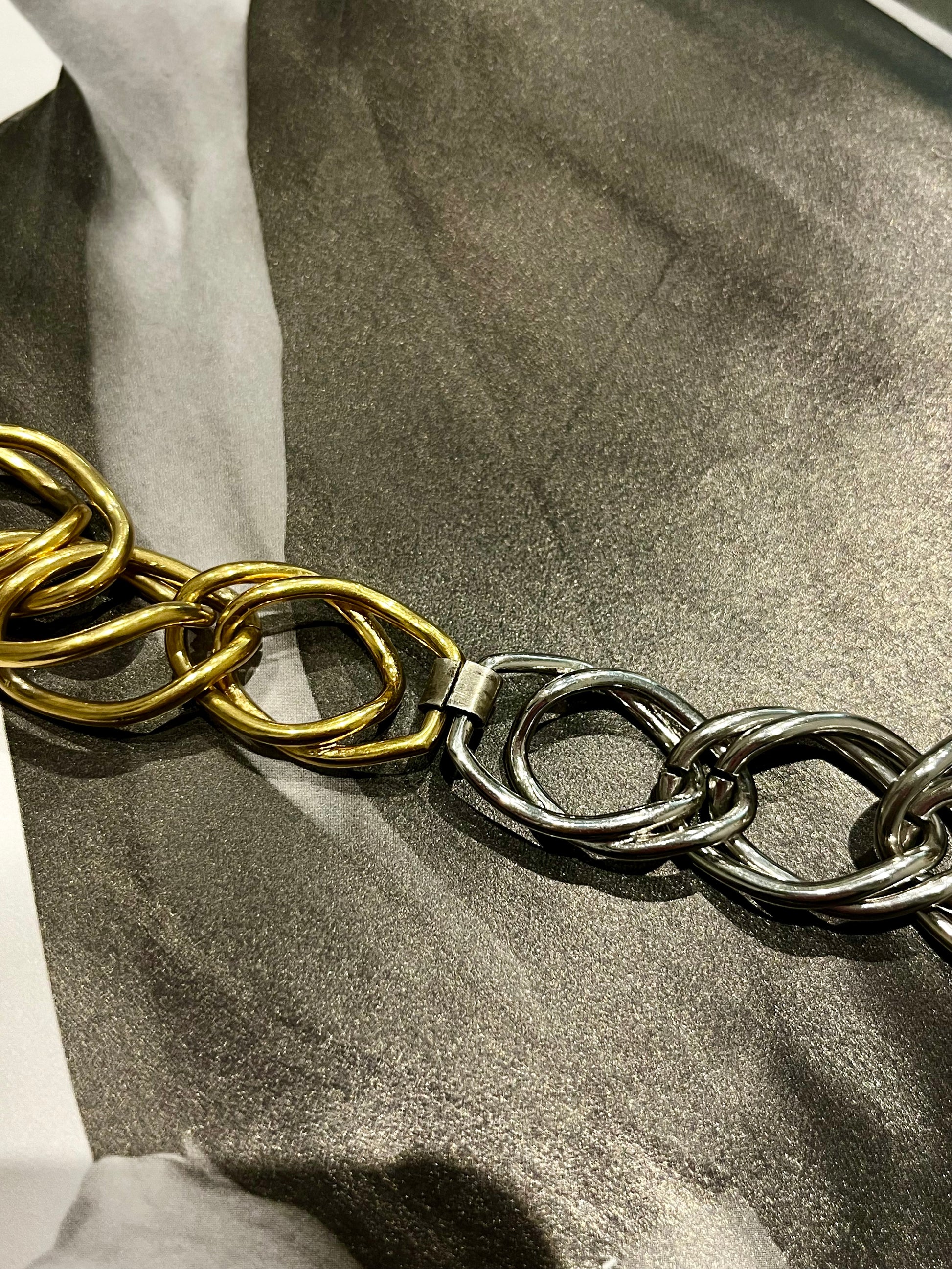 FR/ Bracelet des années 1980 signé Monet. Un modèle bi-colore très original. Il est très léger.