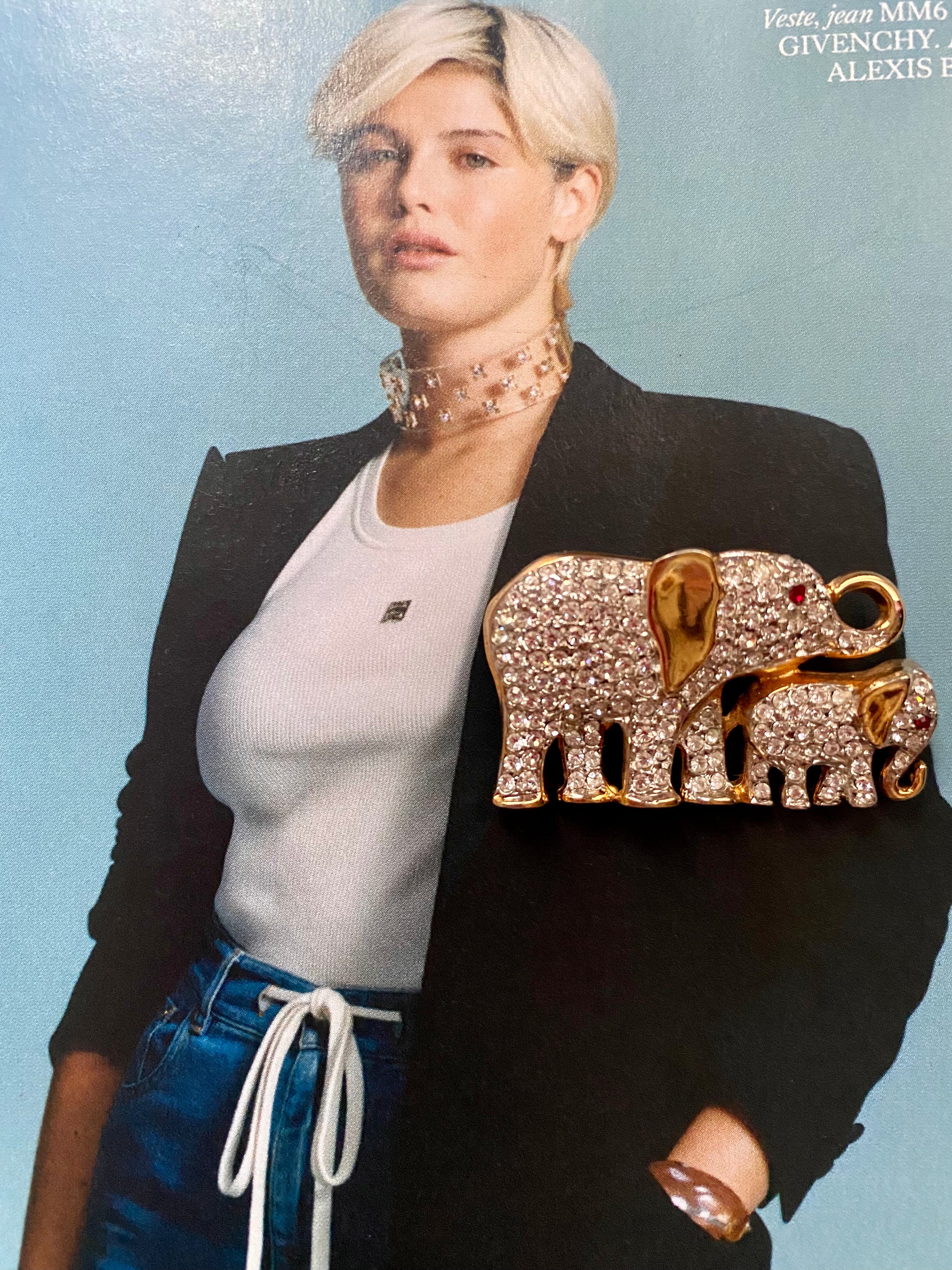 FR/ Broche plaqué or sertie de zirconiums et deux petits rubis. Elle est signée au dos. C’est une pièce affirmé sublime et unique. Je conseille de la porter aussi en pendentif avec une jolie chaîne.