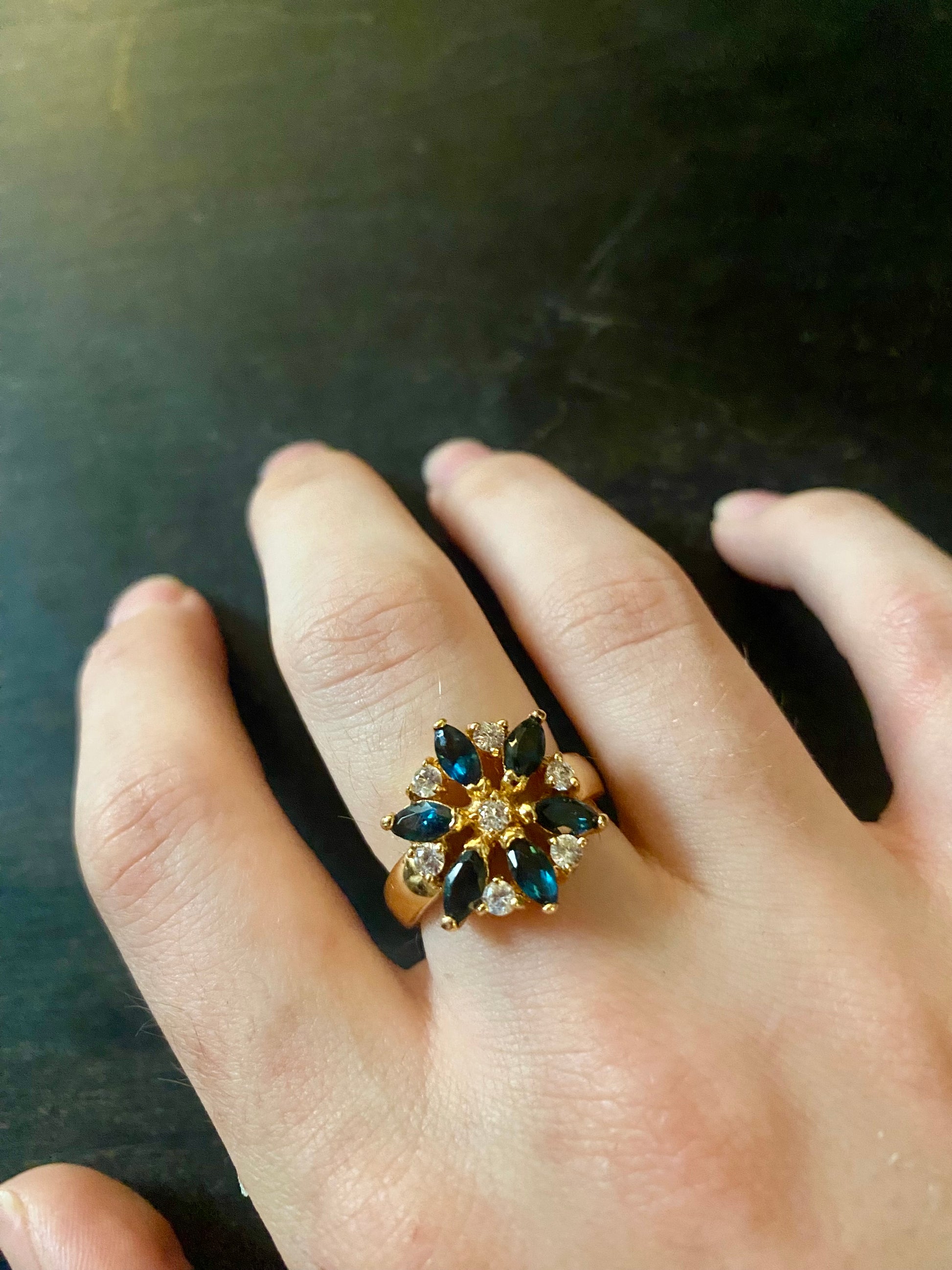 FR/ Élégante bague en plaqué or avec une jolie forme qui fait penser à un flocon de neige. Elle est sertie de zirconiums et de sublimes cristaux bleu foncés.