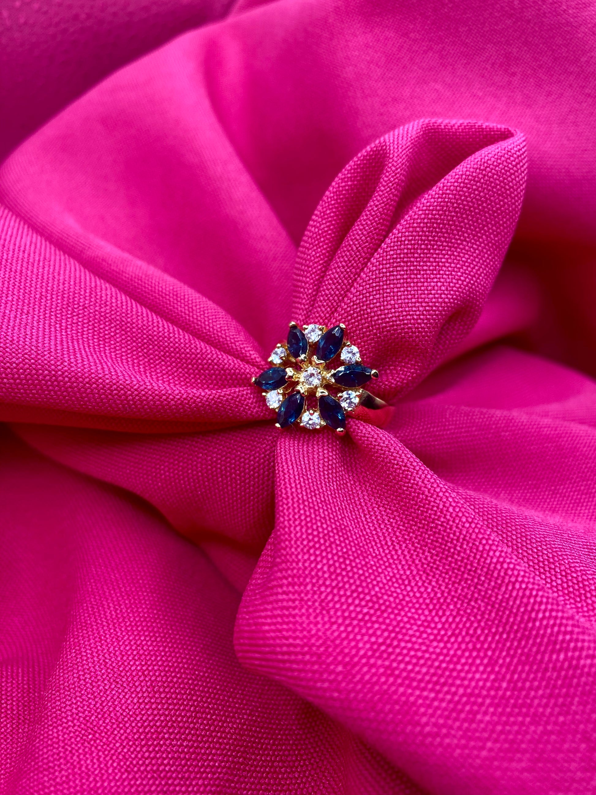 EN/ Elegant gold-plated ring with a pretty shape reminiscent of a snowflake. It is set with zirconium and sublime dark blue crystals.