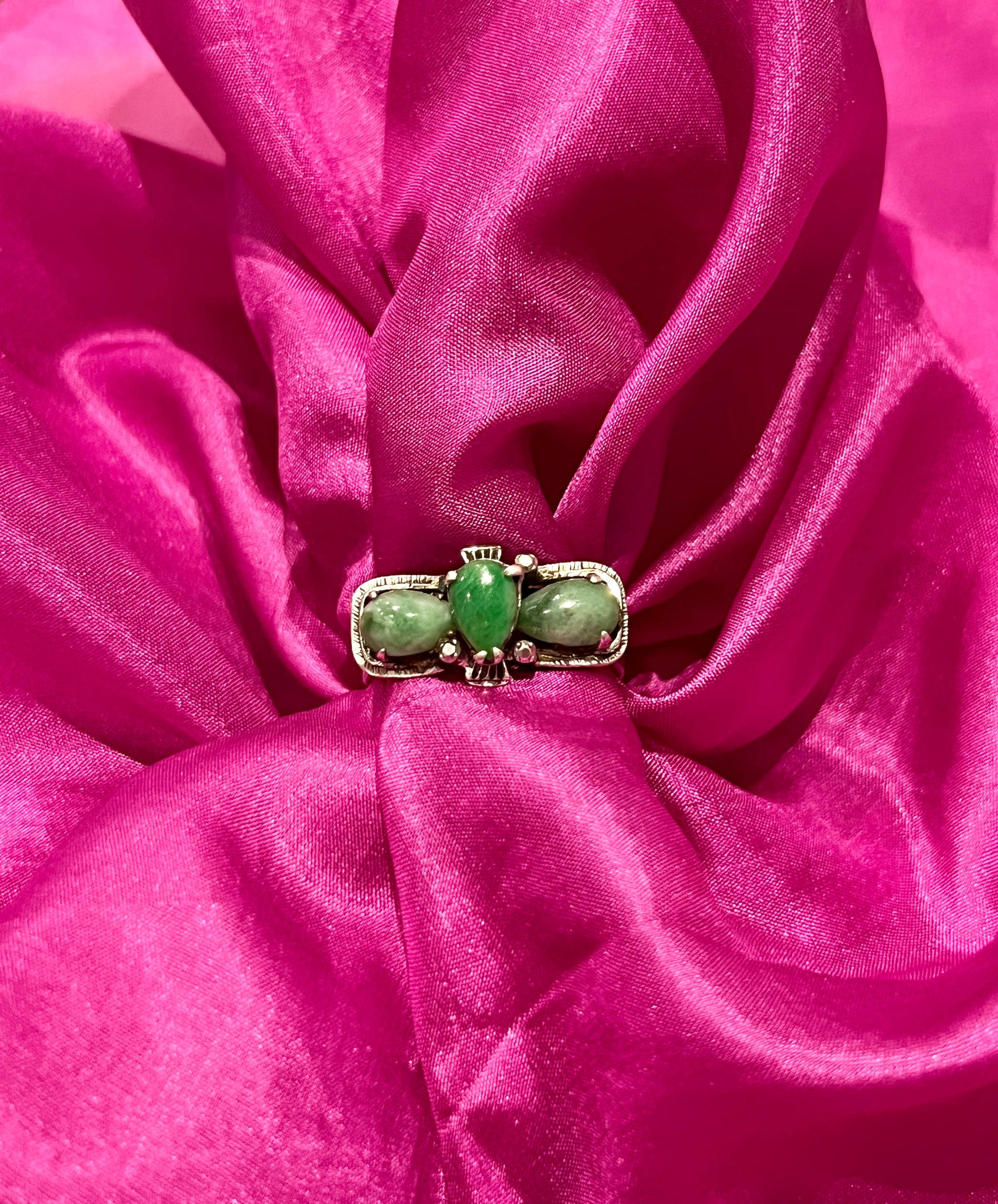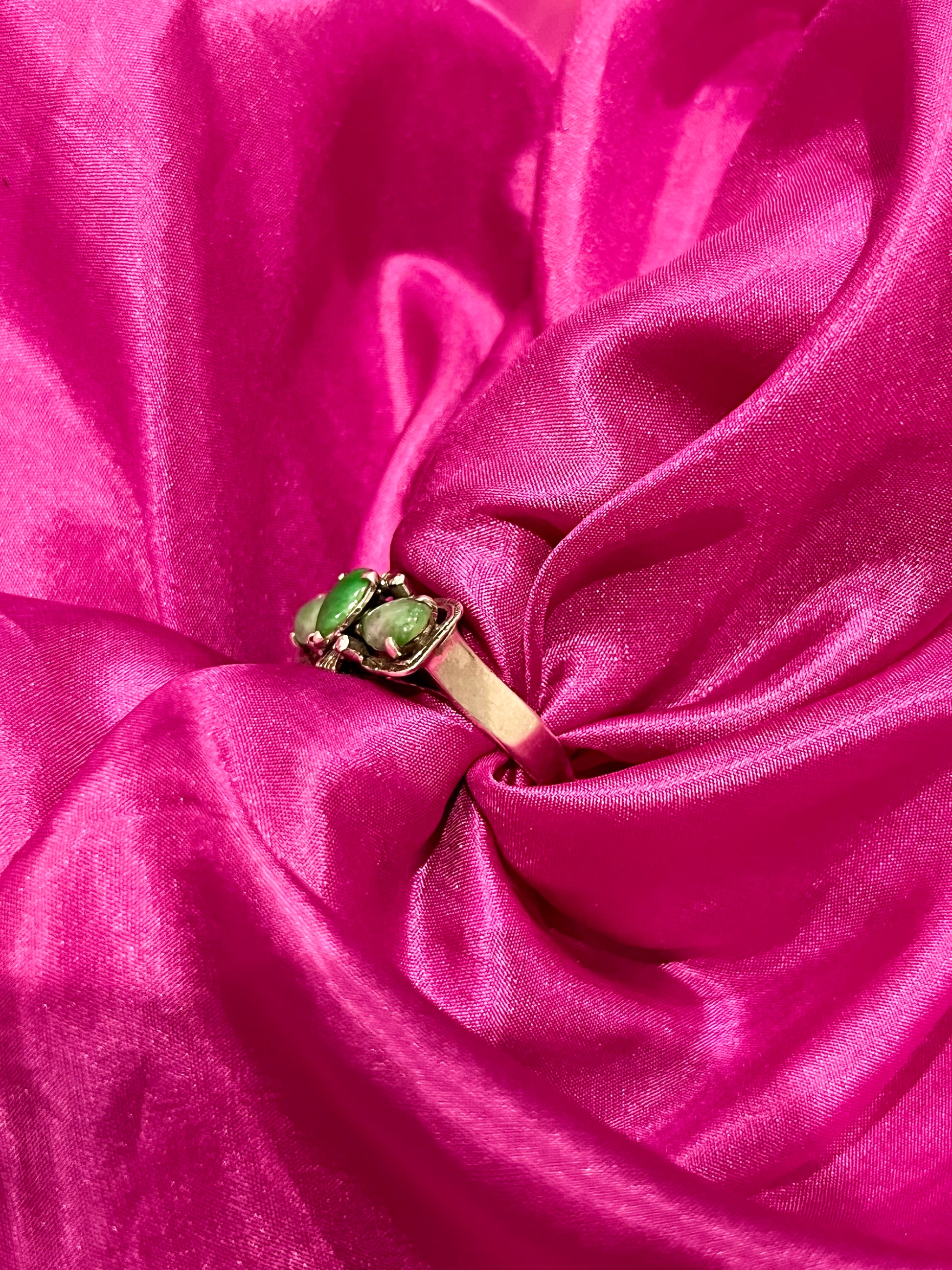 FR/ Rare pièce des années 1940 en argent 925 et trois jolies Jade vertes. Un beau modèle ancien, aussi élégant qu’avec un certain caractère.