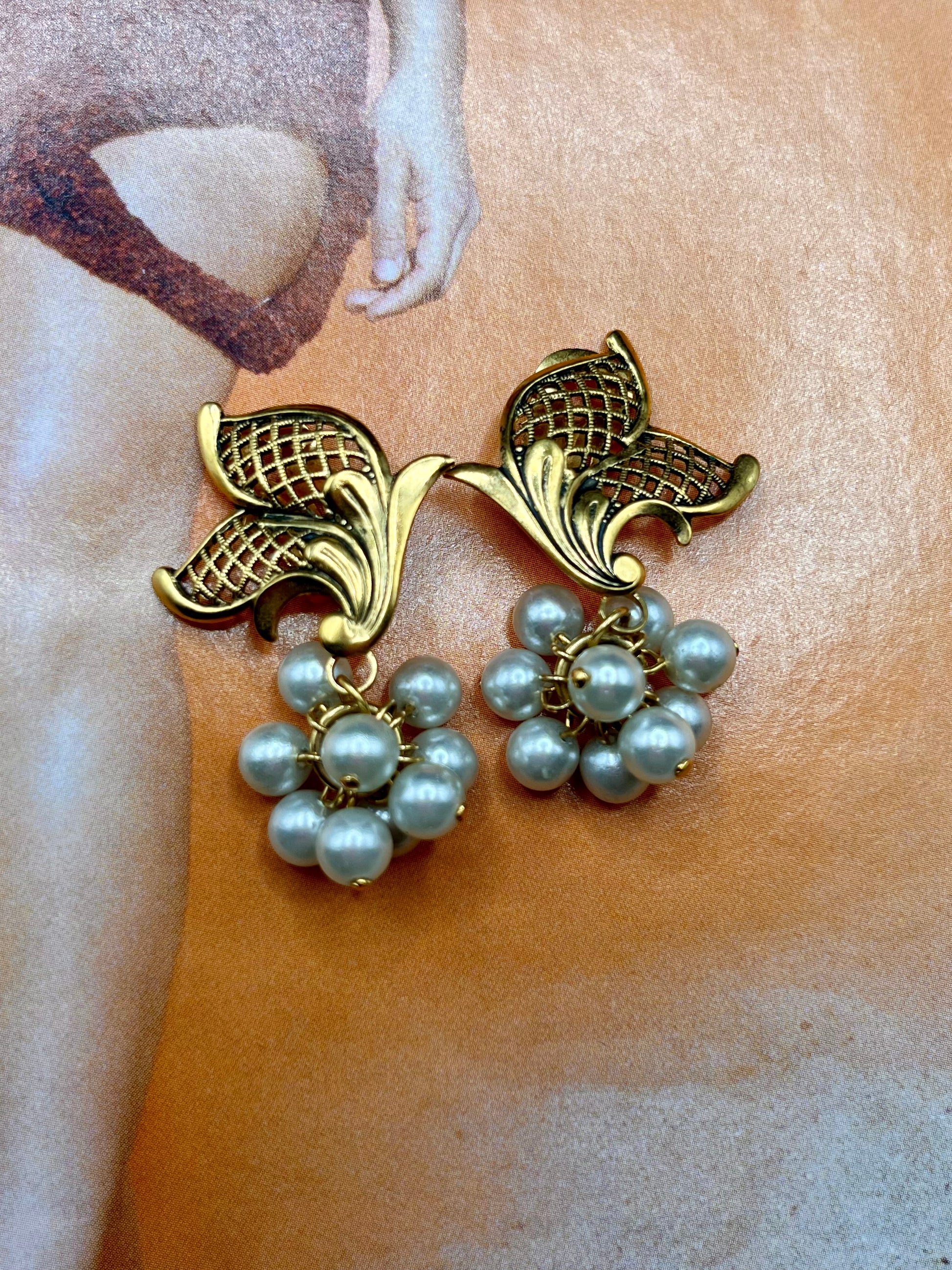 FR/ Sublime paire de clips des années 50. Les détails et la délicatesse de la monture est dingue. Les perles pendantes qui suivent le mouvement de la tête rajoute un côté fun et adorable à cette pièce.