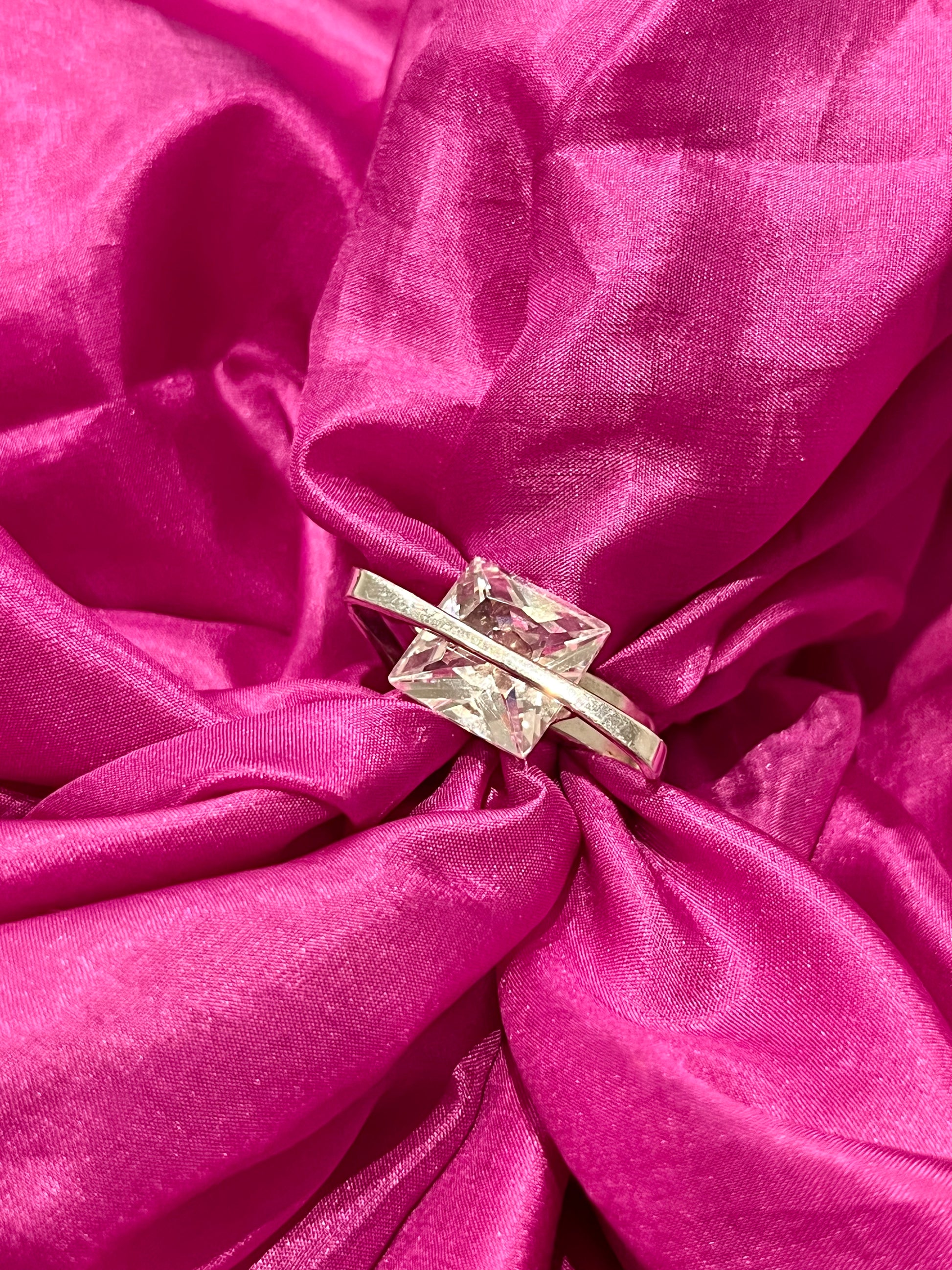 Sublime bague en argent 925 possédant un deuxième poinçon qui est un poinçon de garantie d’un atelier français. Une pièce forte avec une forme peu conforme et rarement trouvé en bijouterie. Un très joli cristal y est incrusté.