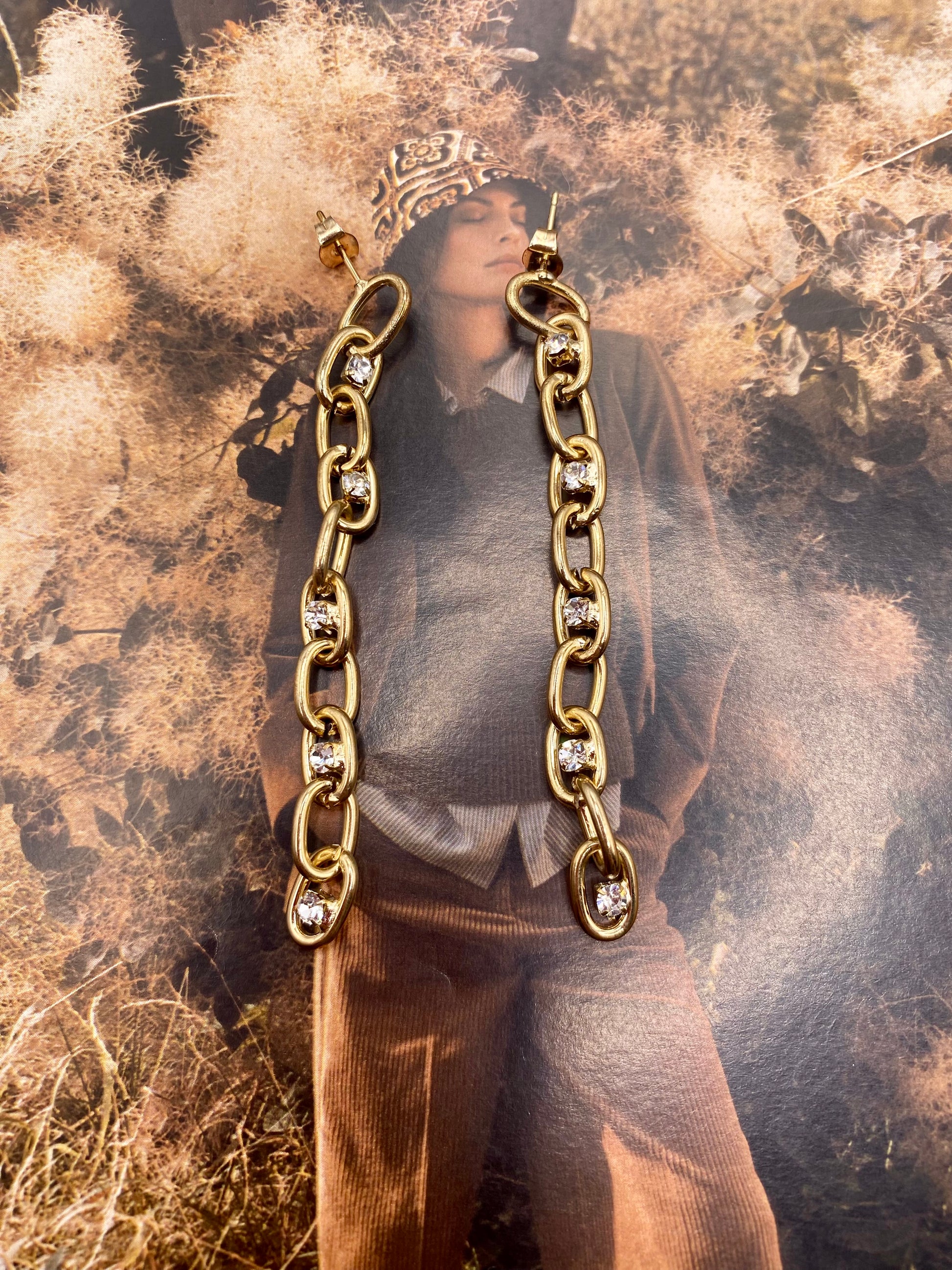 Pendantes acier couleur or parsemées de strass, à la fois élégante et parfaite pour relever un look casual. Très légères, elles sont très agréables à porter.