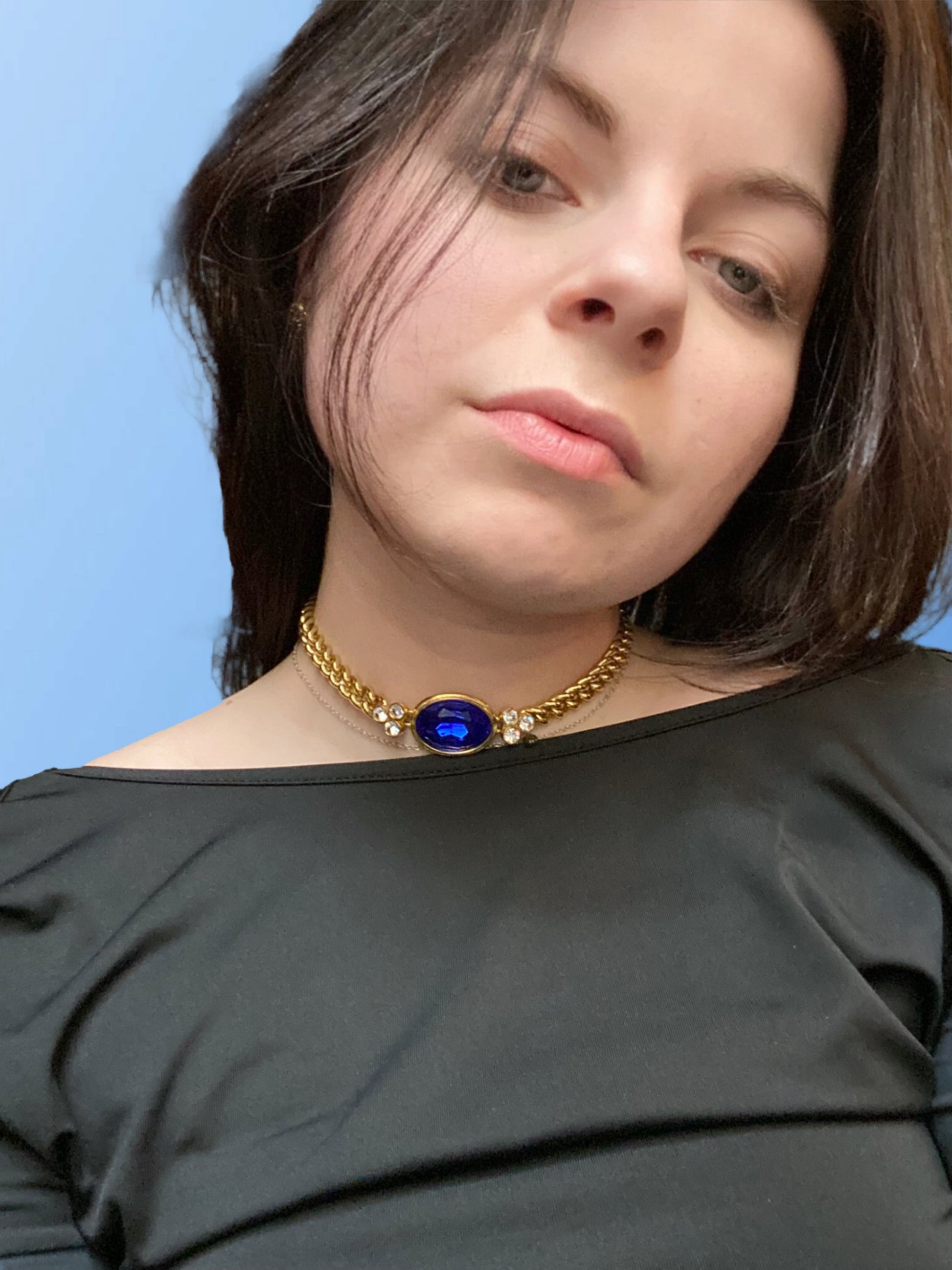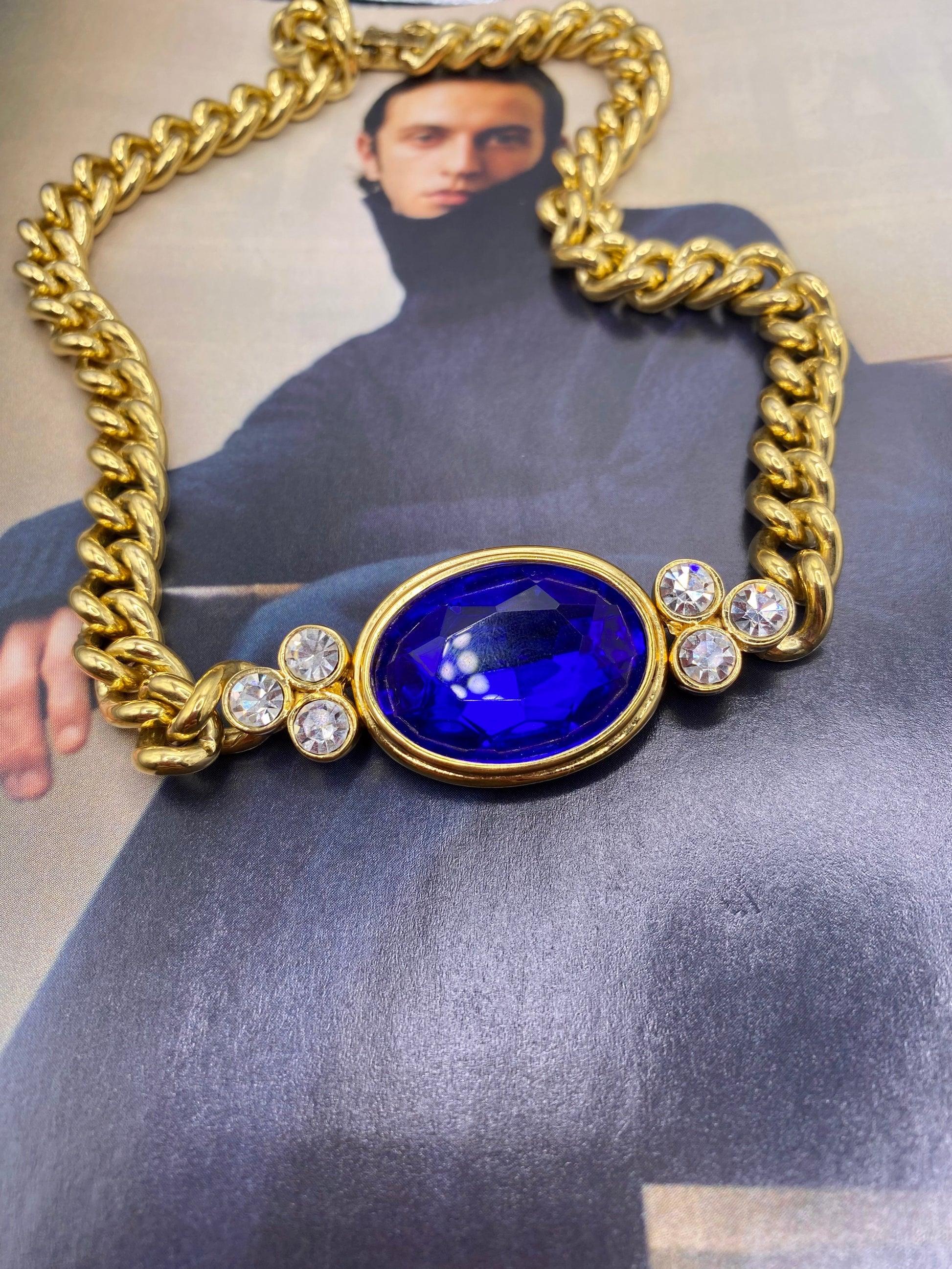 EN/ This very beautiful piece from the 80s is a gold-colored steel chocker with white and blue crystals. A strong piece, which will revive every look.