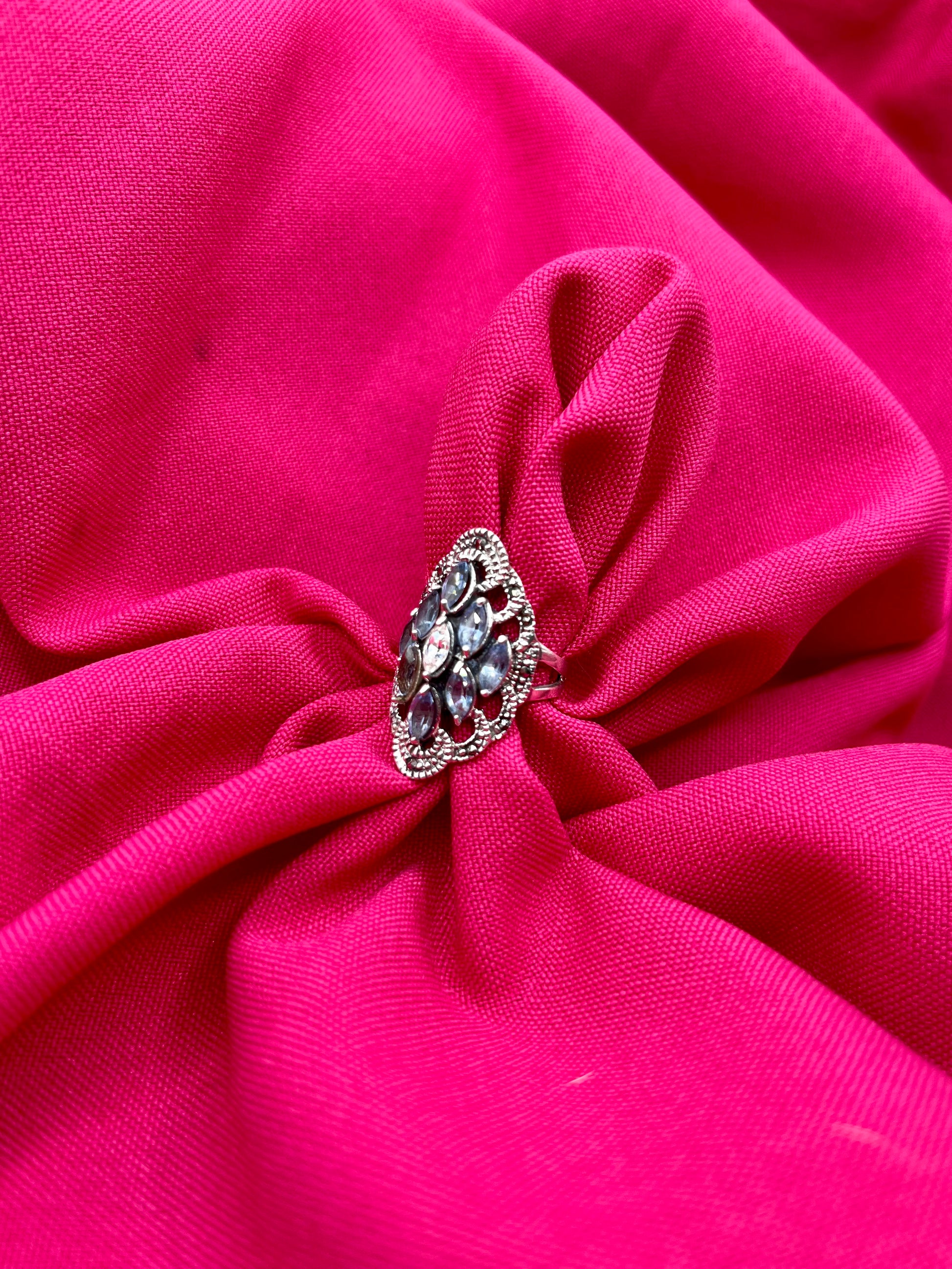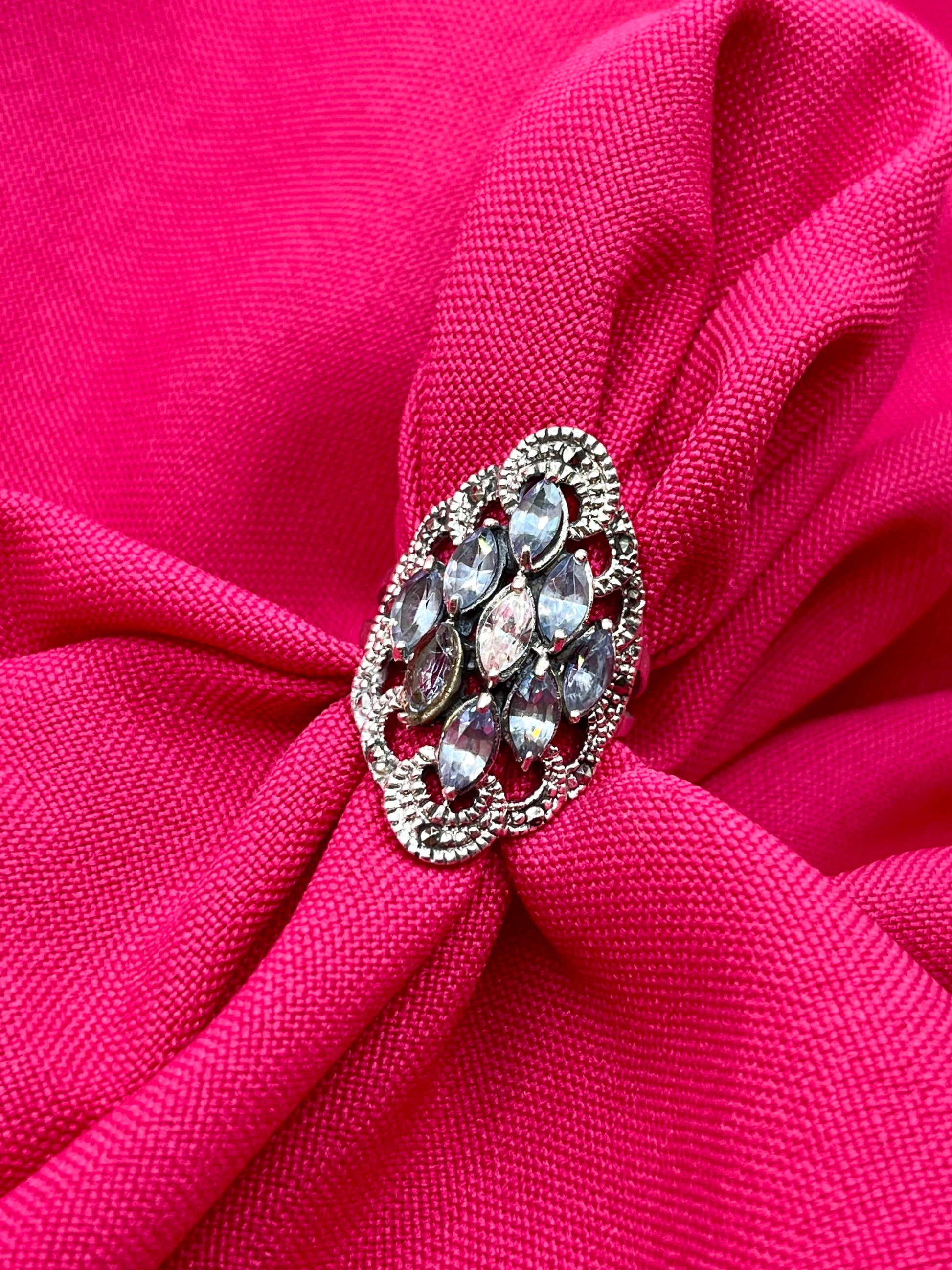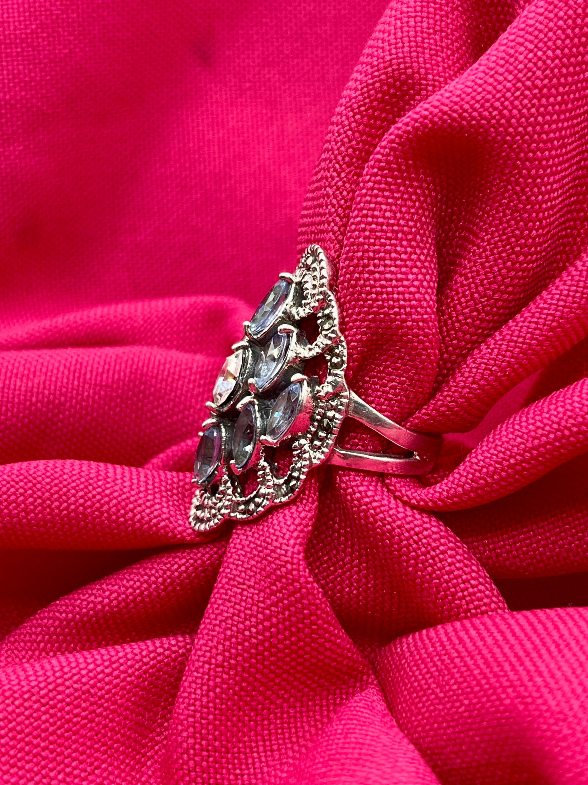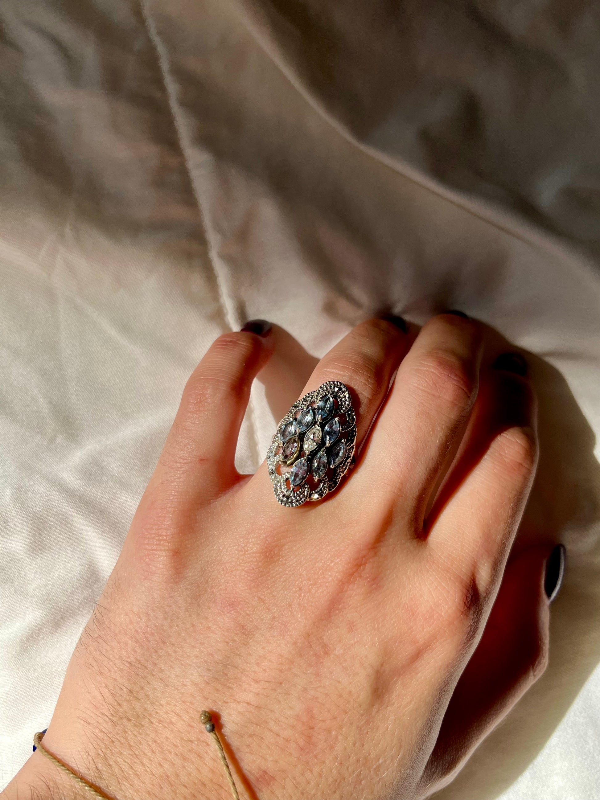 Bague art déco en argent 925 sertie de cristaux bleus, blanc et d’hématite. Une très belle pièce, délicate et lumineuse.