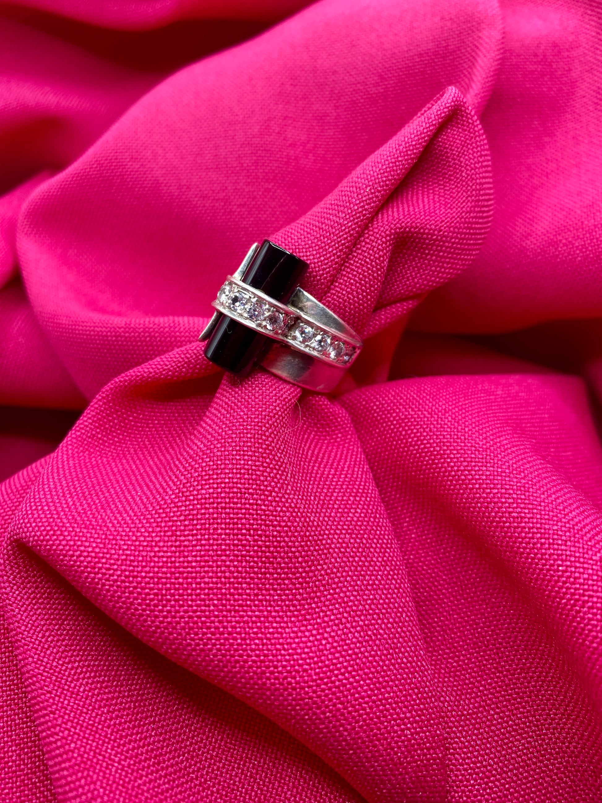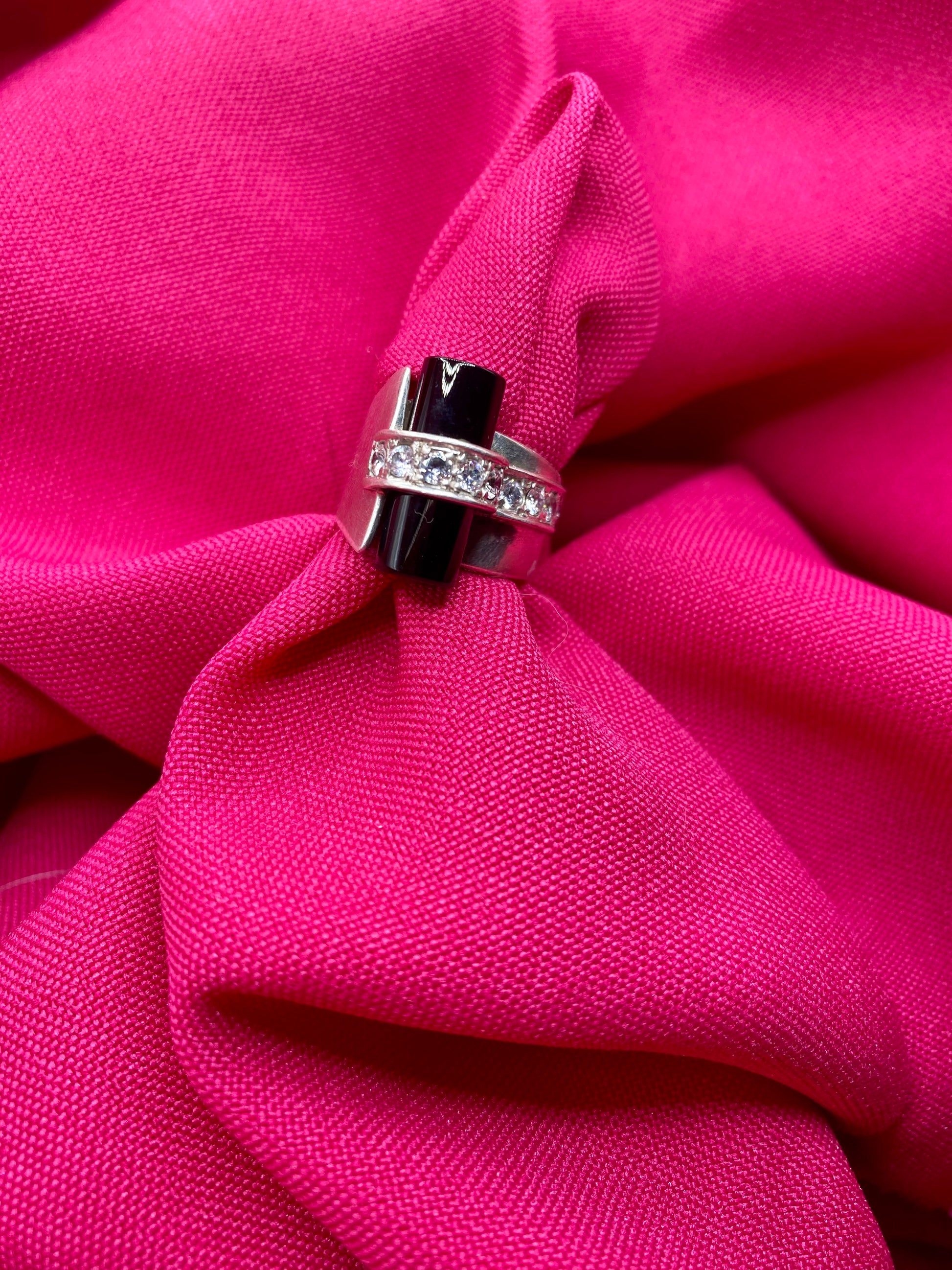 Bague art déco en argent 925 d’une forme exceptionnelle sublimée par des zirconiums et une résine toute lisse noire. Ce modèle est un véritable chef d’œuvre, à l’allure unique.