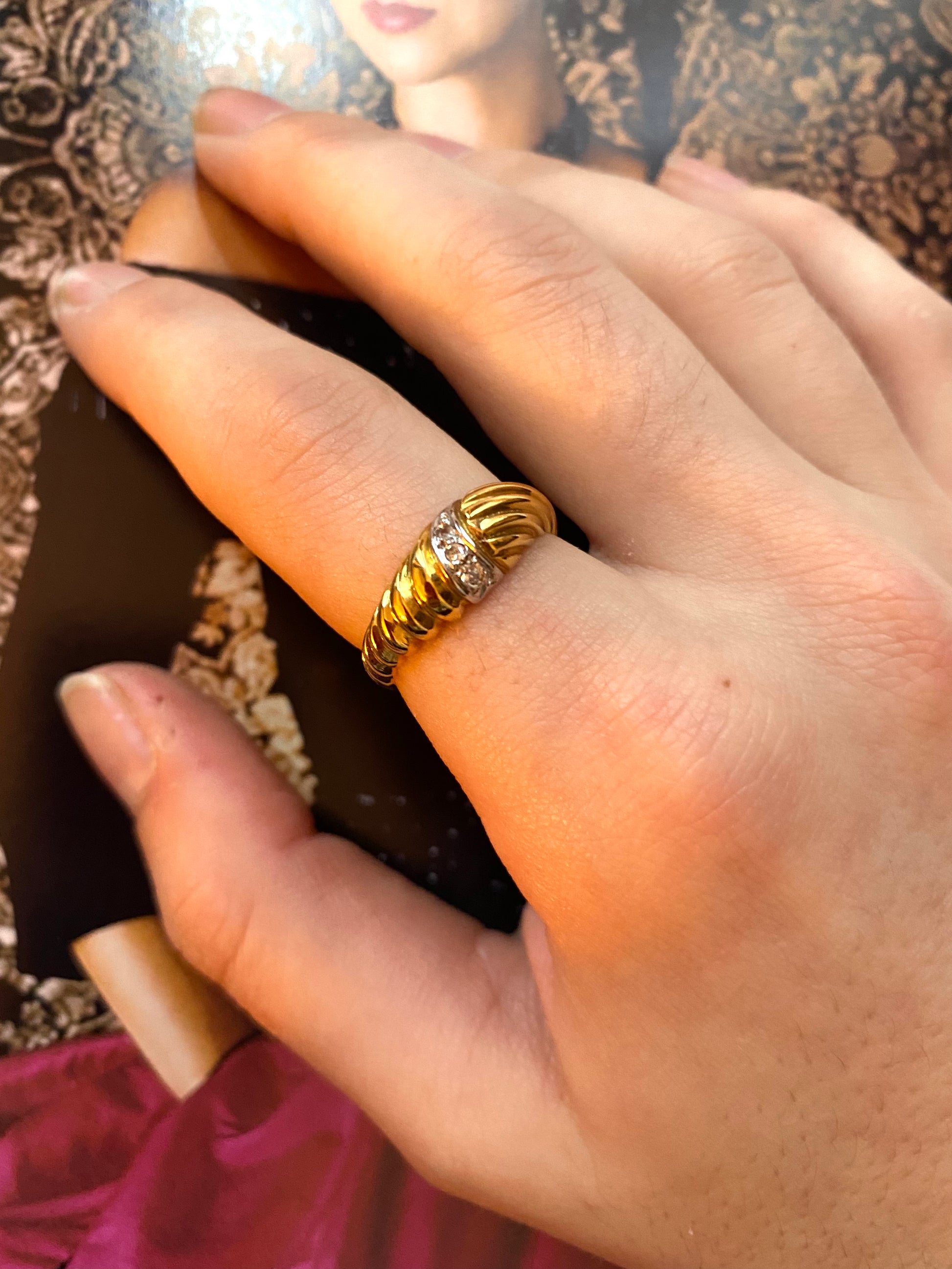 FR/ Bague anneau en plaqué or datant des années 80. Les zirconiums apportent une touche chic à l’anneau.
