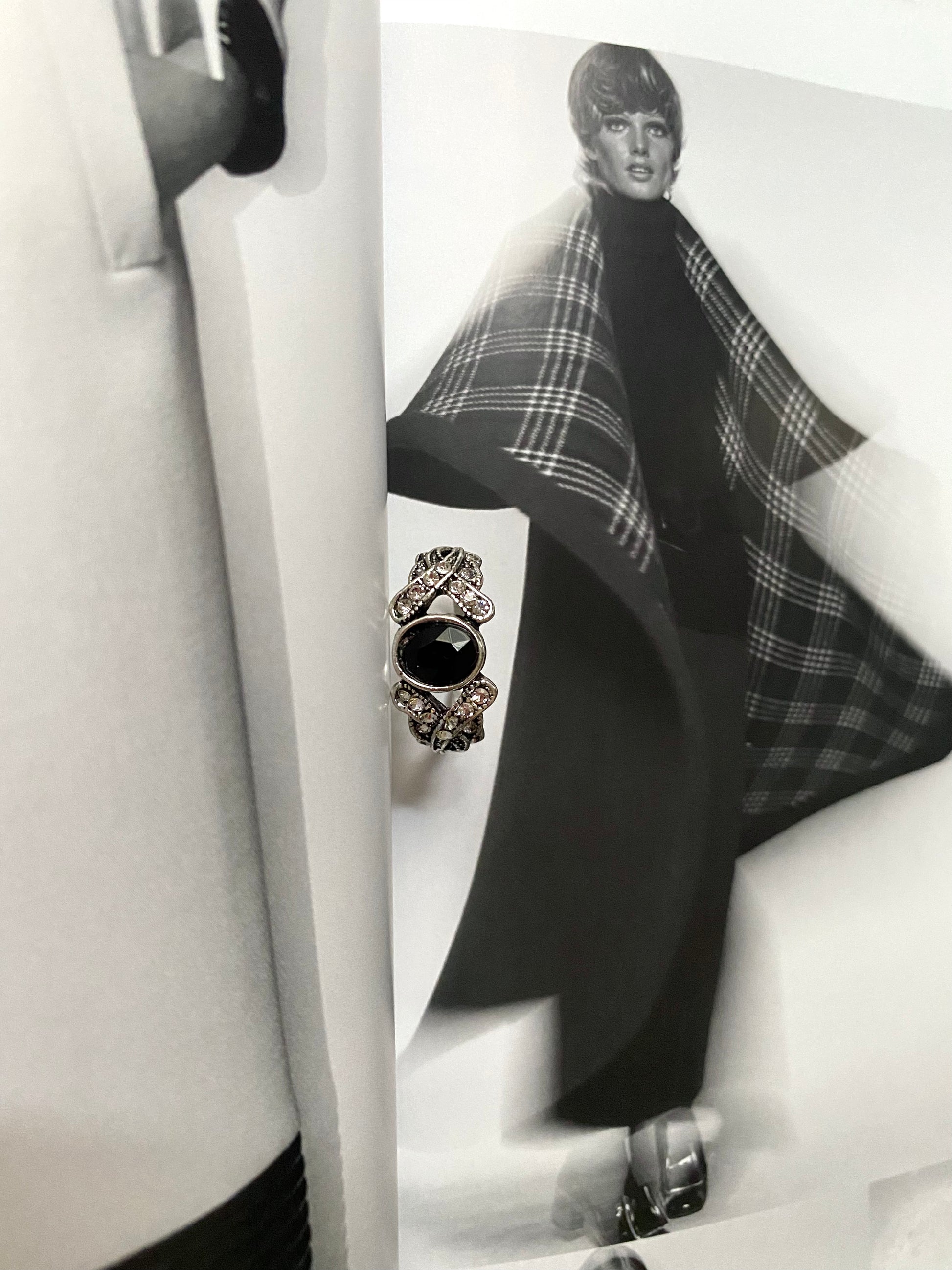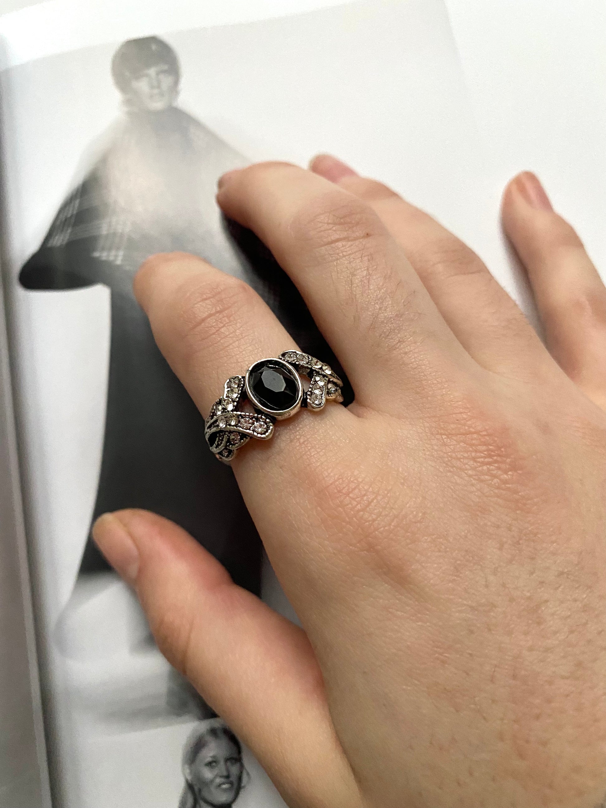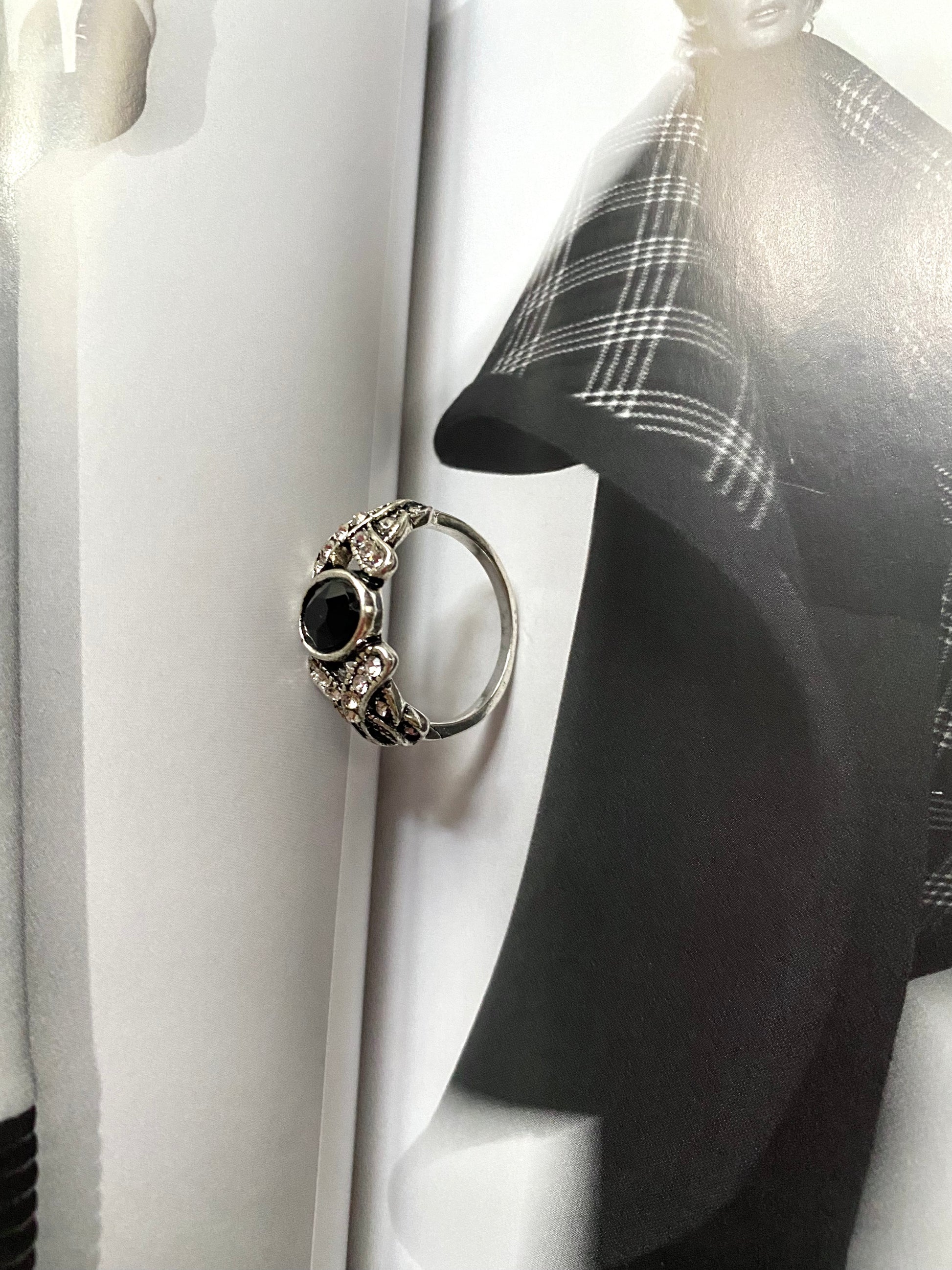 FR/ Bague des années 80 en argent, zircons et une jolie Onyx. C’est une pièce délicate avec une très jolie monture.