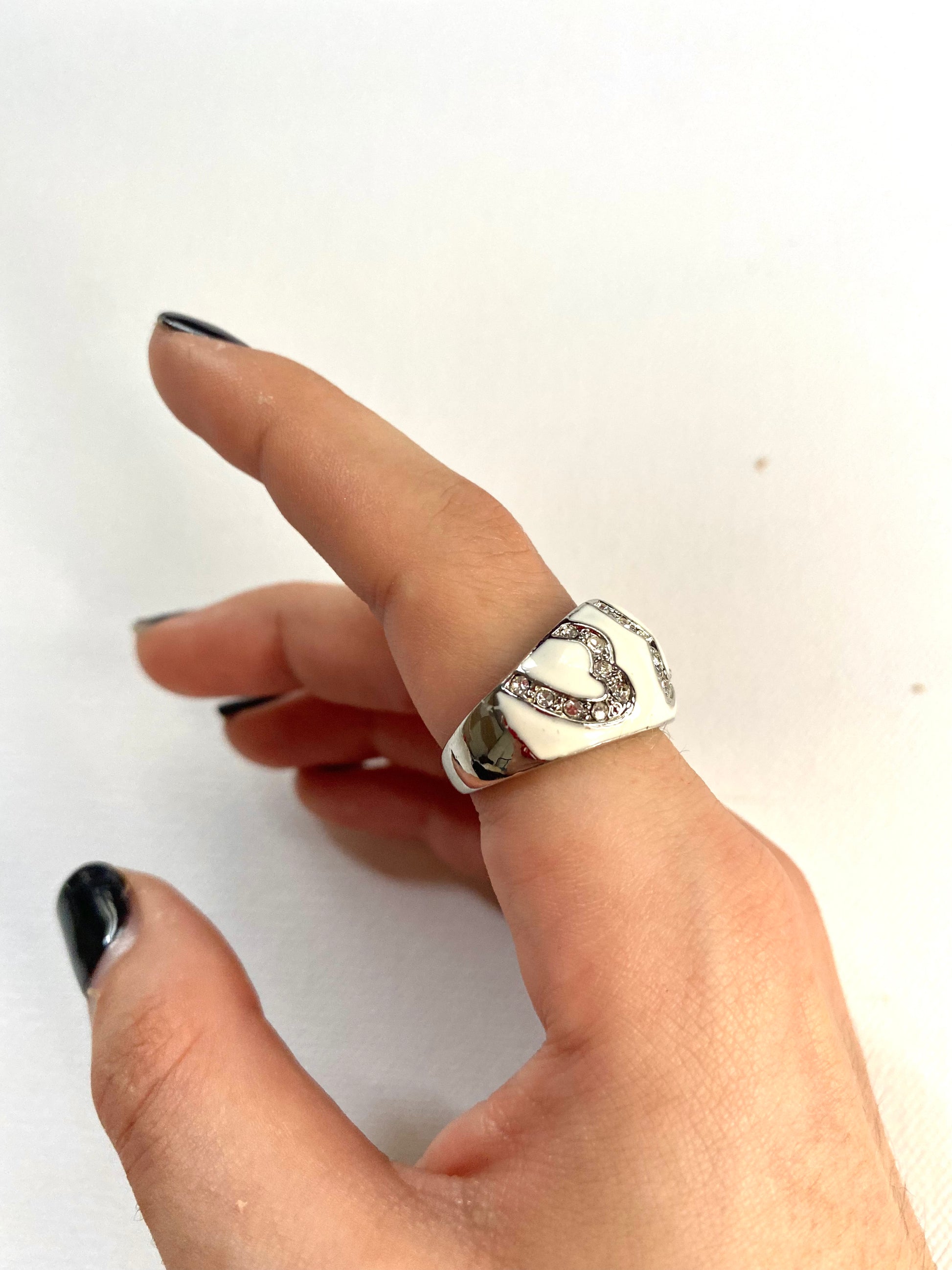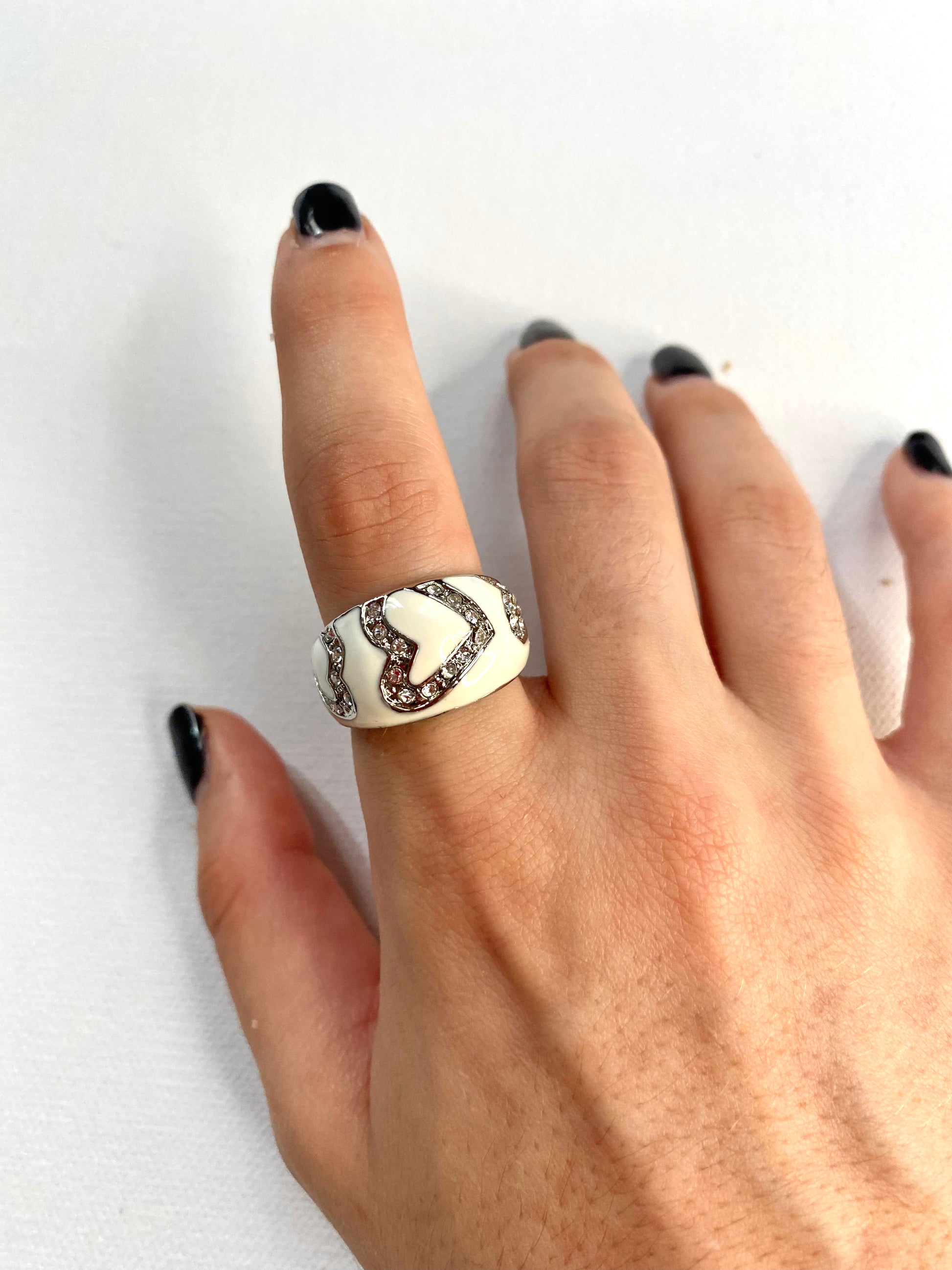 FR/ Bague en acier nacrée blanc cassé avec des cœurs en zircons.