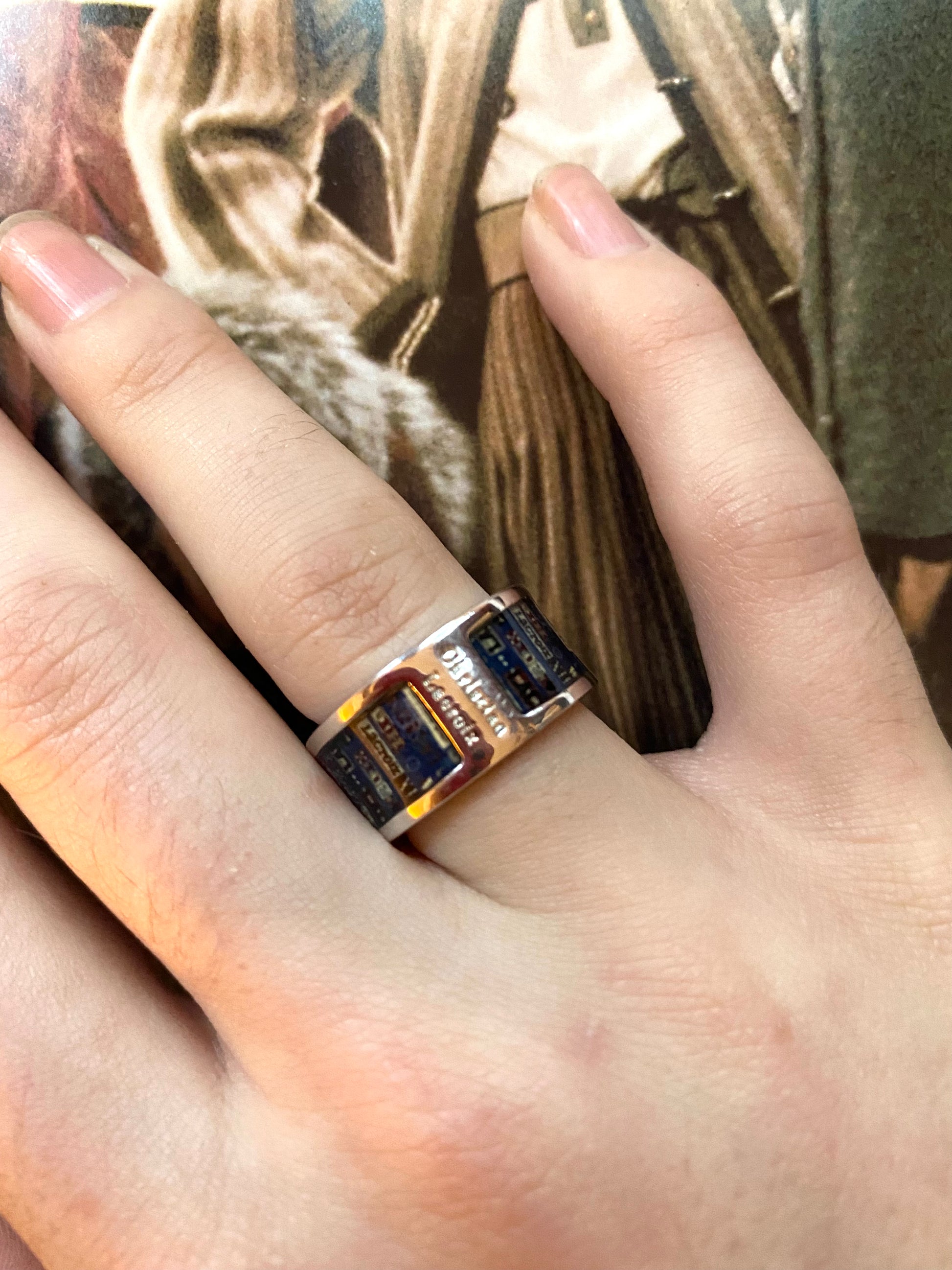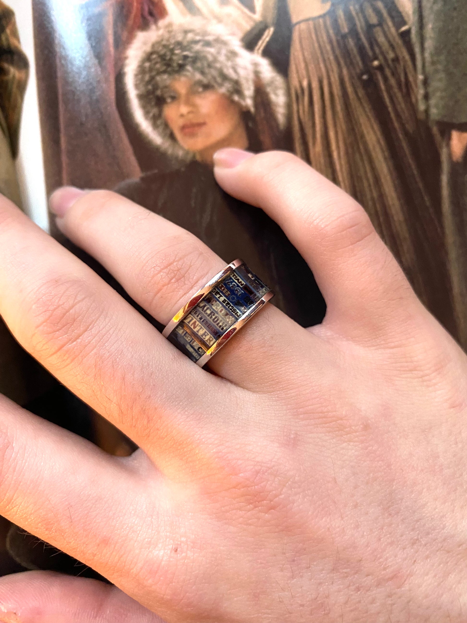 FR/ Bague CxL by Christian Lacroix en argent. Le motif écriture est original et il répète les mots du nom de la marque. Elle est aussi signée sur la phase visible de la bague en plus d’être signée à l’intérieur de l’anneau.