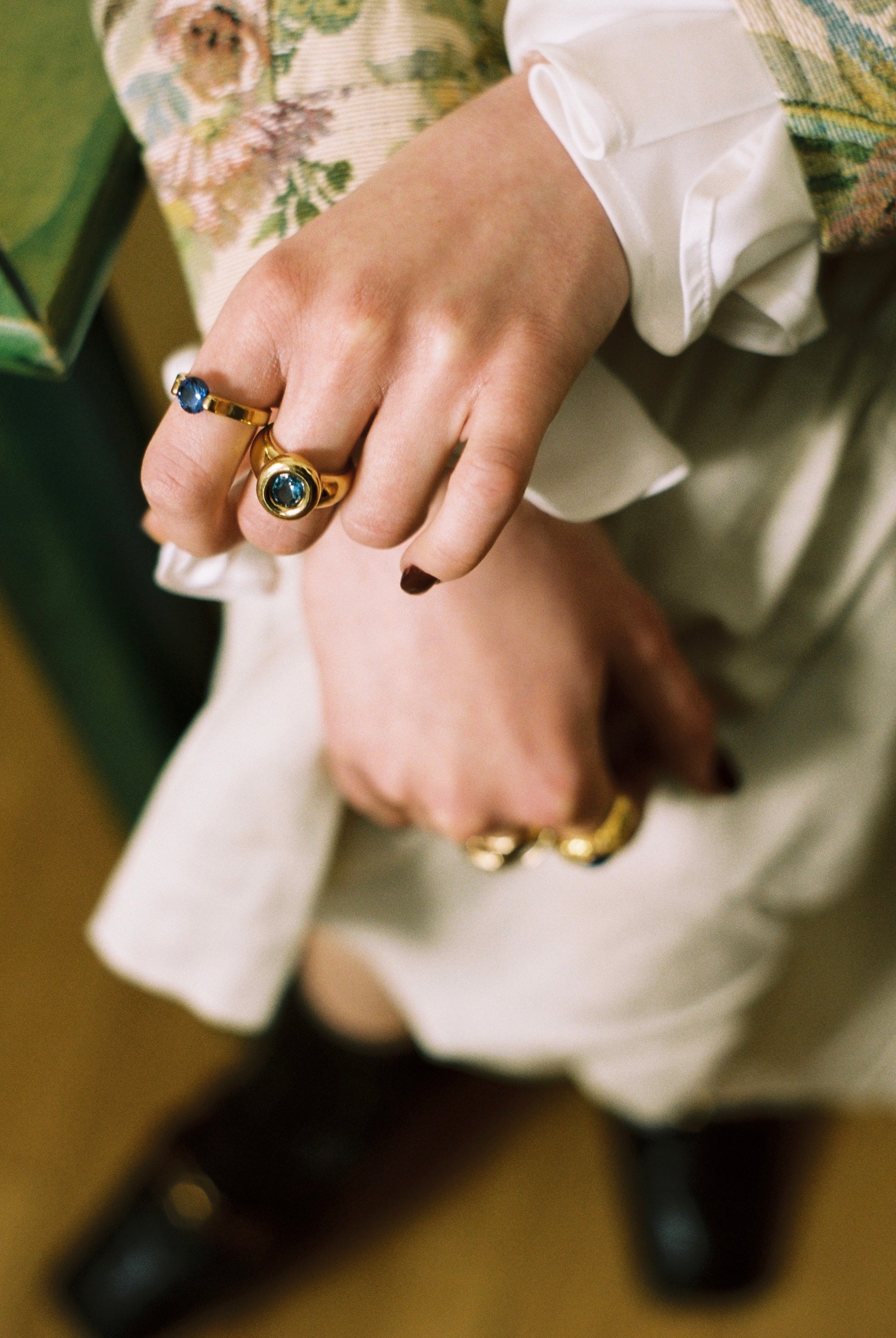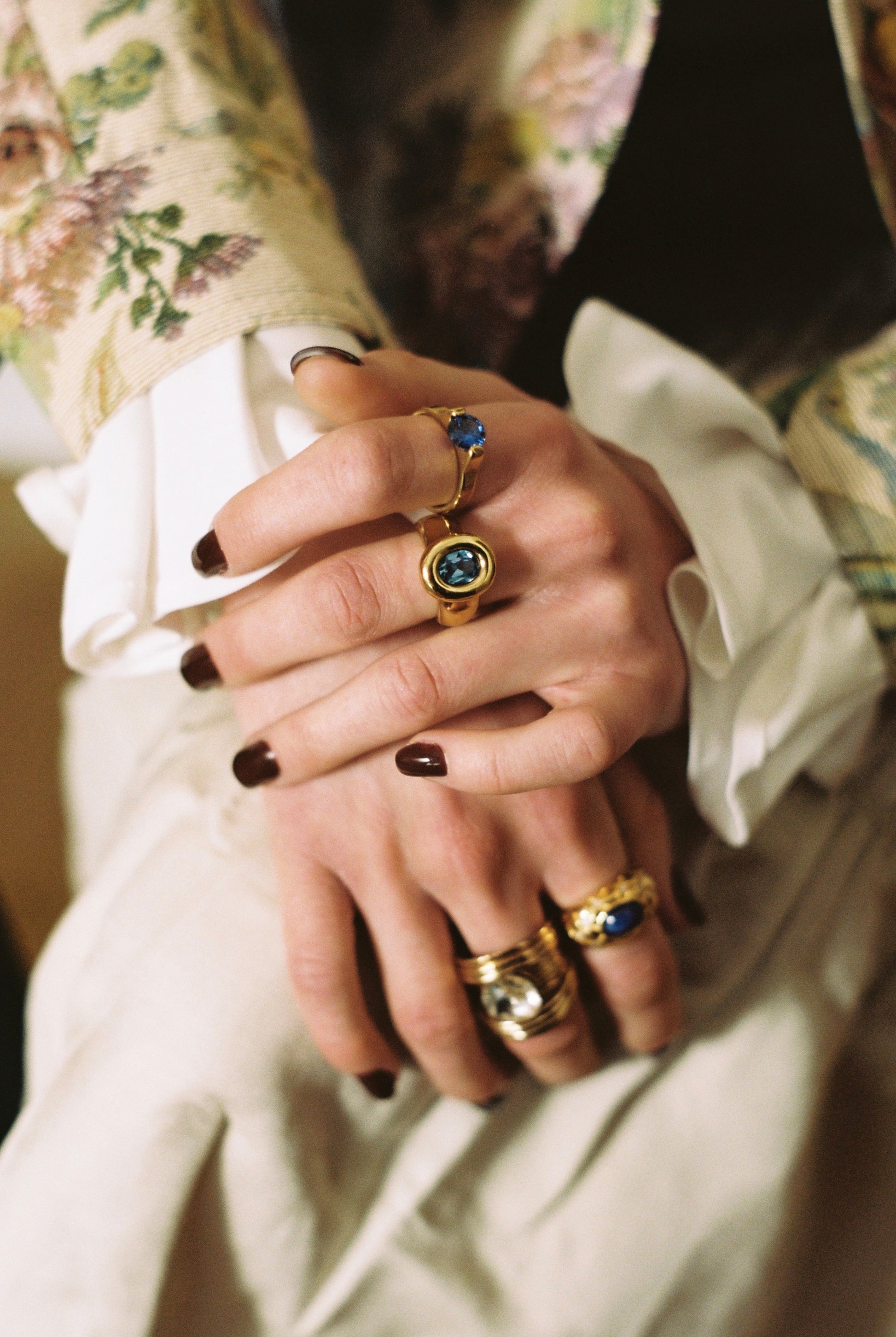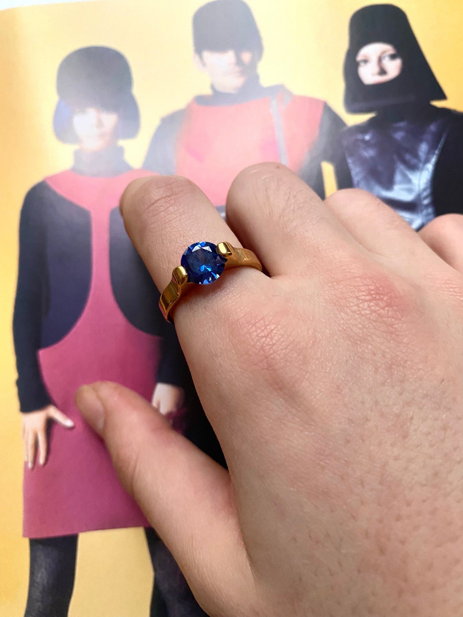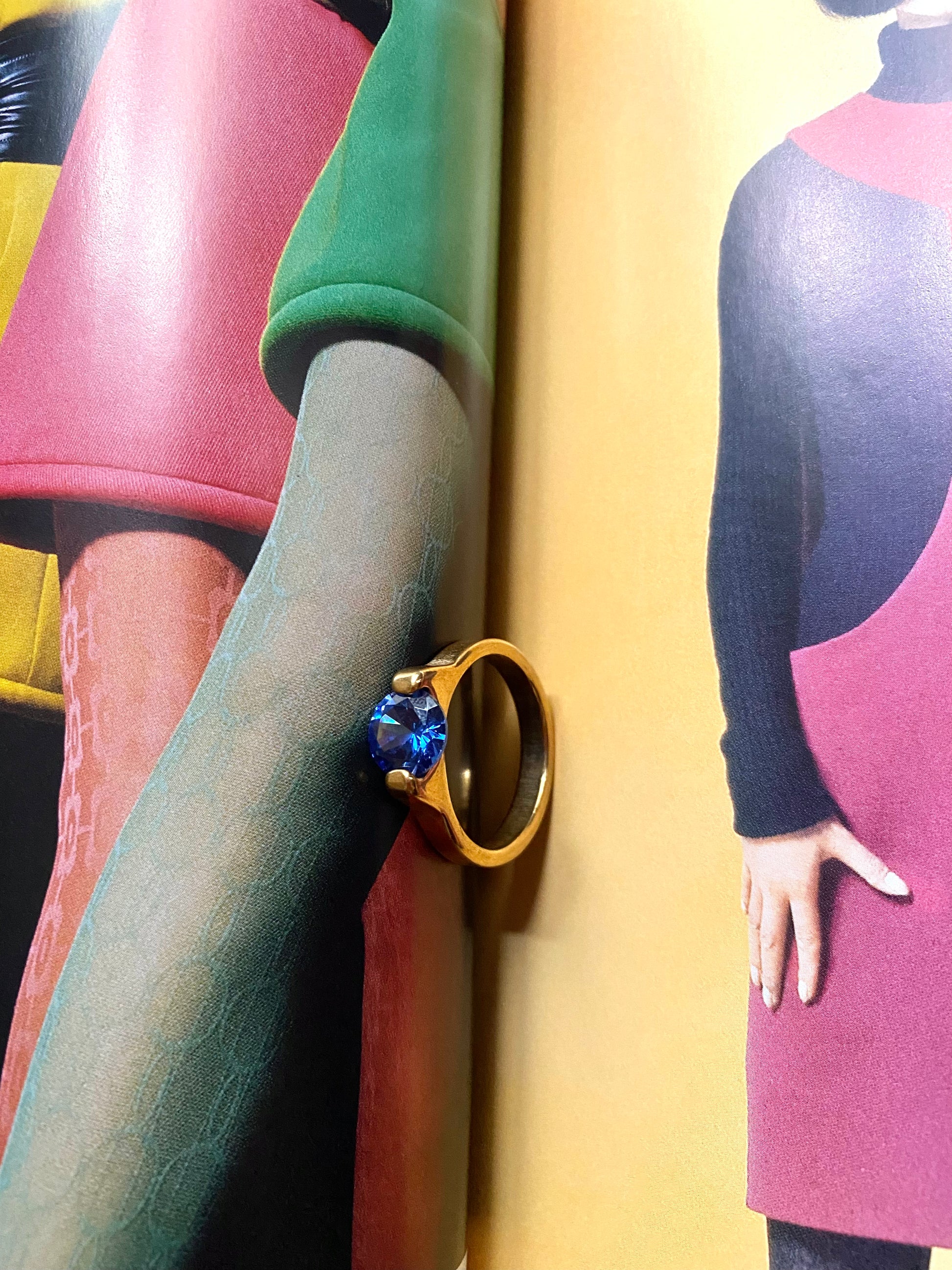 FR/ Bague en acier couleur or avec un cristal bleu. Une très belle pièce avec une monture originale et très élégante. Ce bleu s’accorde parfaitement avec l’or pour un rendu si glamour !
