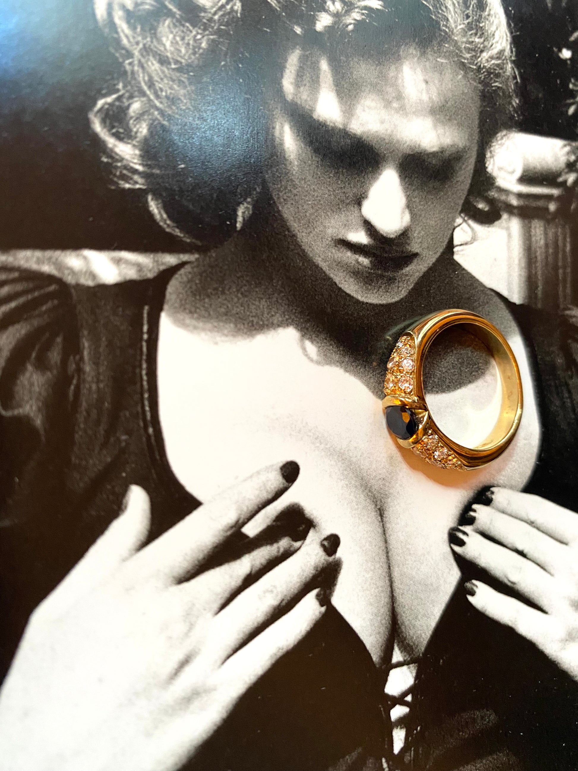 EN/ Gold-plated ring with a midnight blue crystal in the center and white zirconiums.