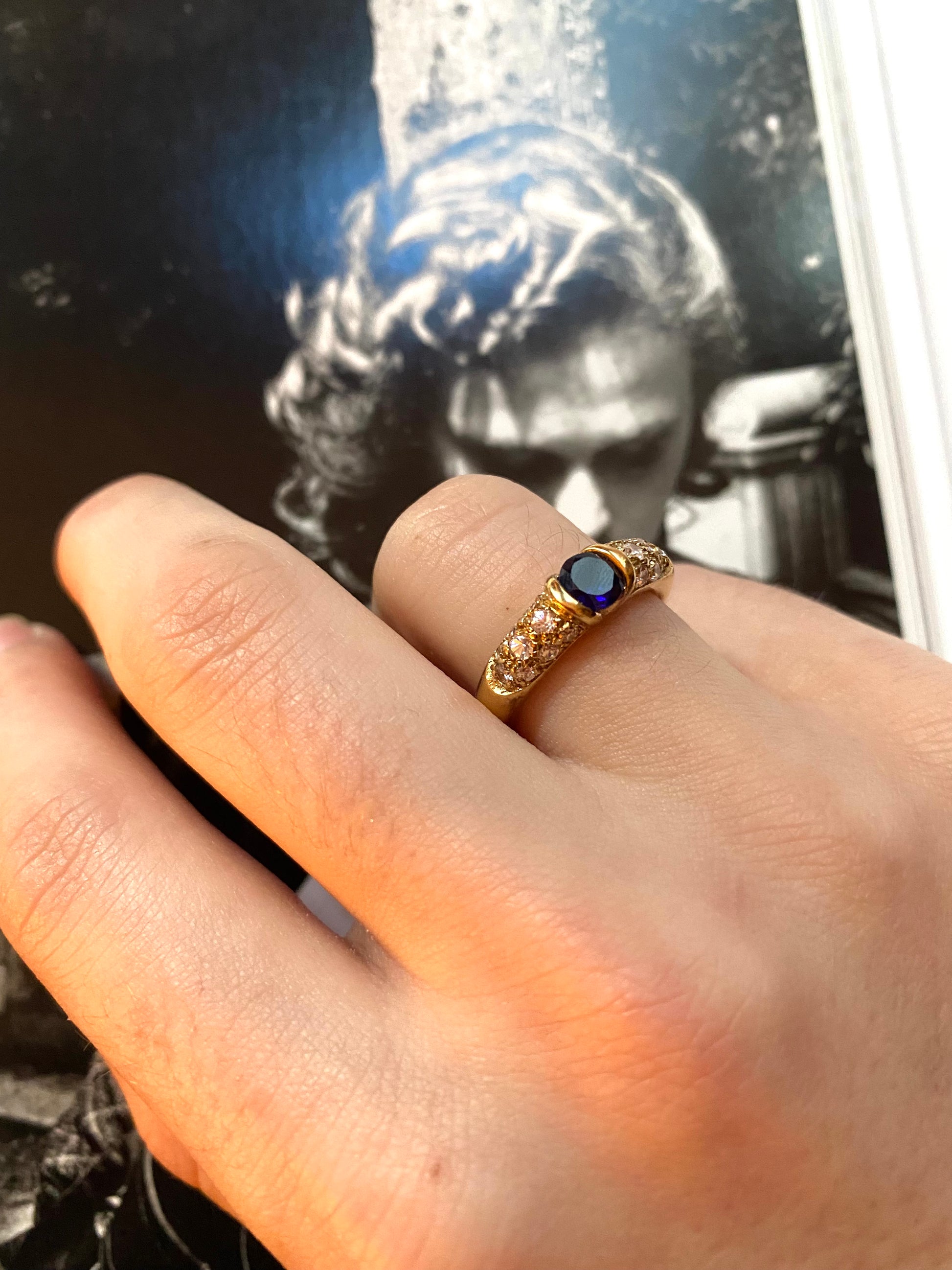 FR/ Bague en plaqué or avec un cristal bleu nuit au centre et des zircons blancs.