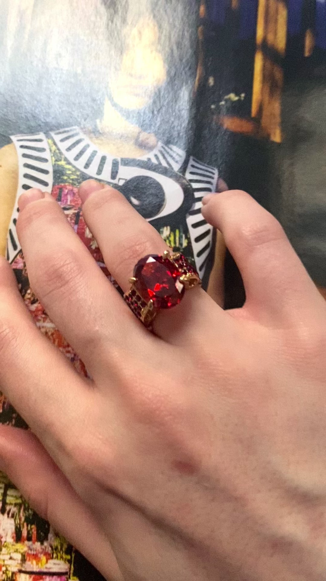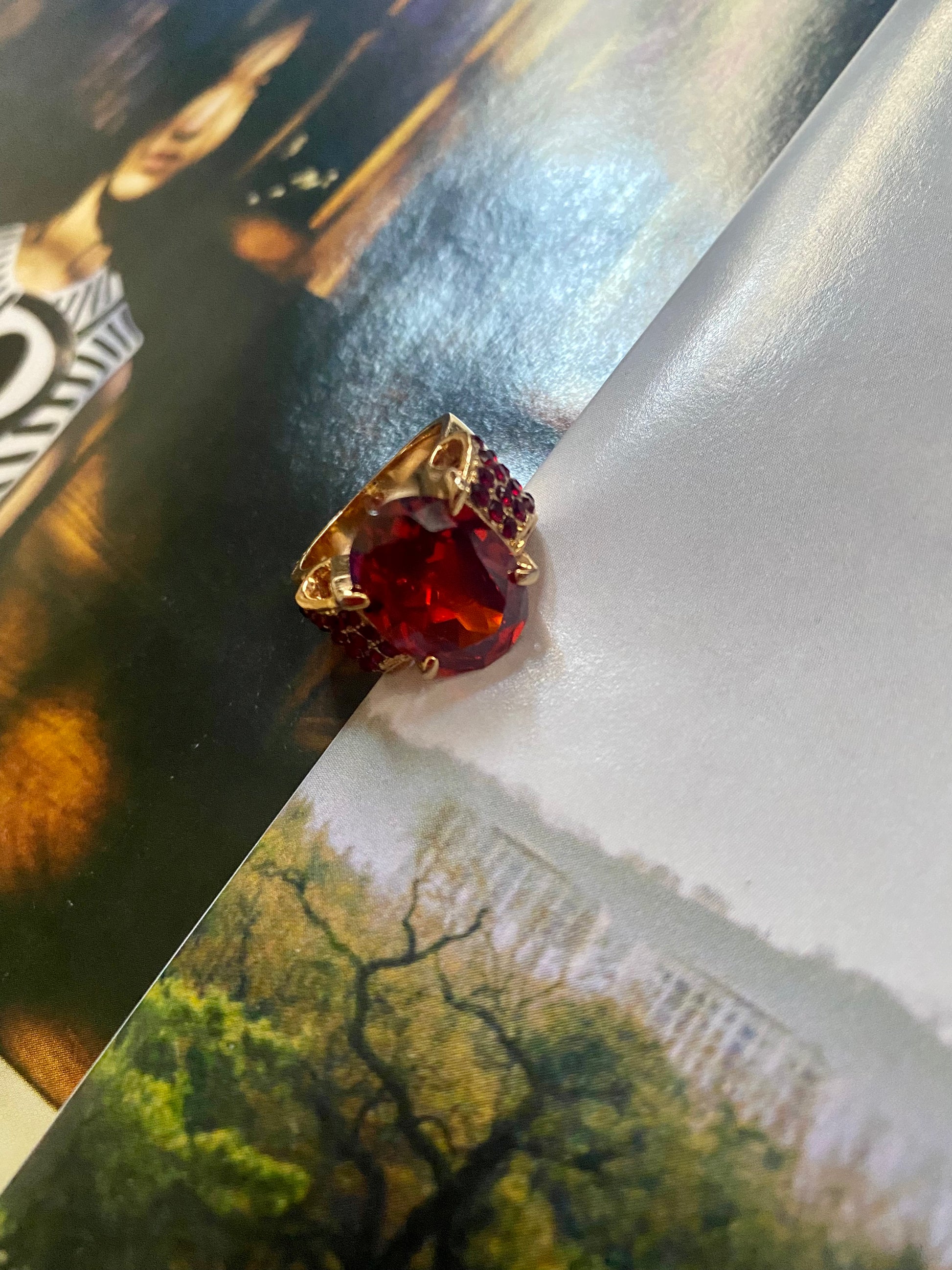 EN/ Gold plated ring with red zirconiums and a big red stone. The design is very original and stand out. We love the mix with red and gold !