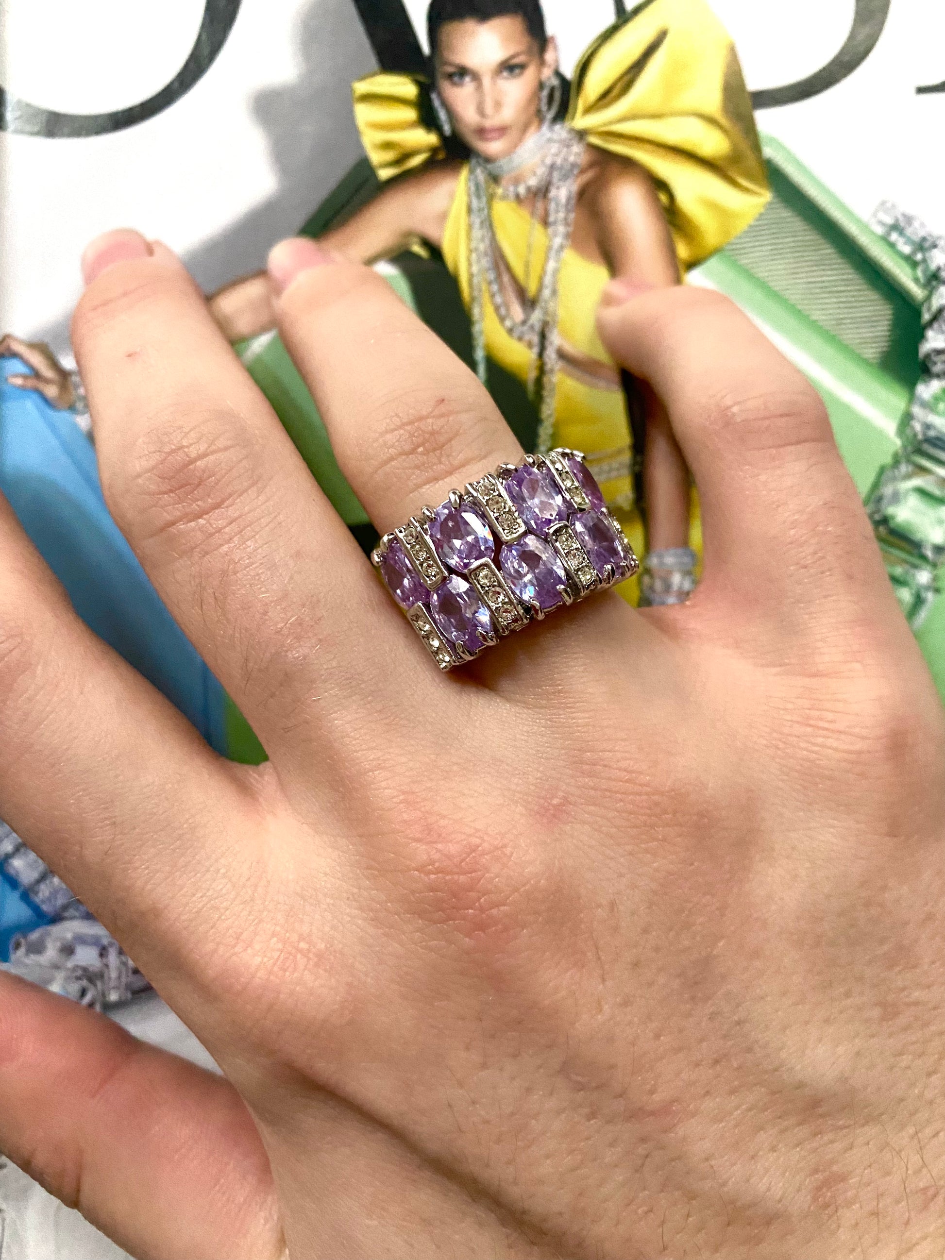FR/ Bague en argent avec zircons et cristaux violets clairs. Ce modèle pavé est sublime, très brillante et précieuse. On aime ce mélange de pièce imposante et dans le même temps élégante et raffiné.