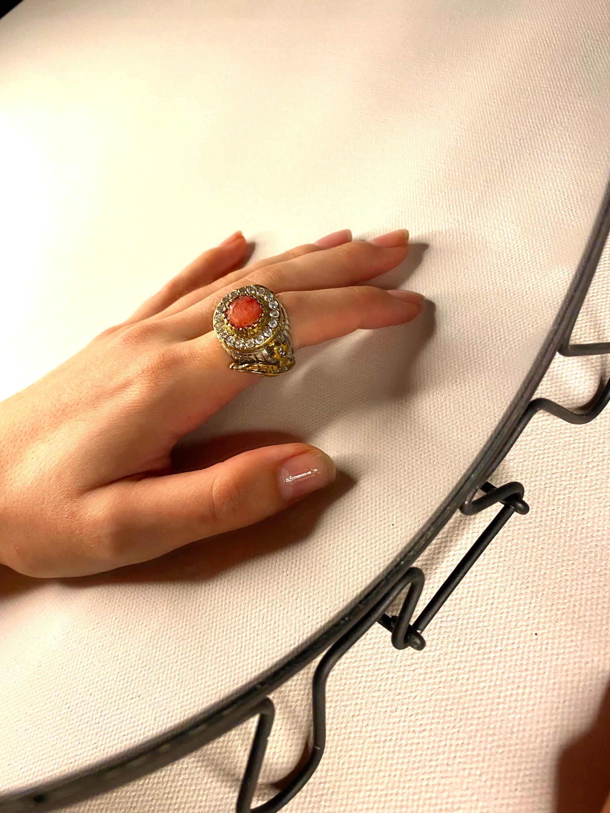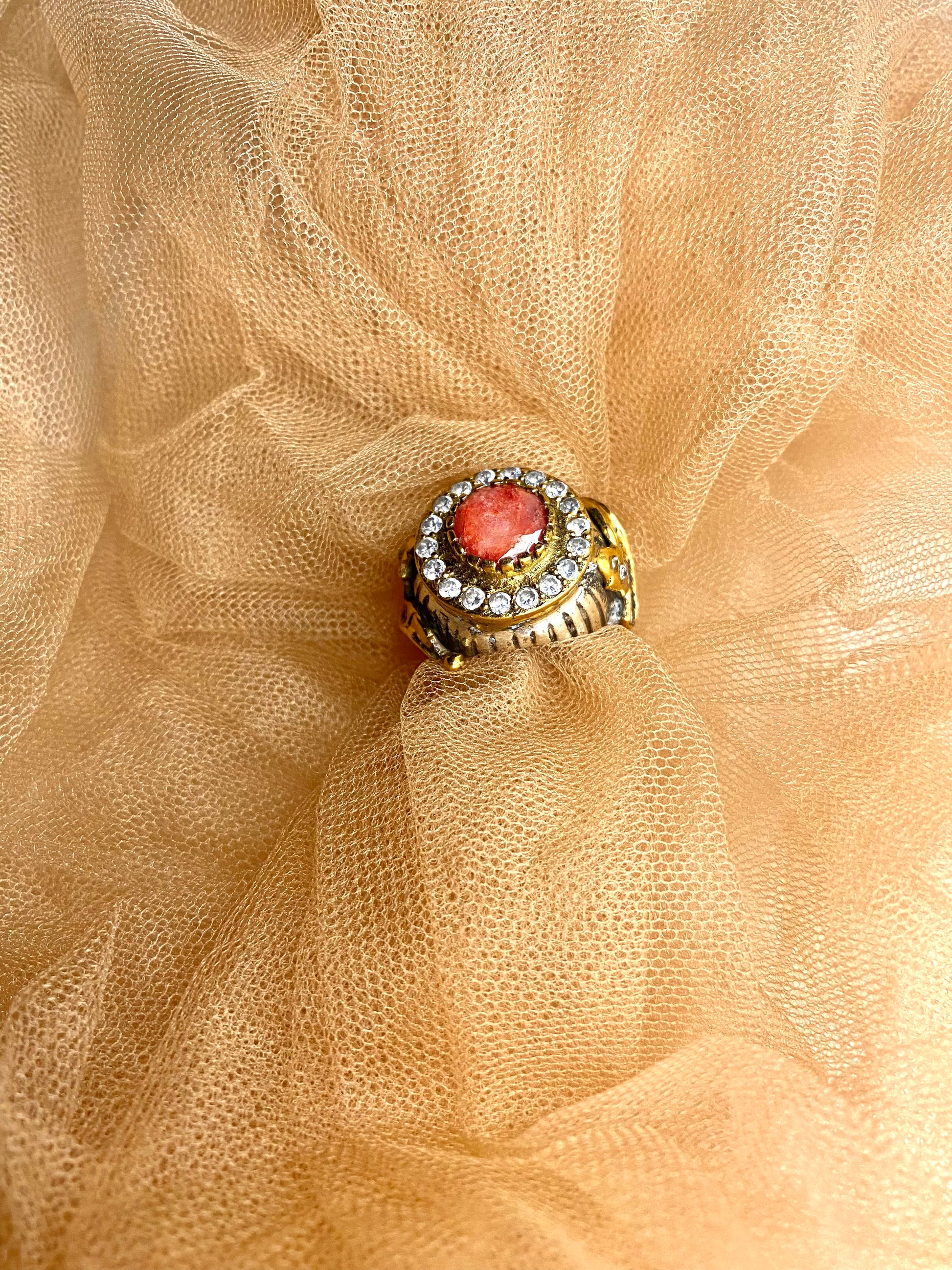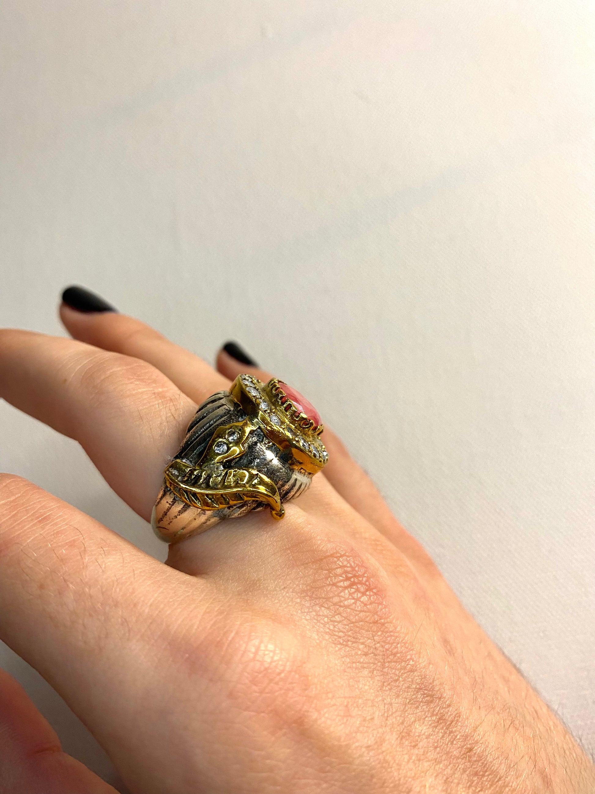 EN/ This huge silver and gold plated signet ring has zirconiums and a big ruby root.