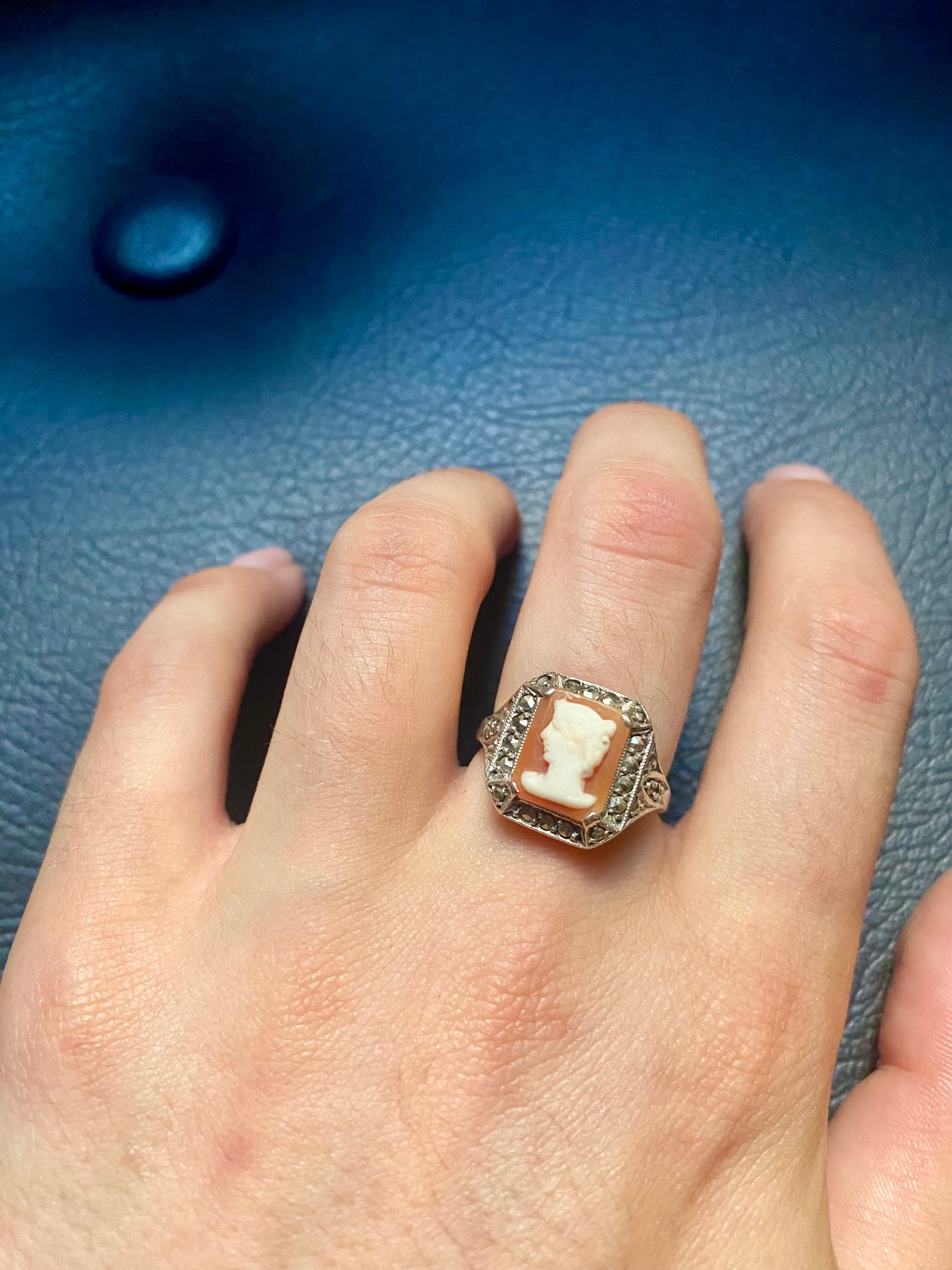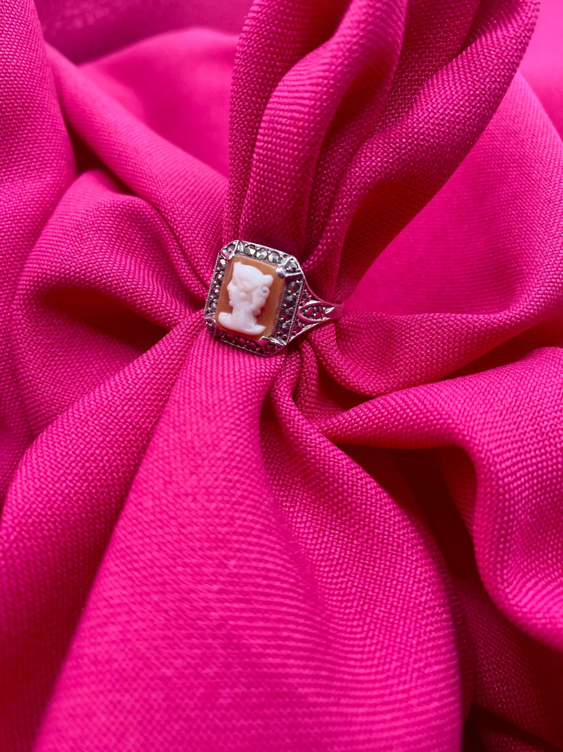 EN/ Incredible cameo ring on a 925 silver frame and set with marcasite. The cameo is shell. A unique and rare piece.