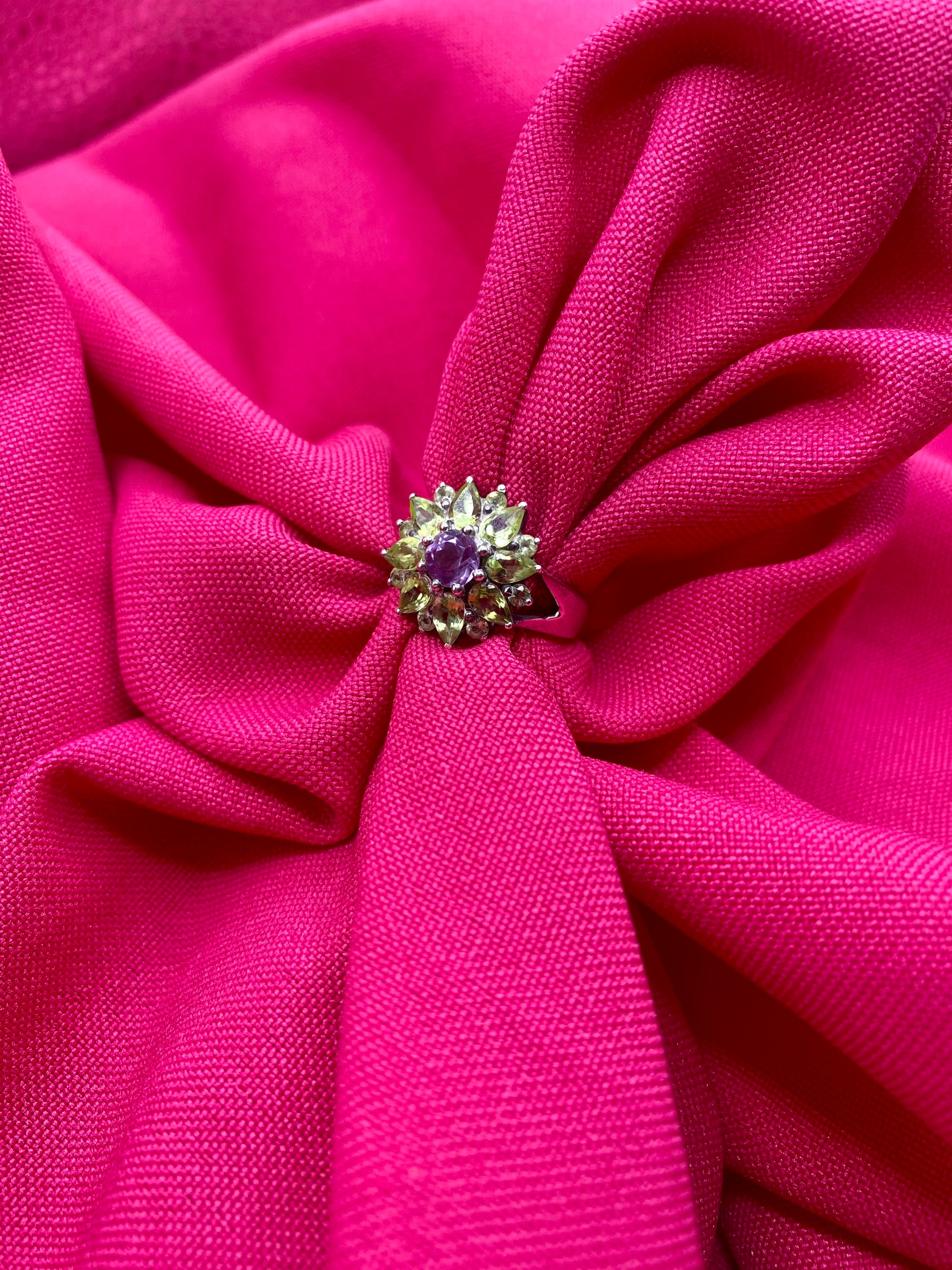 FR/ Incroyable bague marguerite en argent 925 sertie de pleins de péridots et d’une très belle améthyste. Une pièce d’exception qui perdurera.