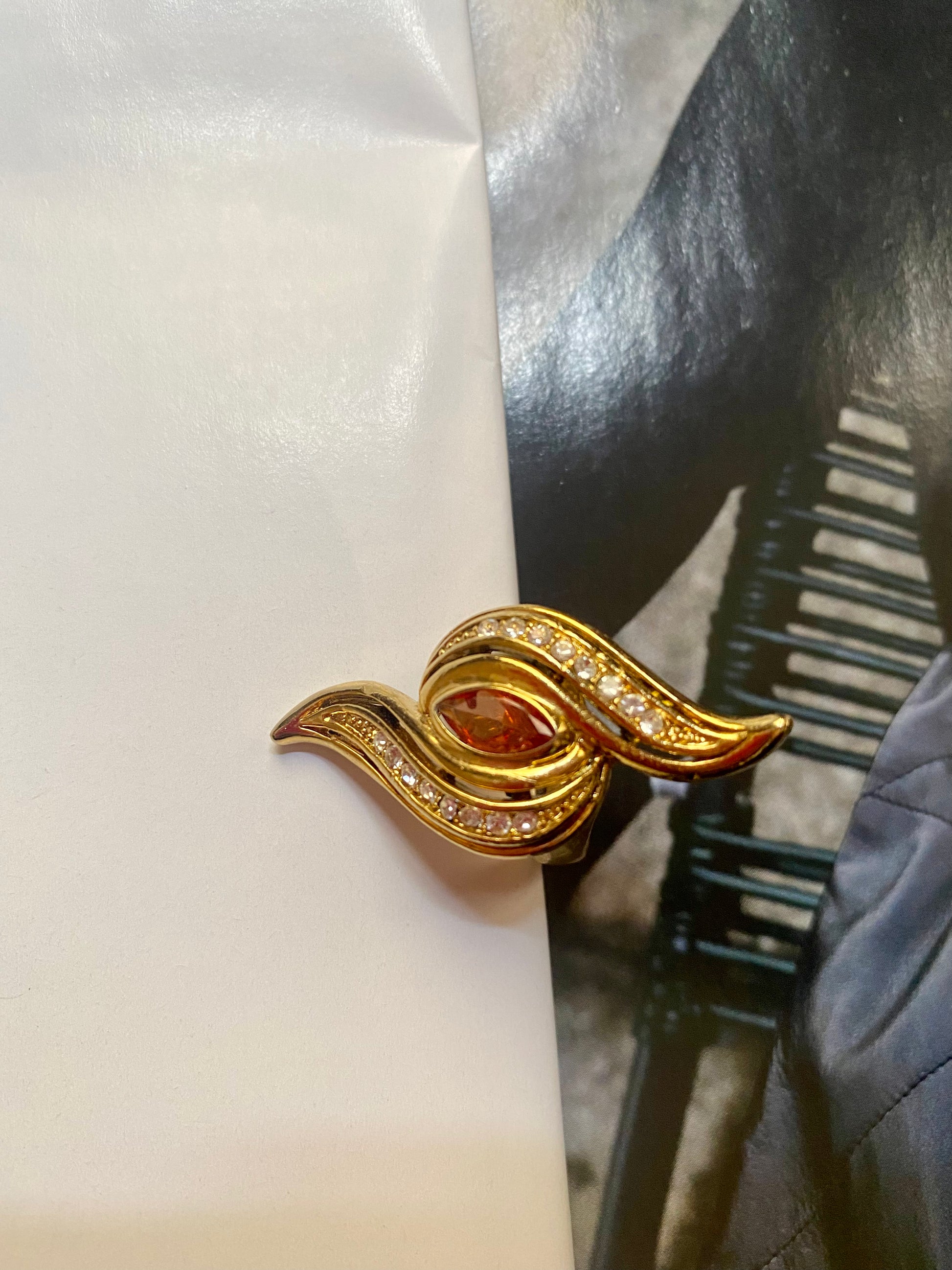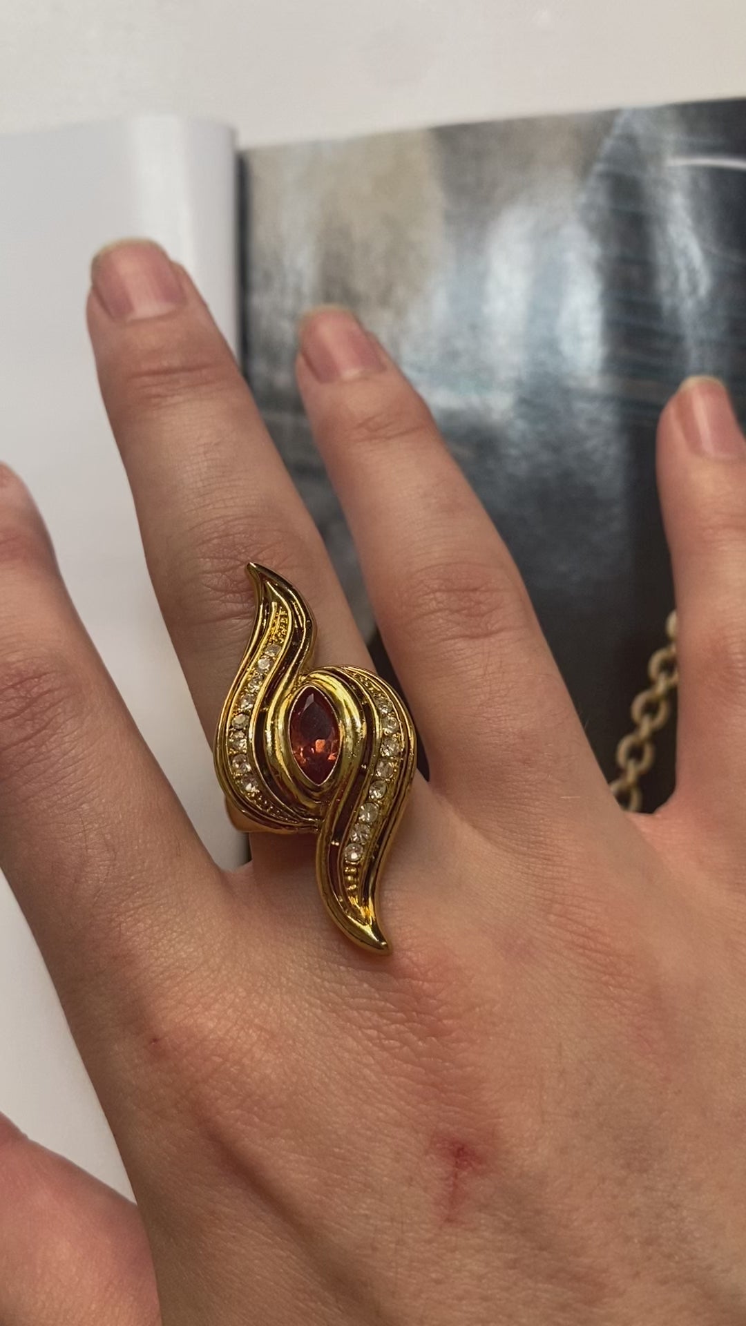 Bague vintage à la forme originale et sublime. Composée d’un cristal orange et de zirconiums. Taille 54 fr.