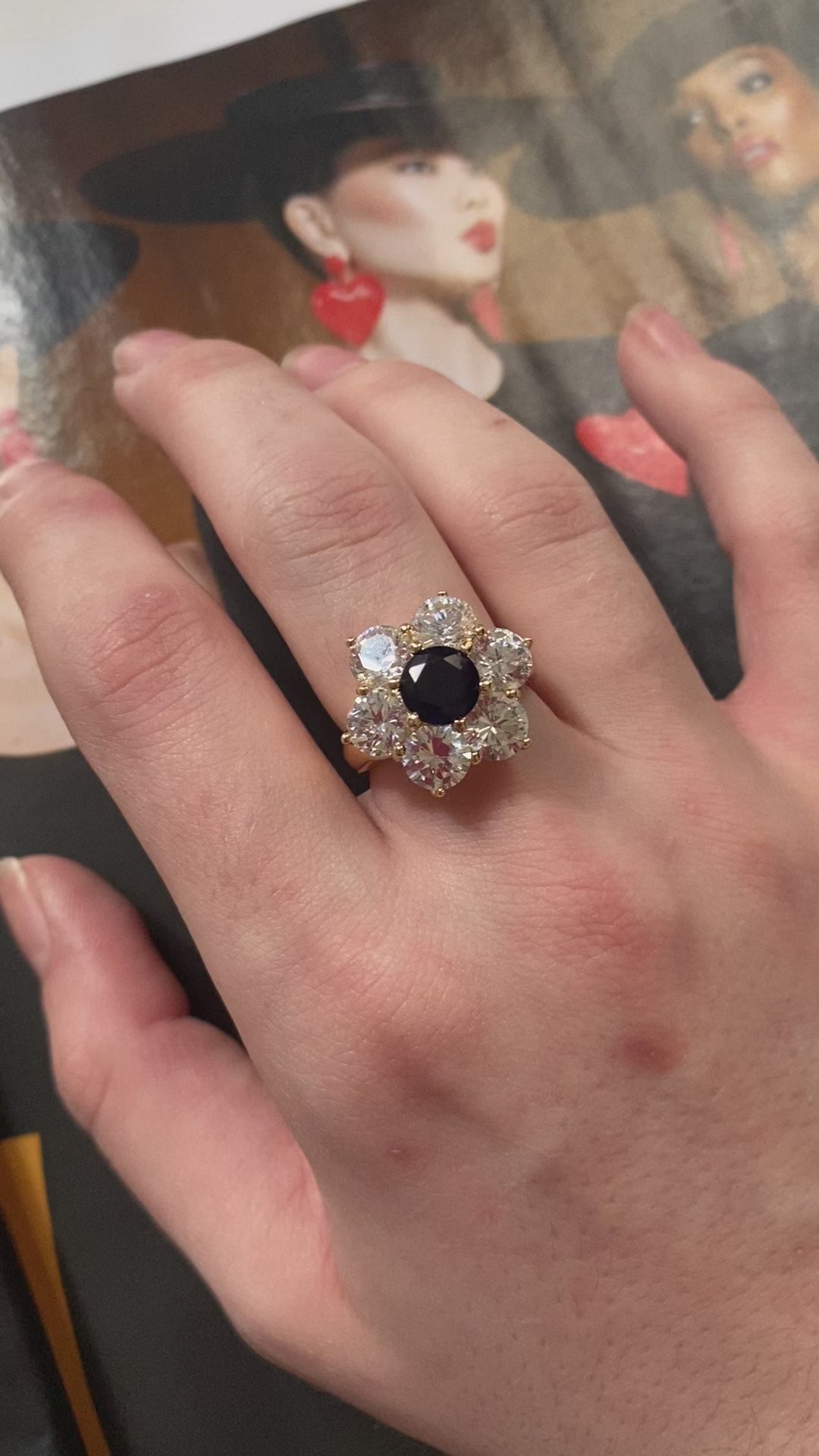 Bague fleur en or 18 carats avec un cristal bleu foncé et des cristaux blancs. Poinçonnée. Taille 54.