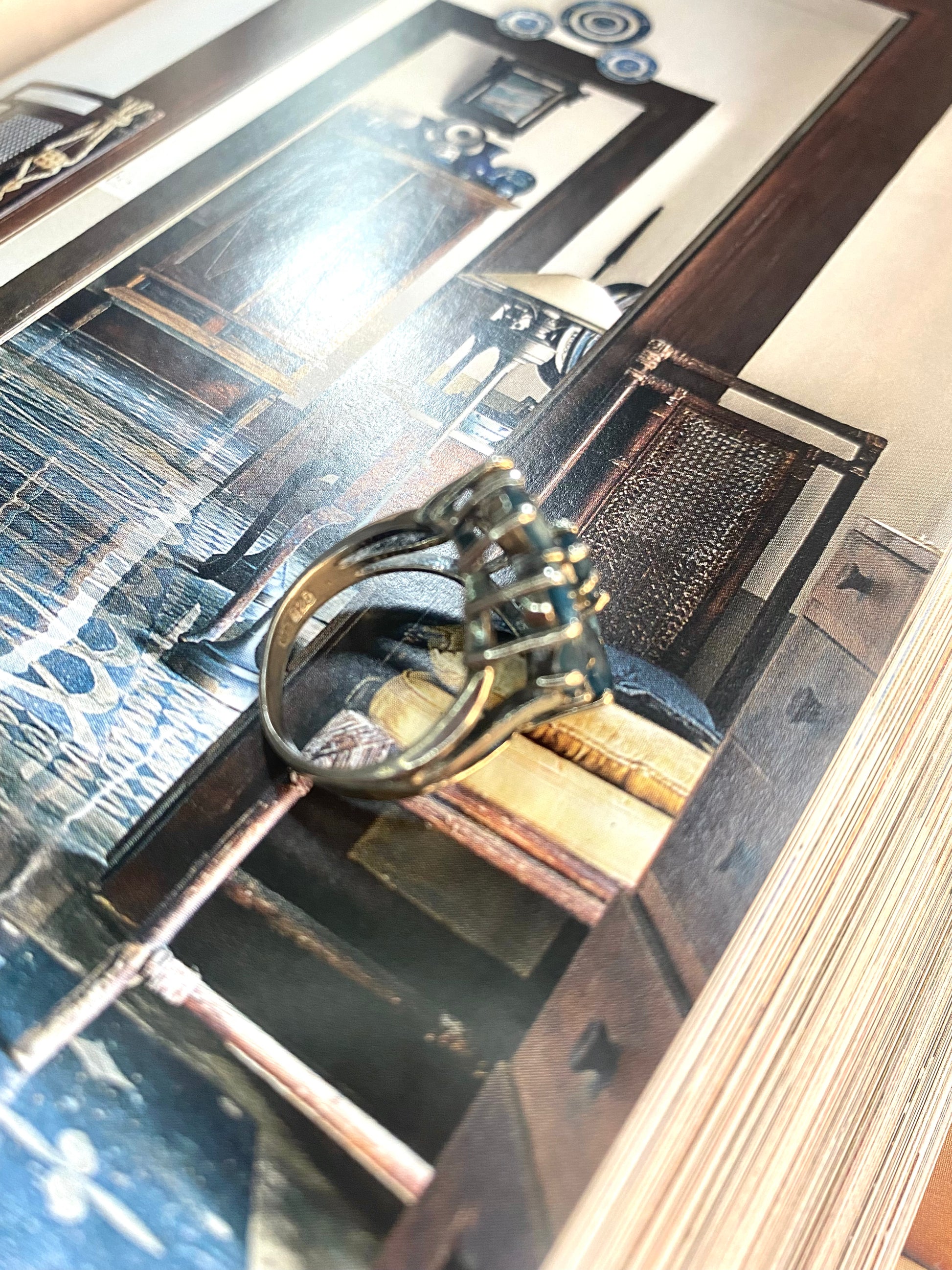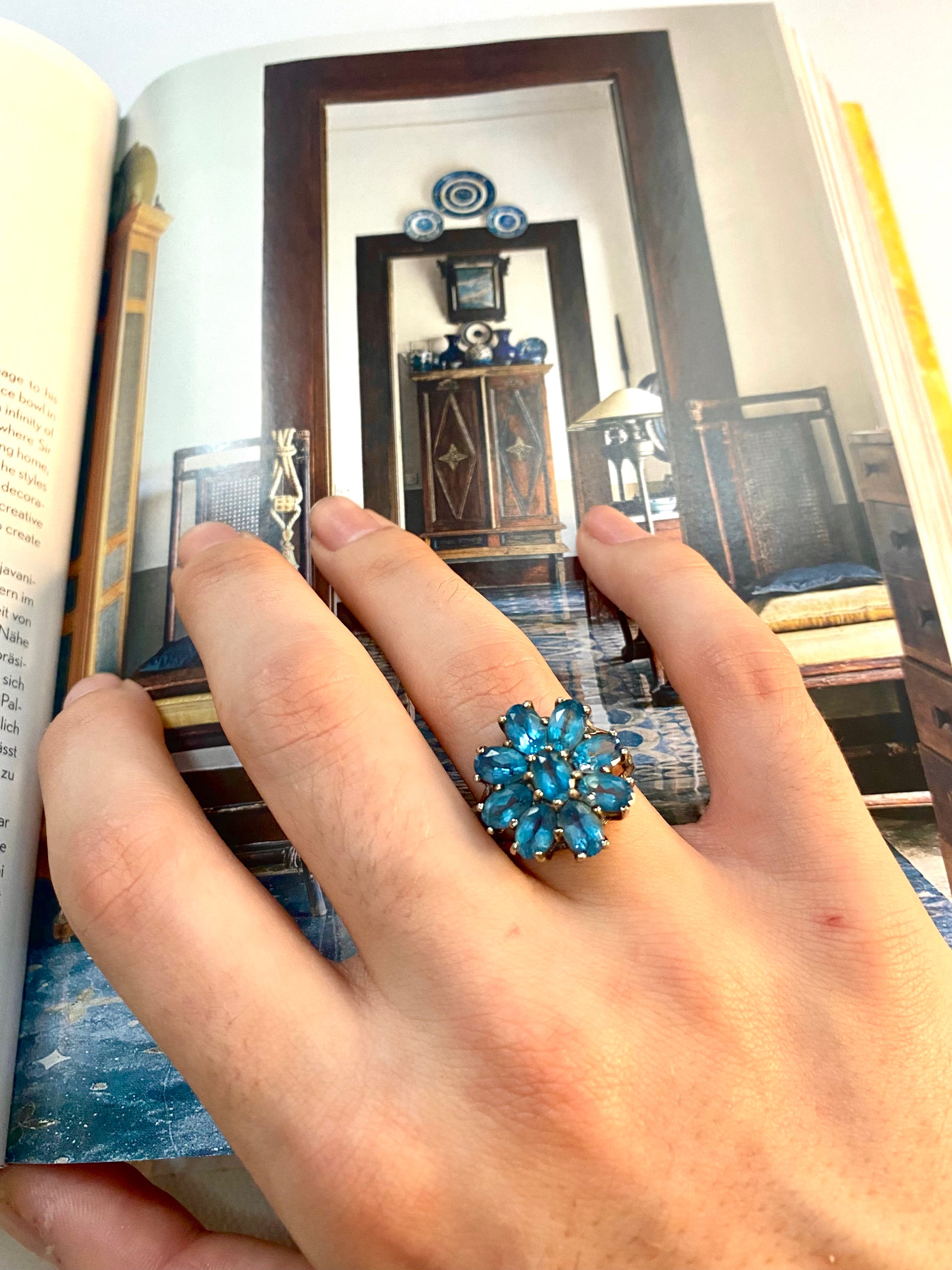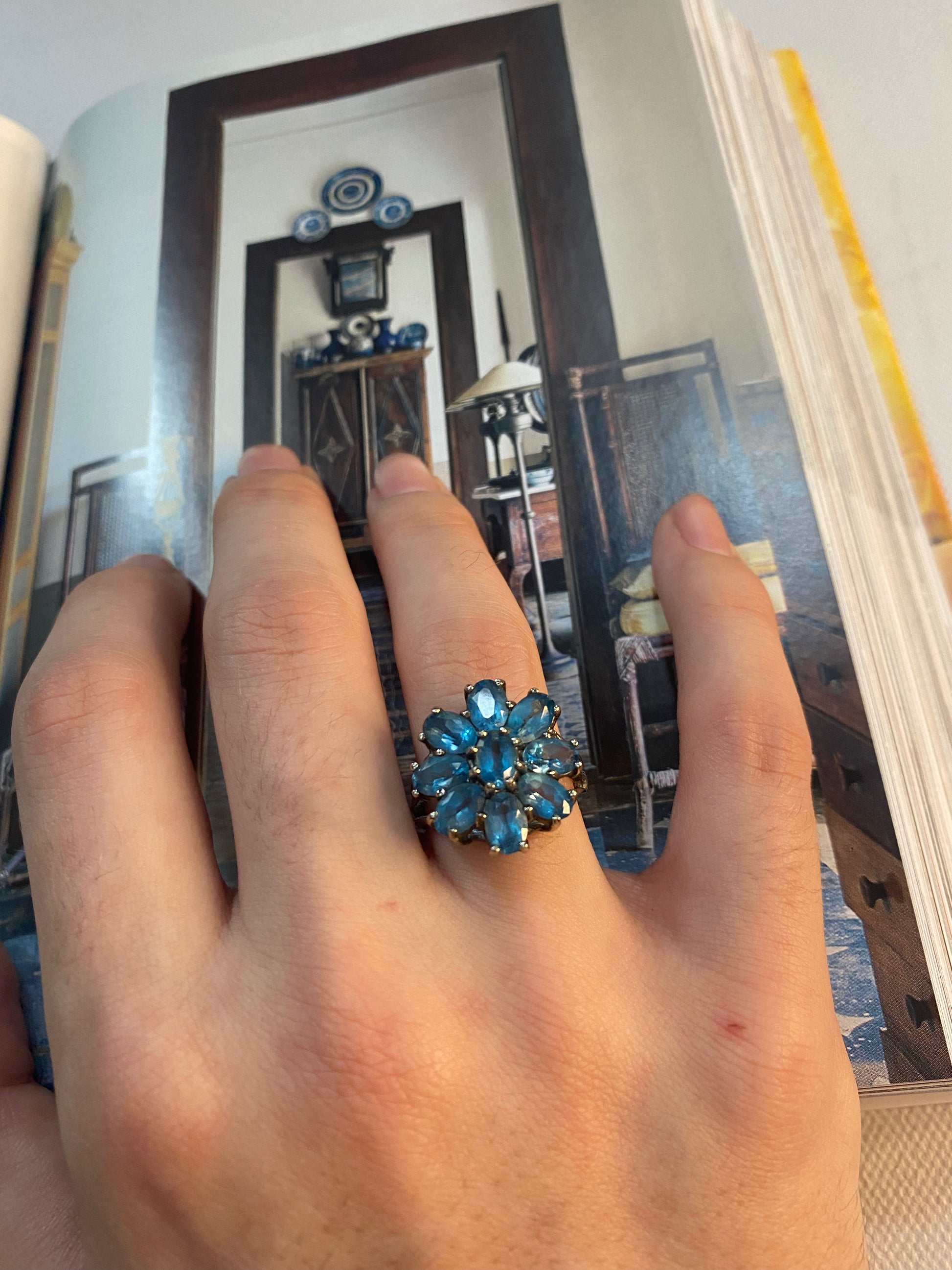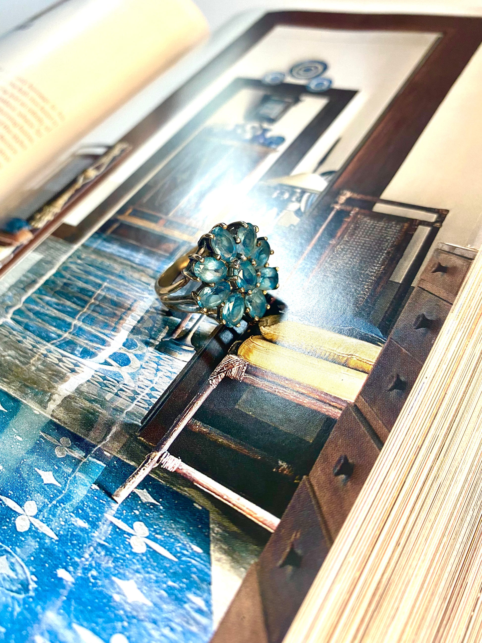 FR/ Bague vintage en argent avec des zirconiums bleus, en forme de fleur. La forme est sublime, la couleur de l’argent est sublime, le bleu des zirconiums est sublime. Une pièce de très bonne qualité et qui sort de l’ordinaire.