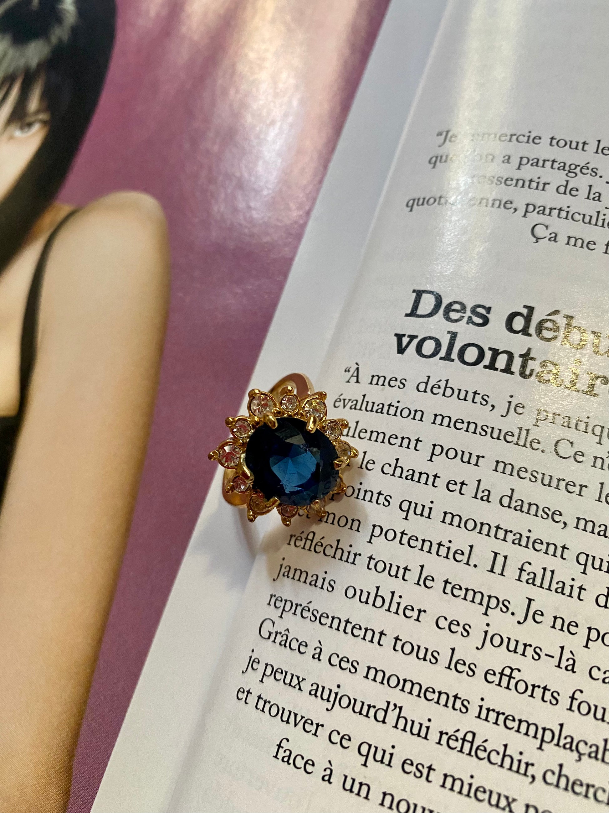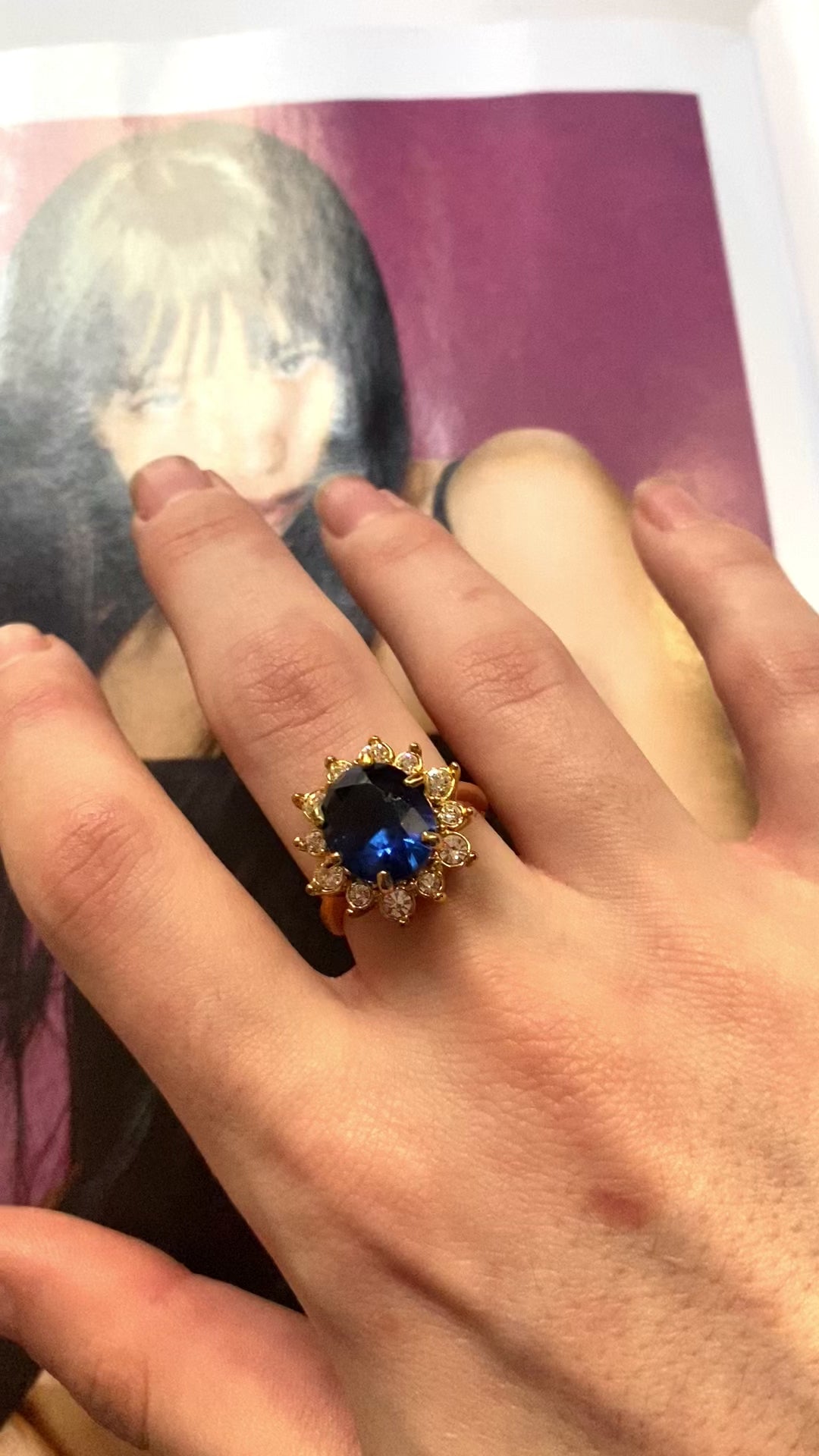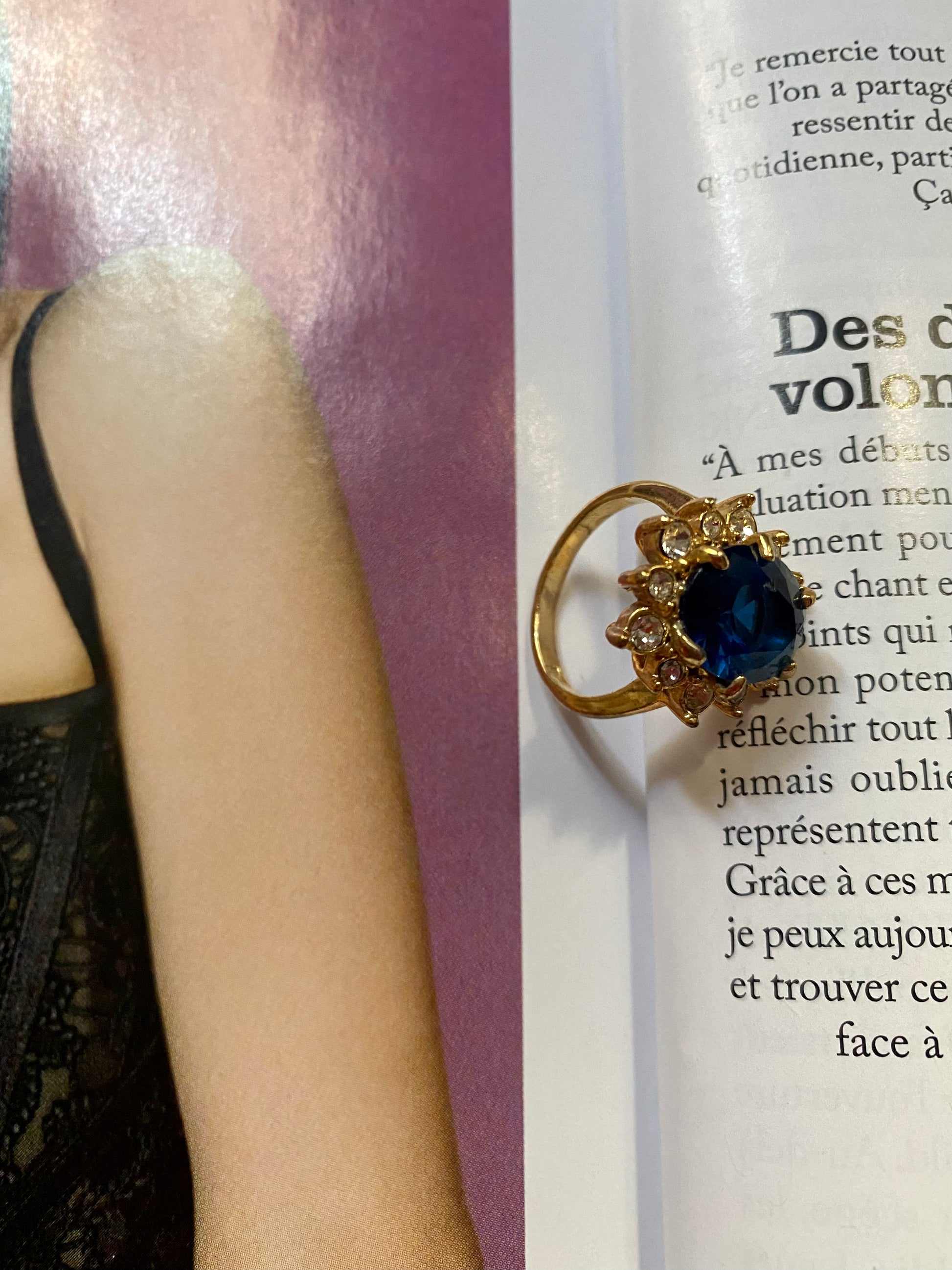Bague vintage en plaqué or avec des zircons blancs et un gros cristal bleu foncé. Taille 54 FR.