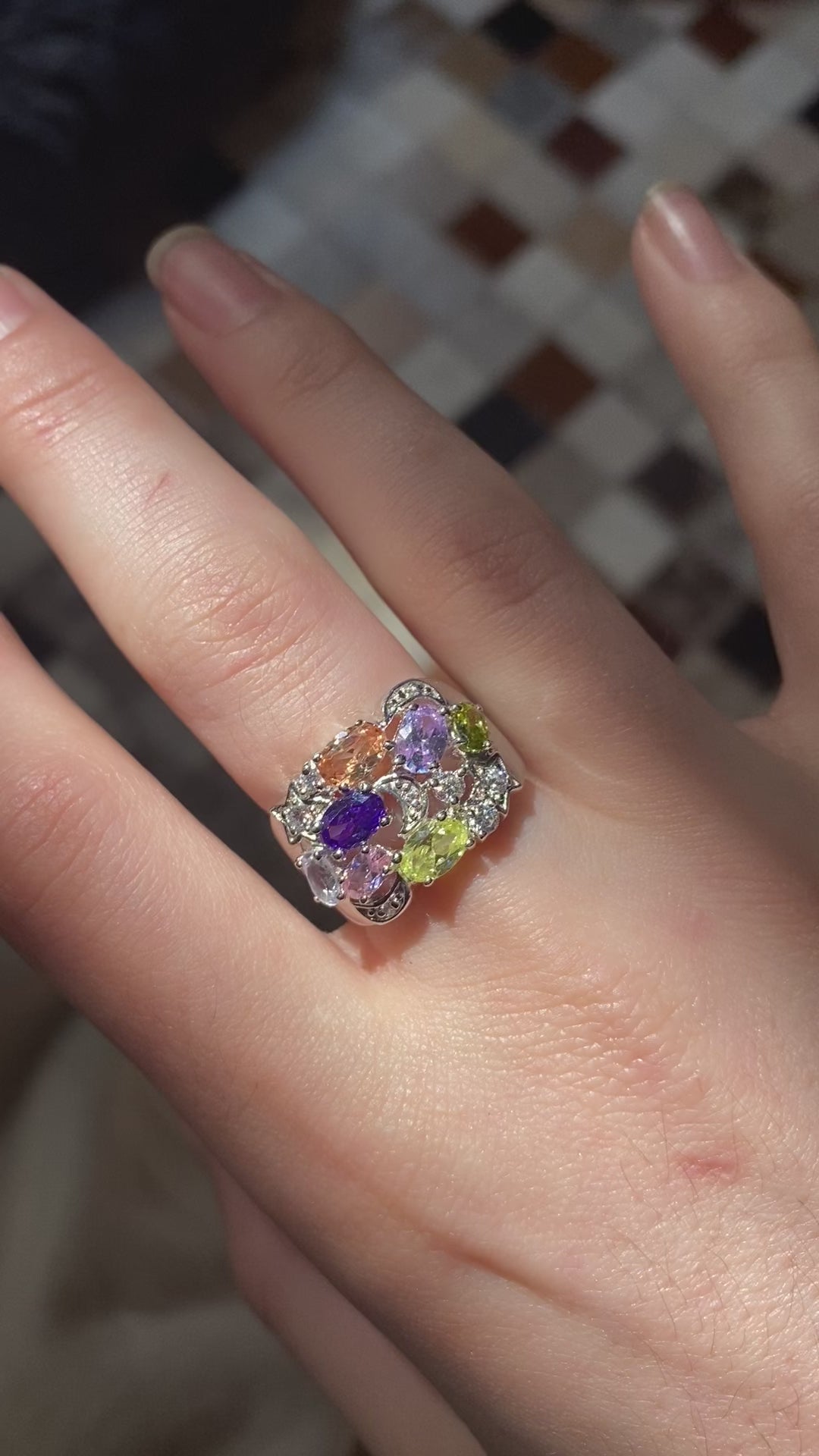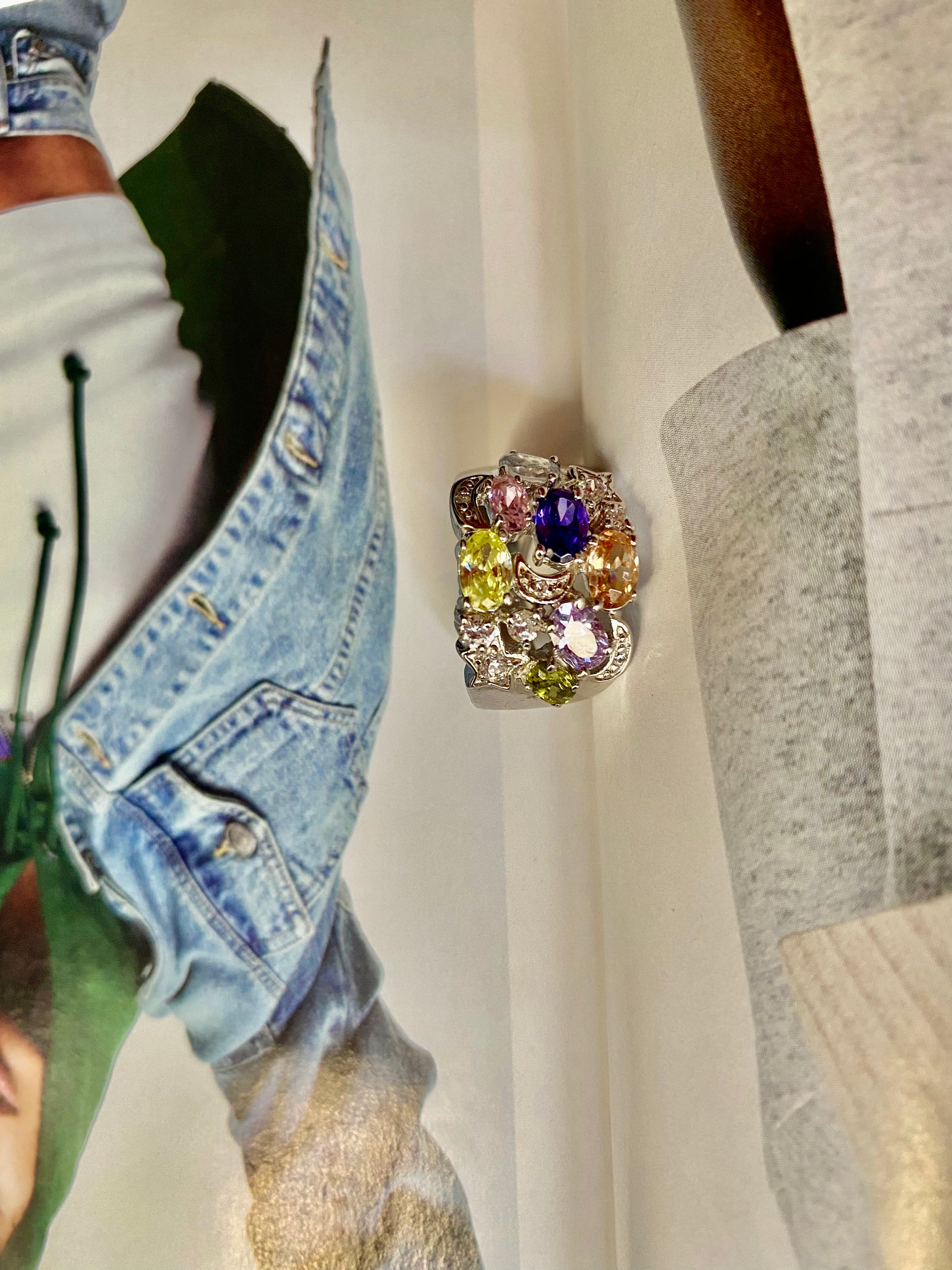 Cette bague en argent 925 possède des cristaux de différentes couleurs et des petites étoiles et lunes serties de zirconiums. Taille 53.