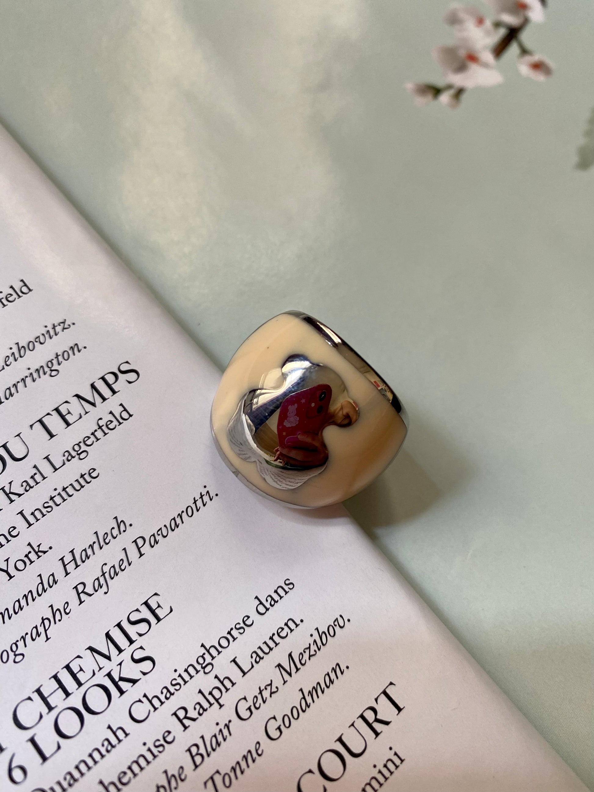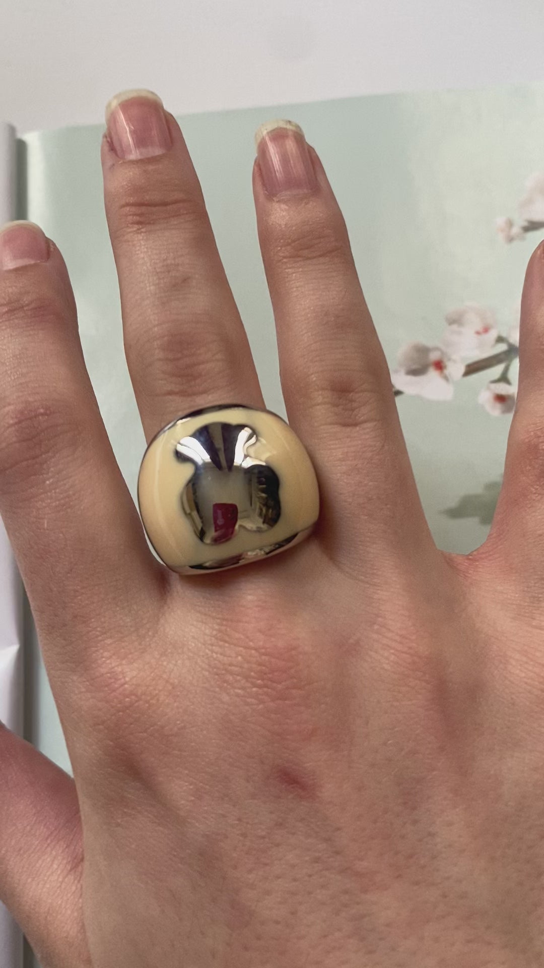 Bague en acier couleur argent avec un plaquage blanc cassé et une forme d’ourson au centre. Bague la plus mignonne jamais trouvé.
