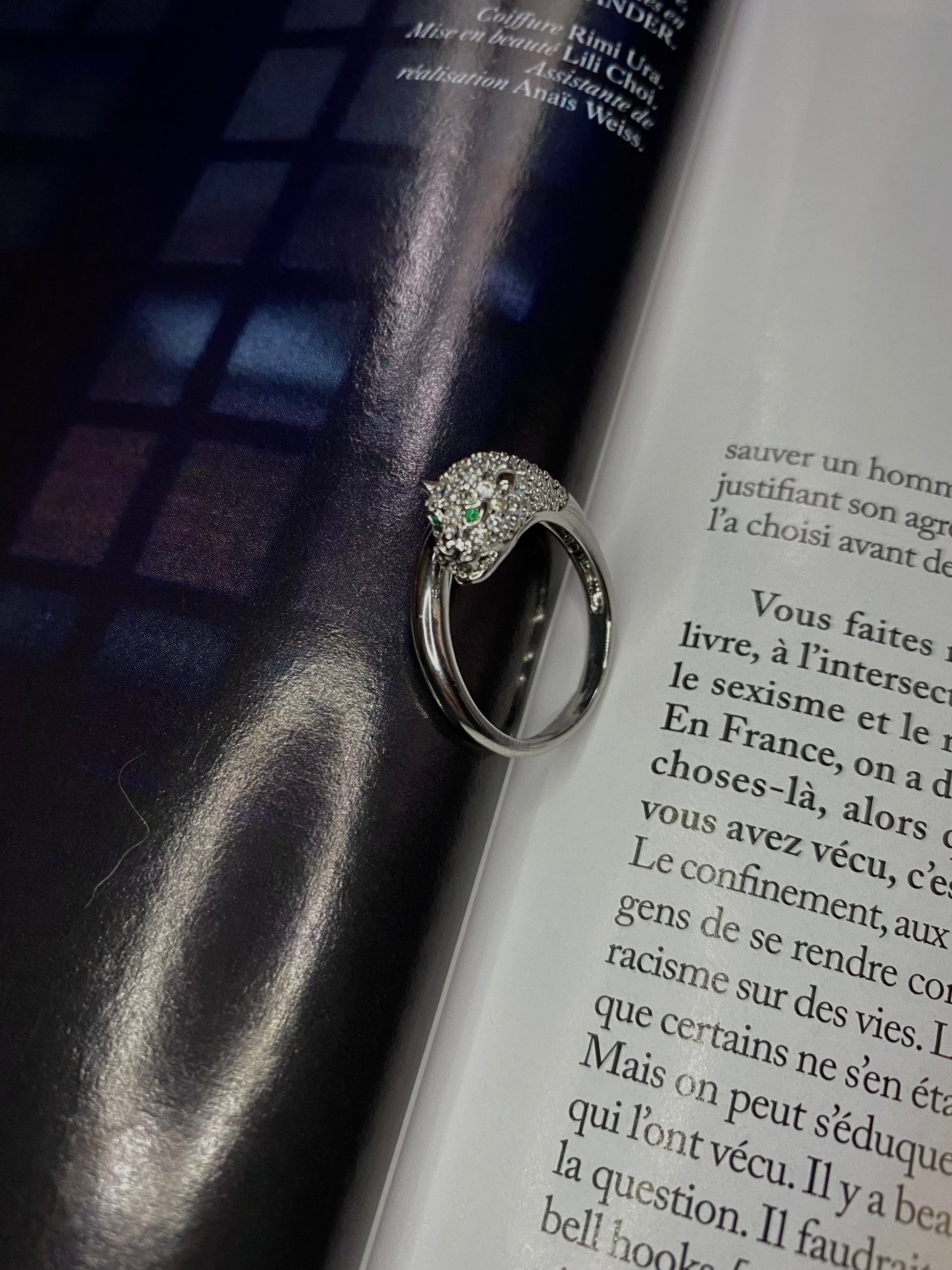 EN/ Silver Panther ring with zirconiums and two little green crystals.