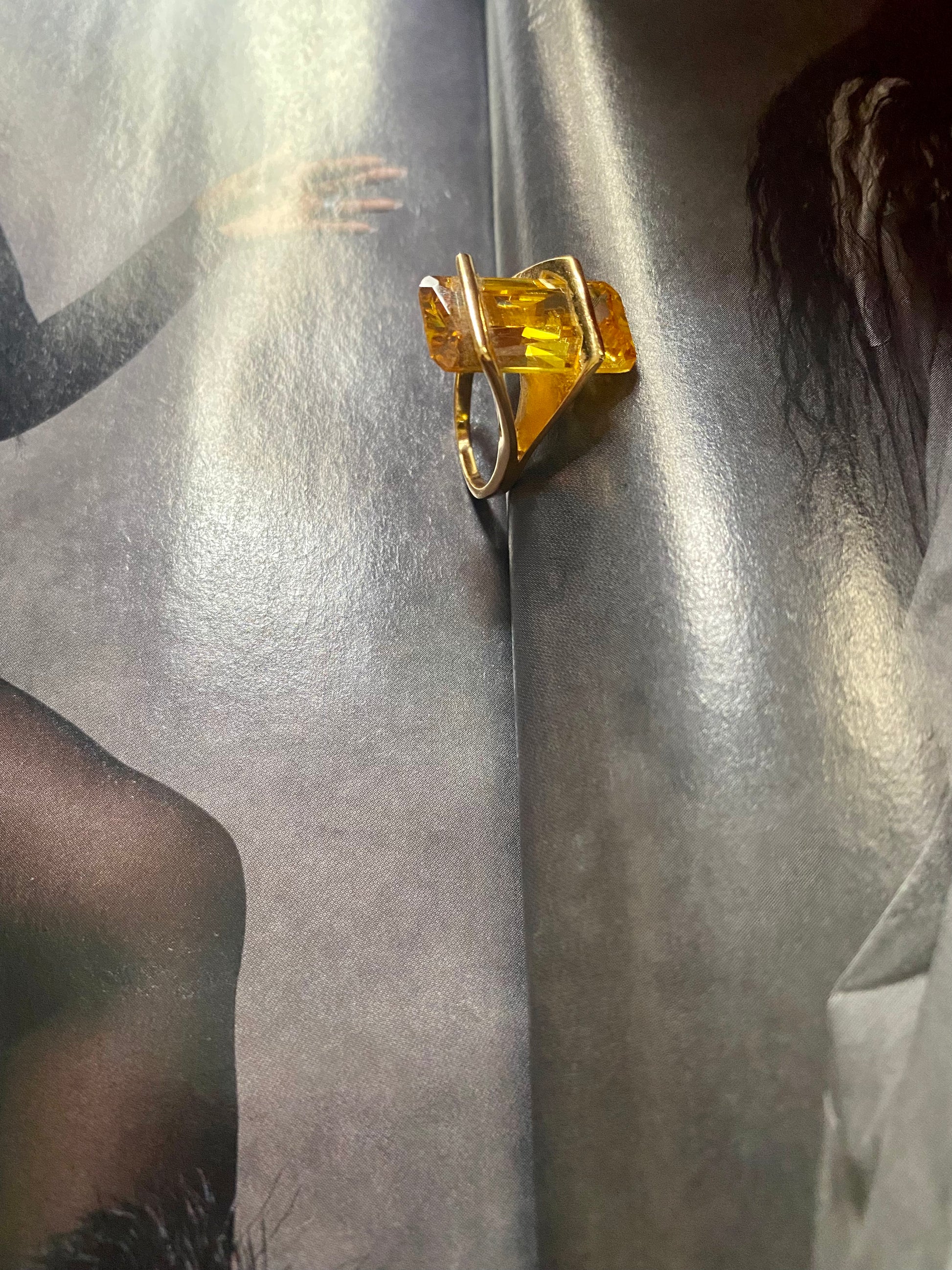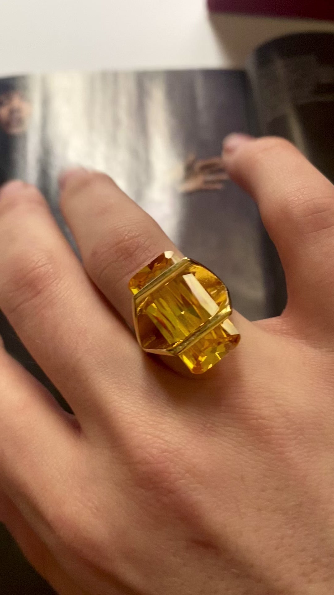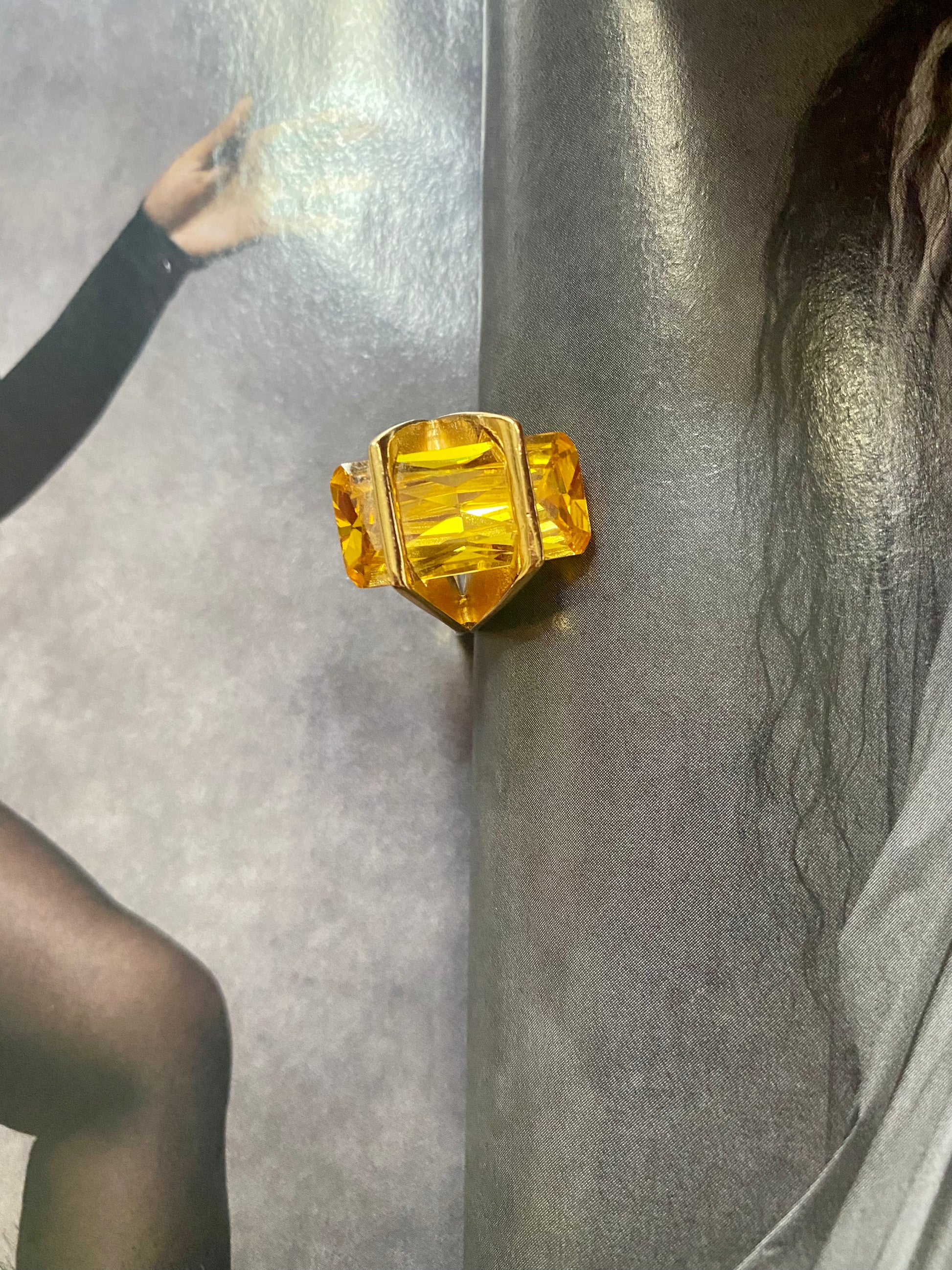 FR/ Bague avec un cristal jaune sublime sur une monture plaqué or.