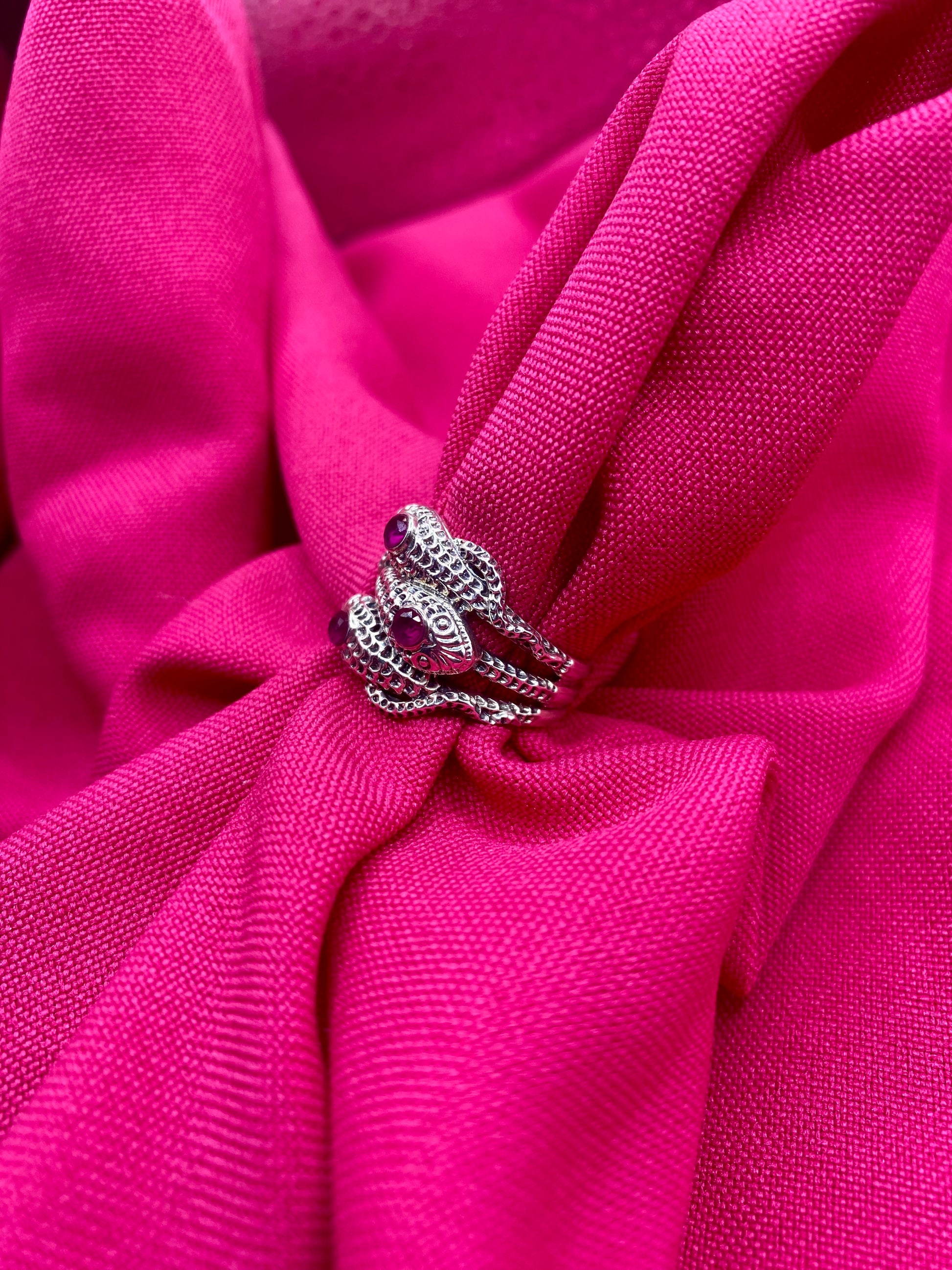 EN/ 925 silver ring with character, made of snakes that intertwine. The snakes are set with pretty fuschia crystals.