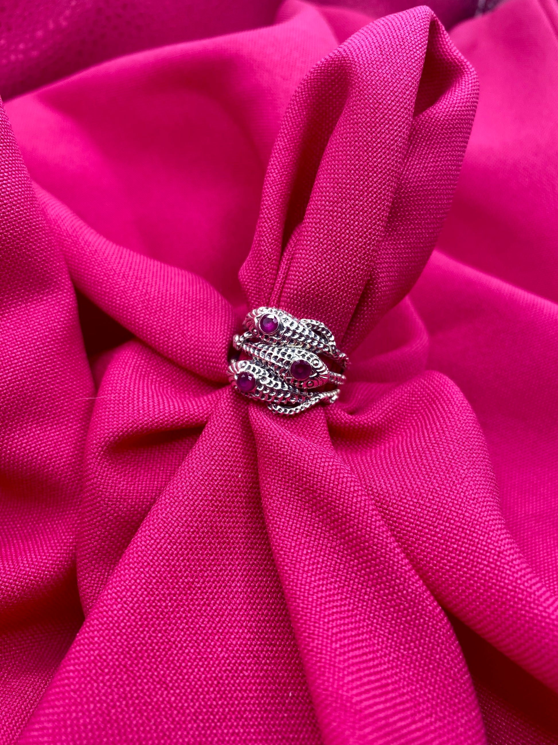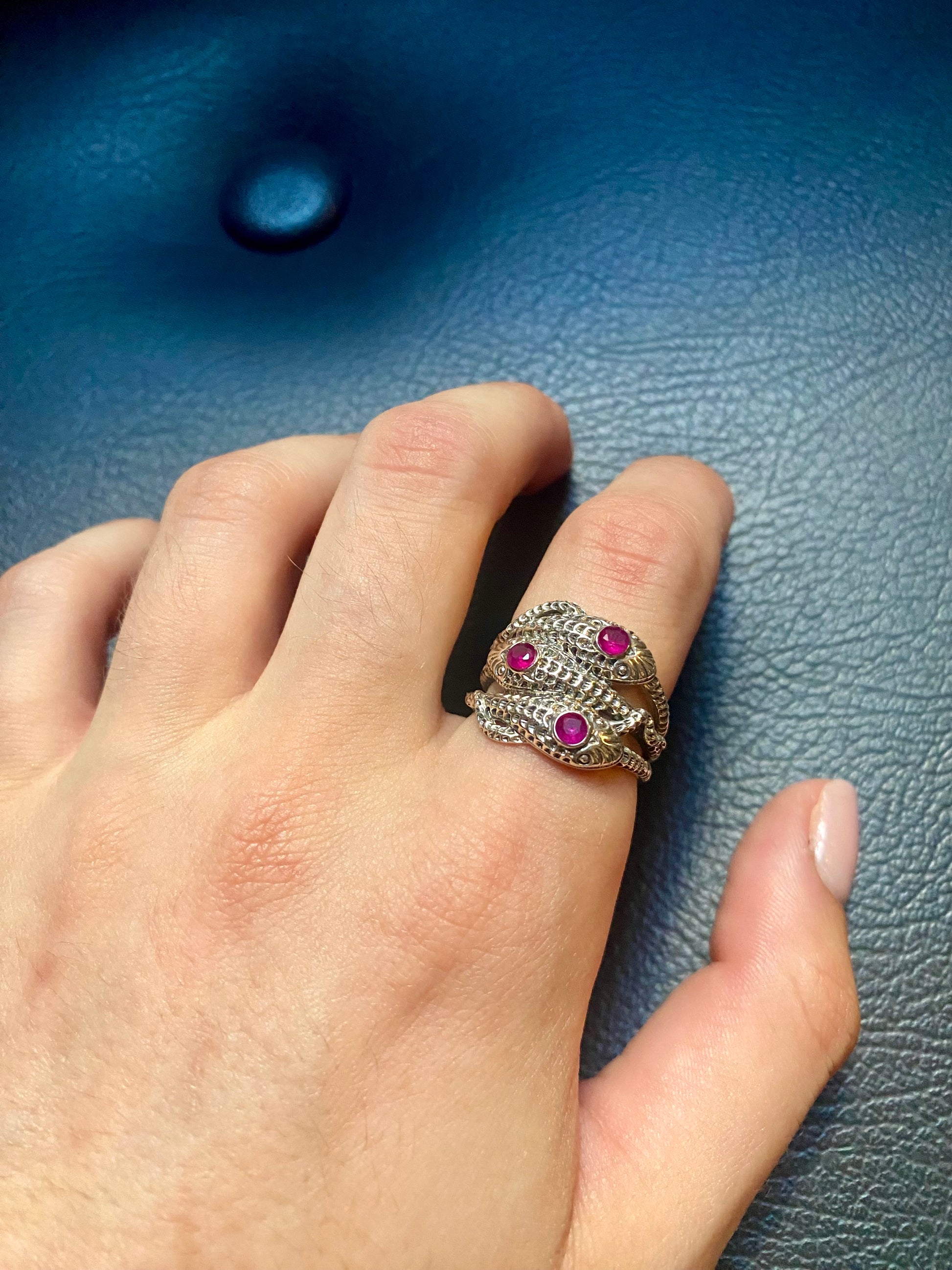 FR/ Bague en argent 925 avec du caractère, faites de serpents qui s’entremêlent. Les serpents sont sertis de jolis cristaux fuschia.