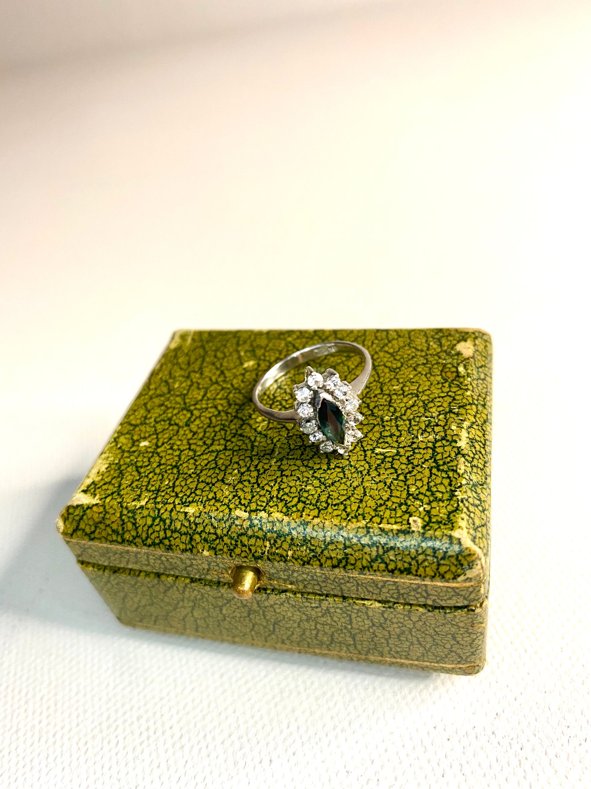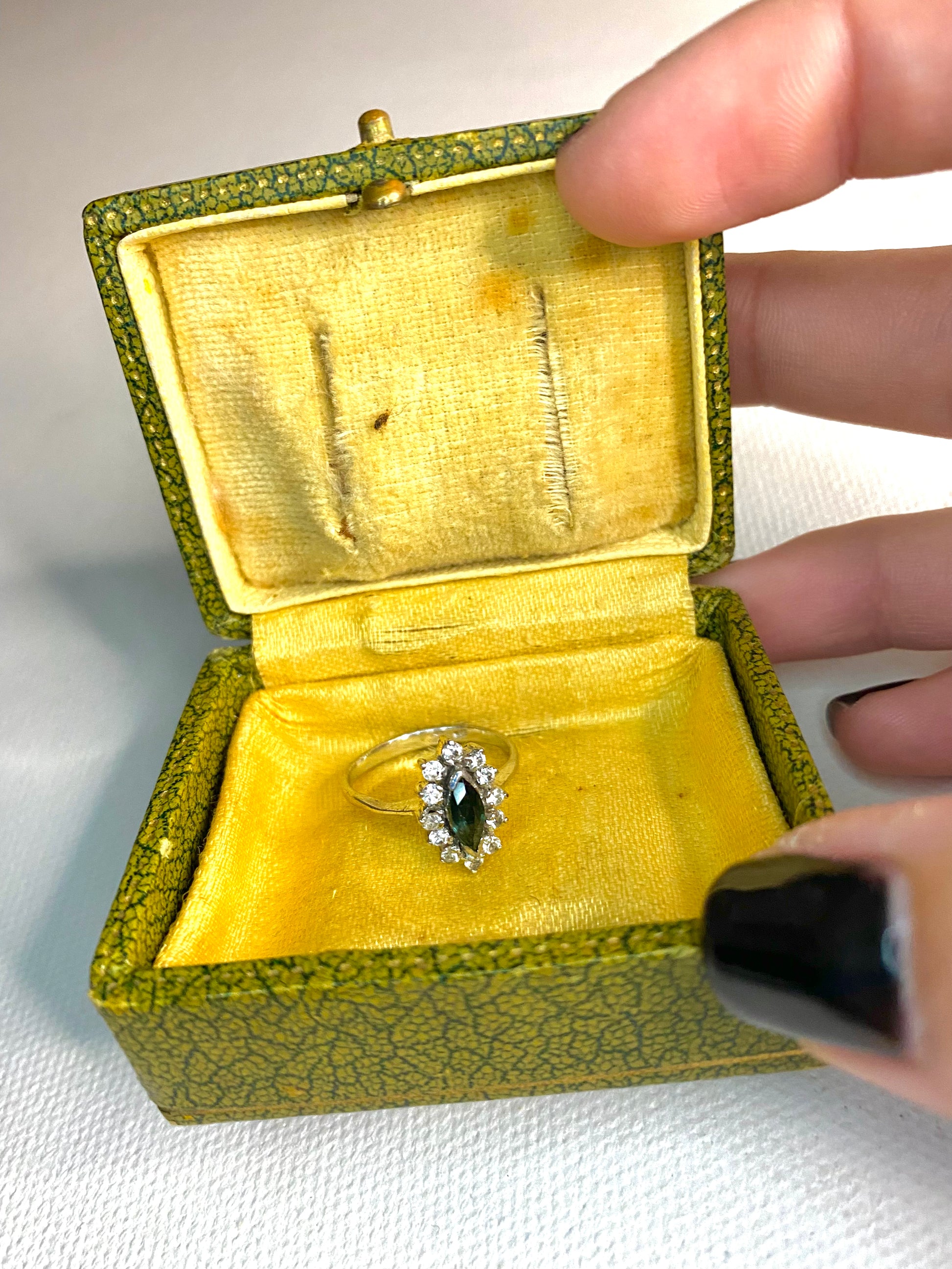 EN/ This marquise ring is made of 925 silver, with a blue/green central stone and zirconias all around. The ring will be sent with the box.