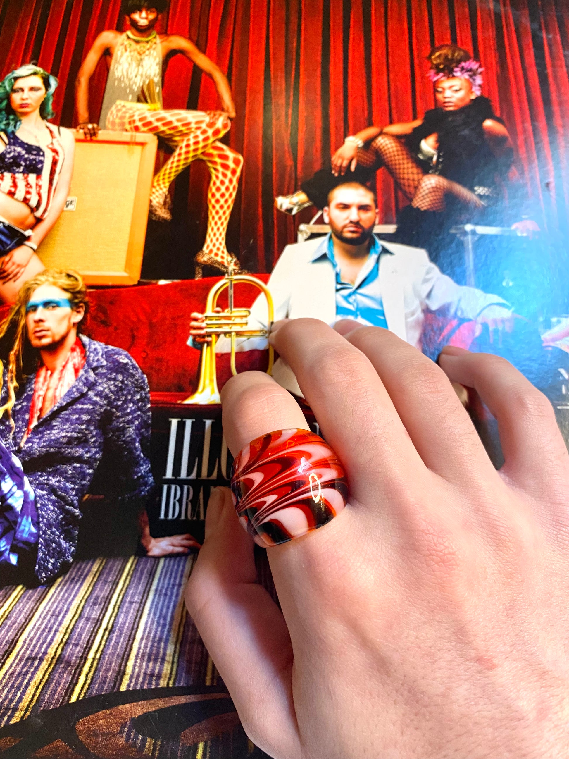 Bague en verre de Murano ! Ce motif 70s mélangé à ce verre travailler d’une manière incroyable rend cette bague iconique !