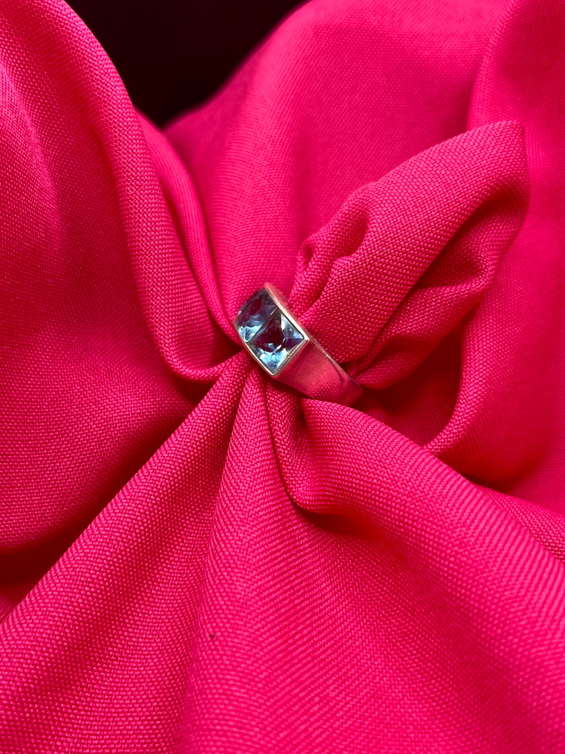 FR/ Bague en argent 925 trois cristaux, d’un très joli bleu clair. Une pièce statement et élégante.