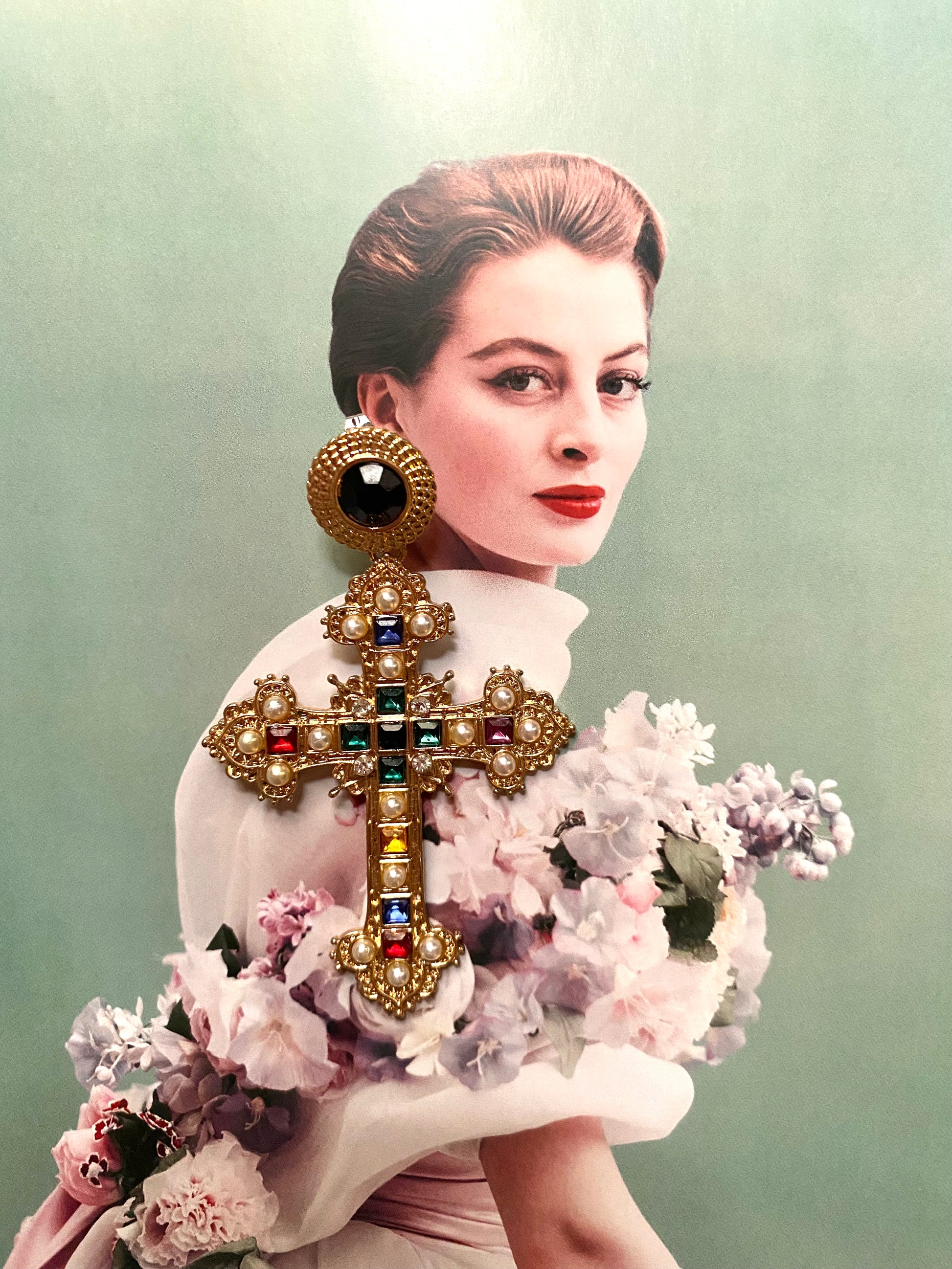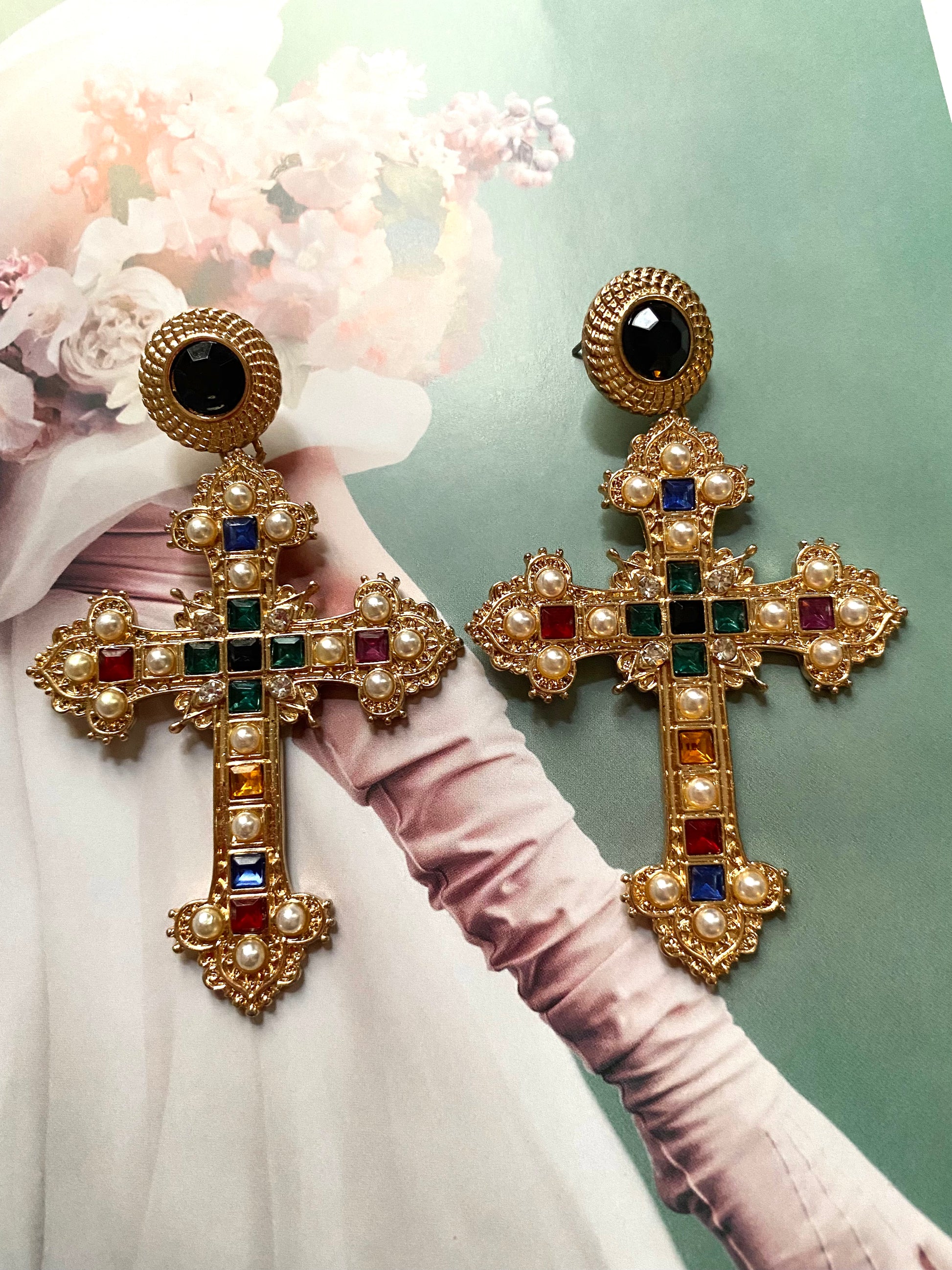 Croix en plaqué or avec des petites pierres colorées et des petites perles.
