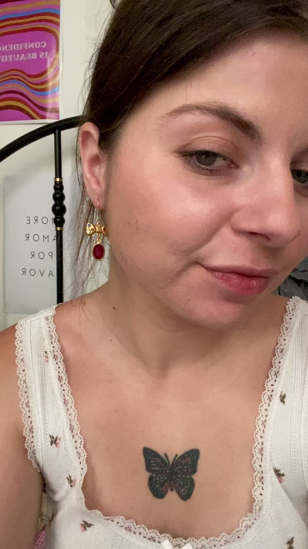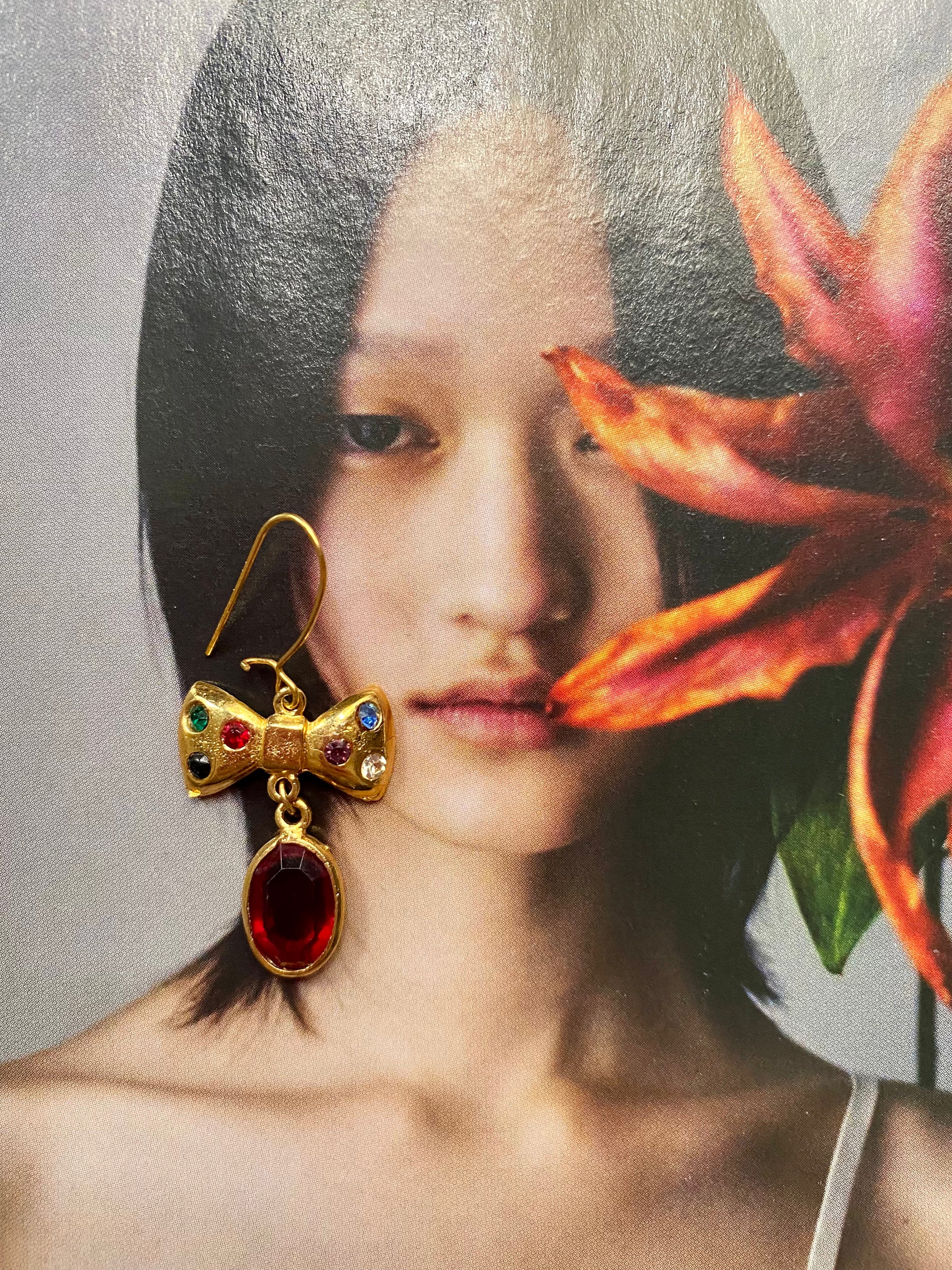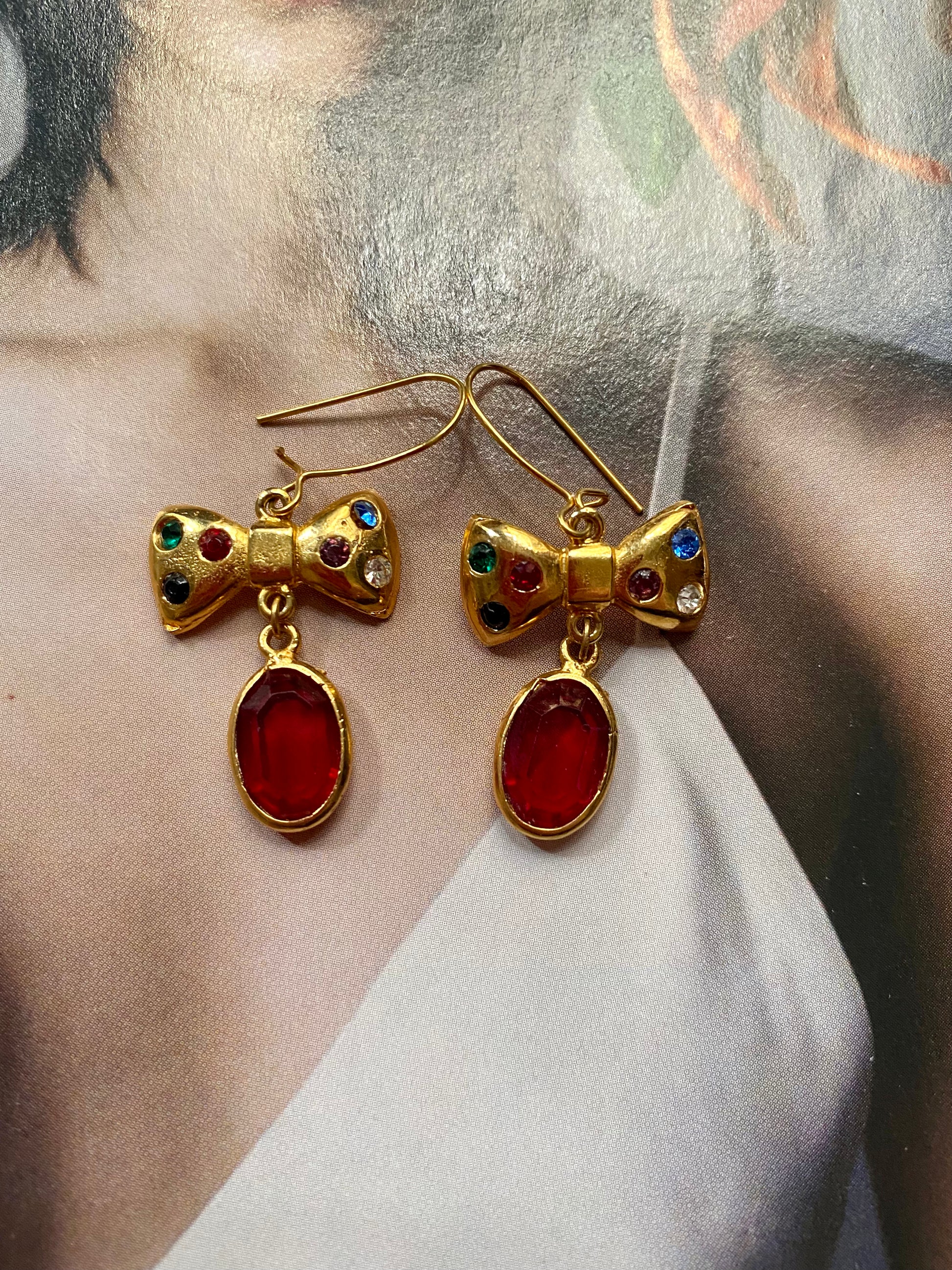 Boucles d’oreilles en plaqué or en forme de petit noeud sertie de zircons de plusieurs couleurs et une petite pierre rouge au bout.
