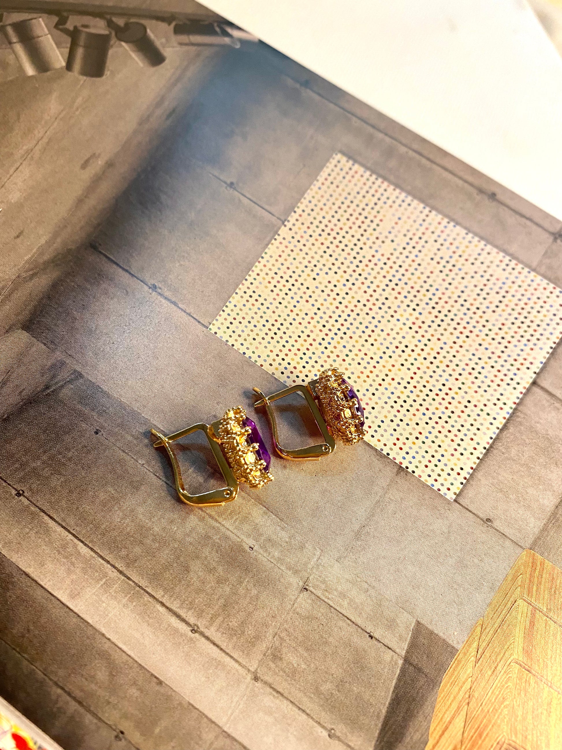 Boucles d’oreilles vintage pour oreilles percées avec une pierre violette au centre et des zircons blancs tout autour.