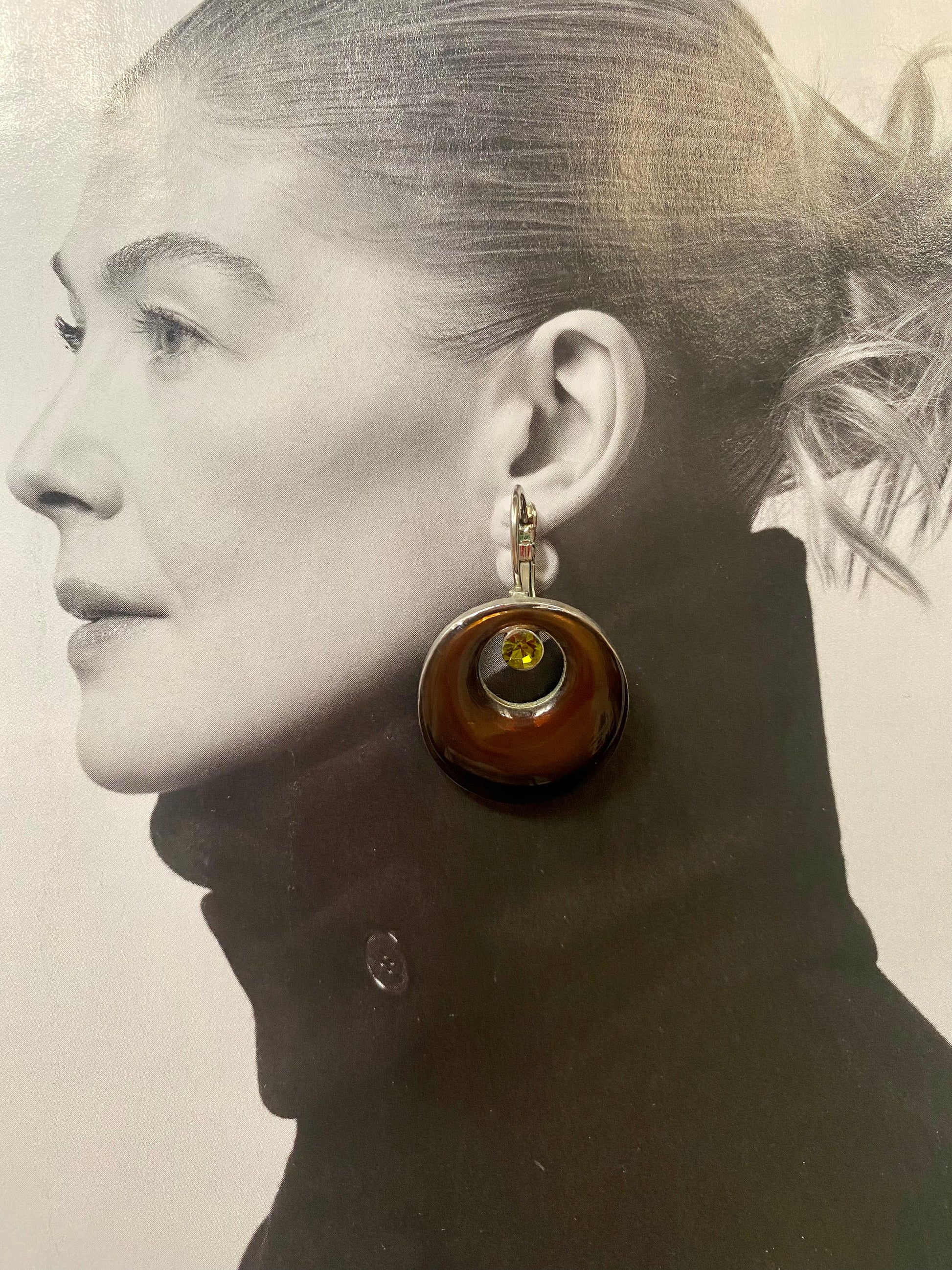 Ces boucles d’oreilles des années 90 sont en plaqué argent, avec une attache ancienne et un émail marron brillant. Il y’a une petite pierre verte sur chaque boucle.