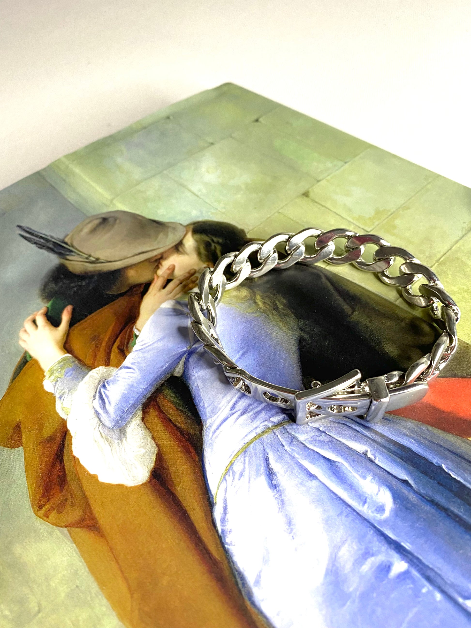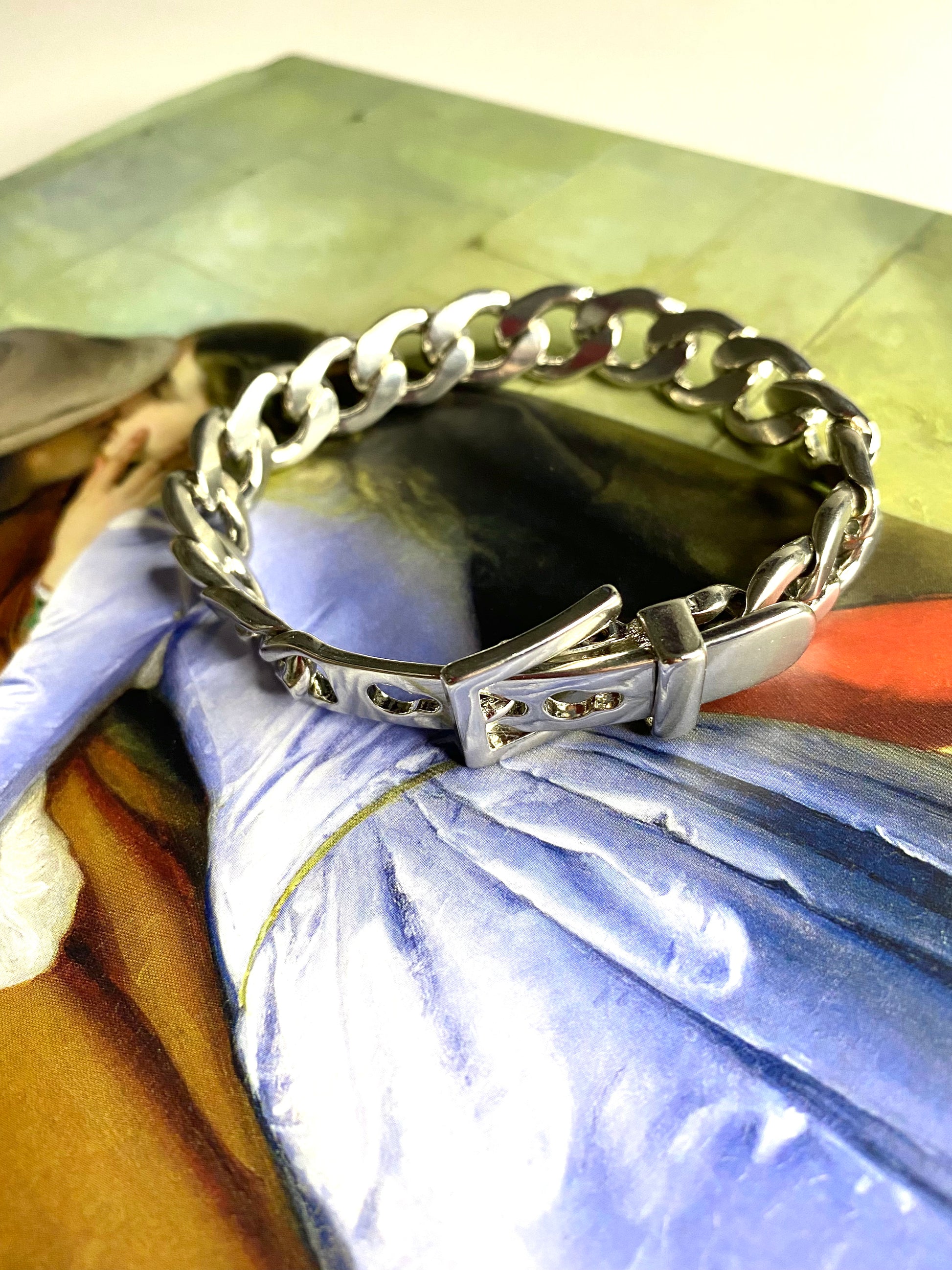 FR/ Chaîne en acier argenté avec un fermoir effet ceinture.