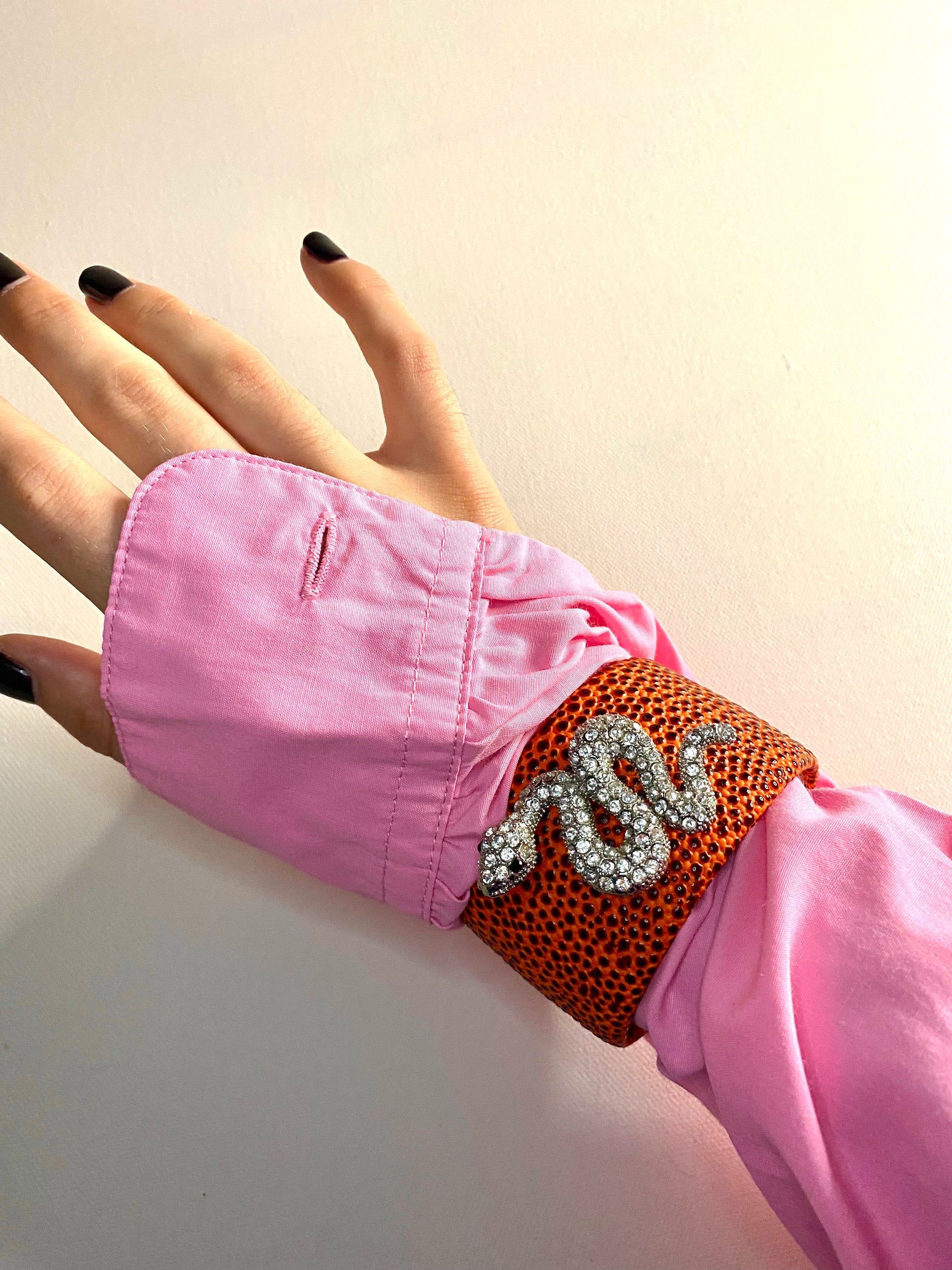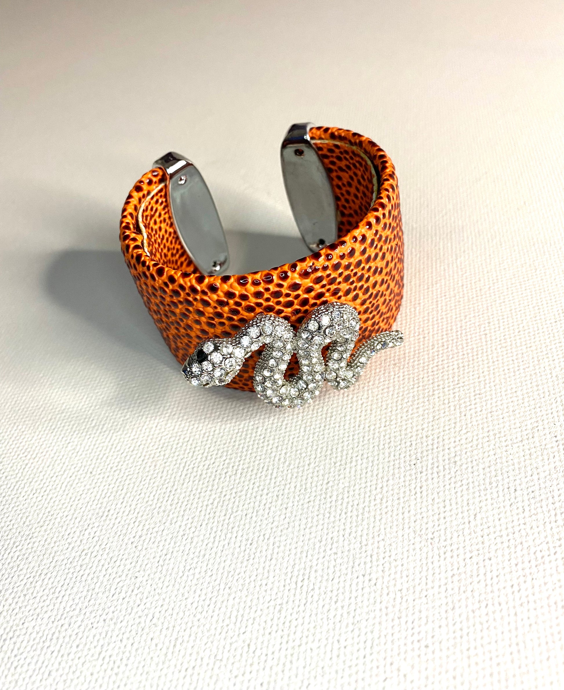 FR/Ce bracelet en similicuir orange avec des points marrons en reliefs est rigide mais ajustable au poignet, avec un serpent en métal argenté avec des zircons et les yeux en cristaux noirs.