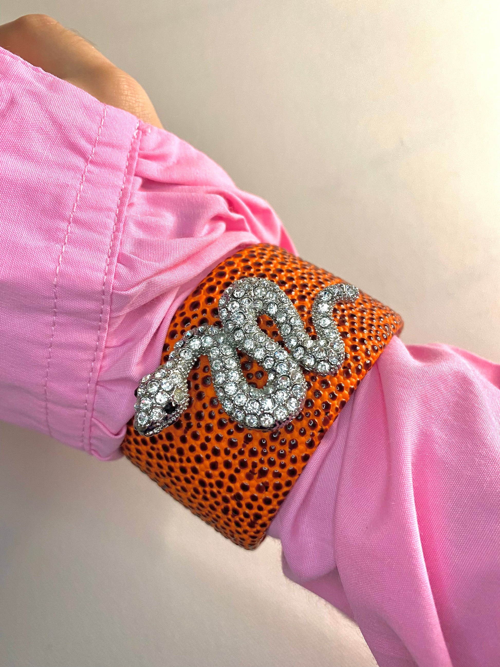EN/This orange faux leather bracelet with embossed brown dots is rigid but adjustable on the wrist, with a silver metal snake with zircons and black crystal eyes.